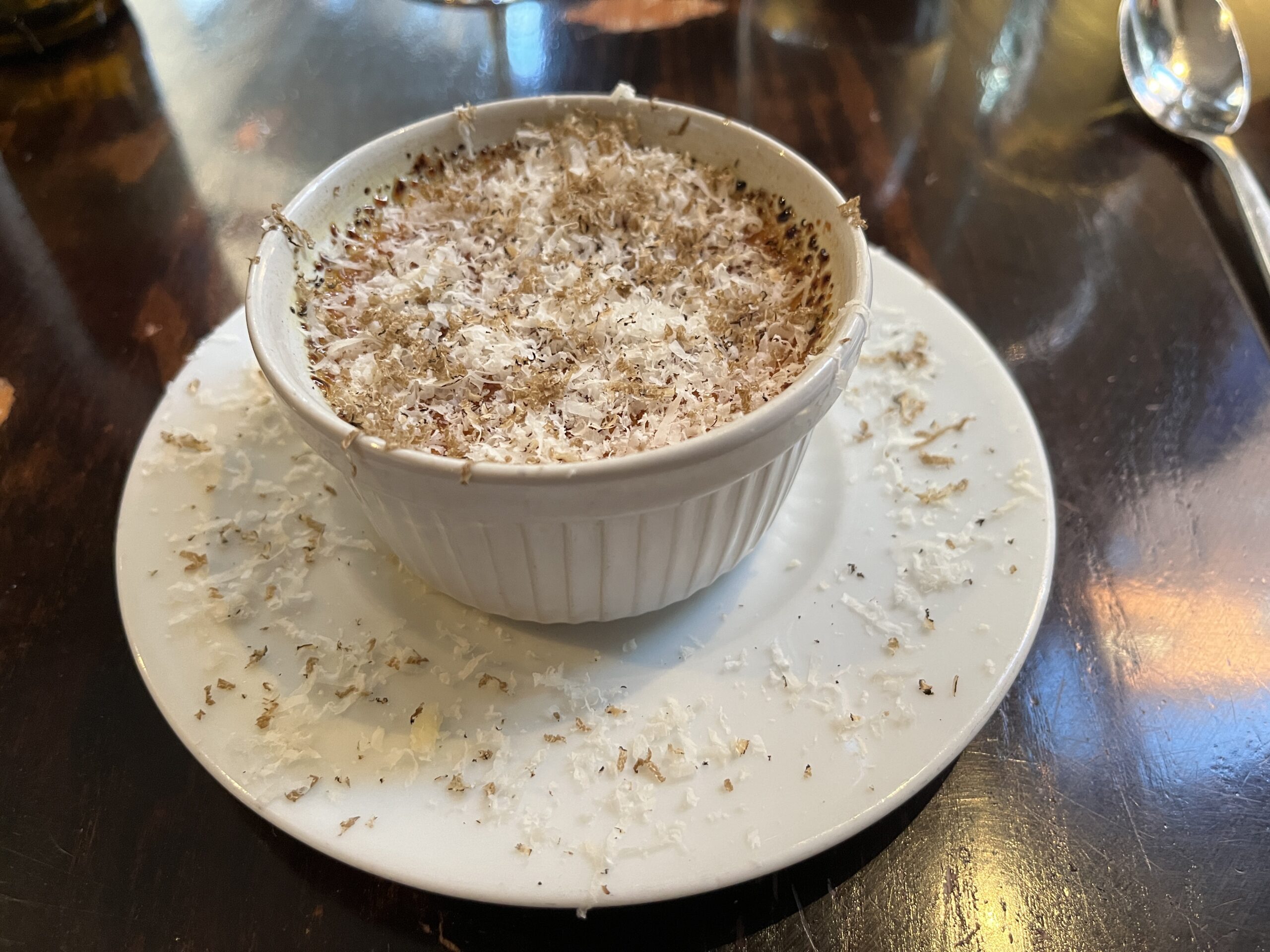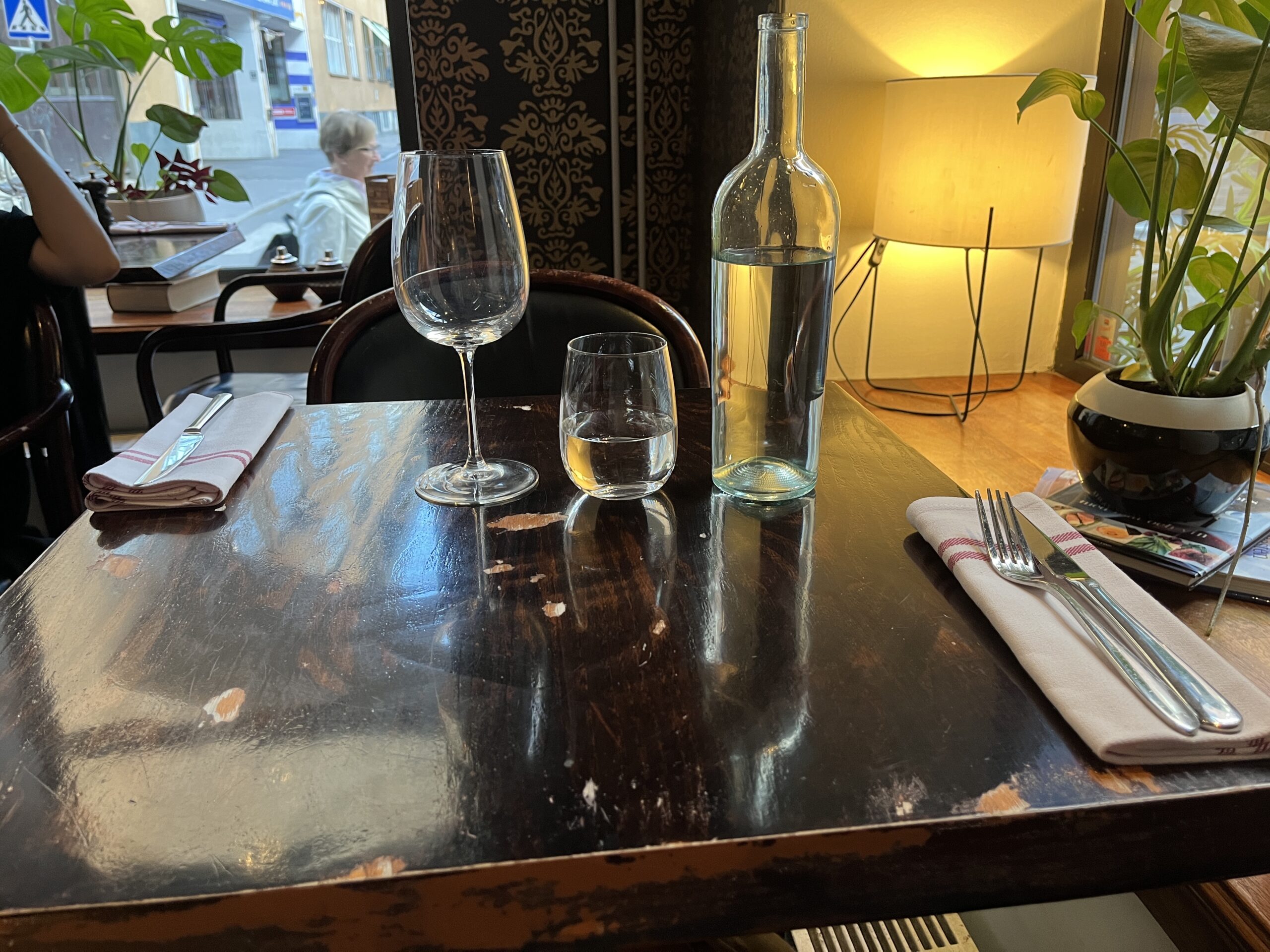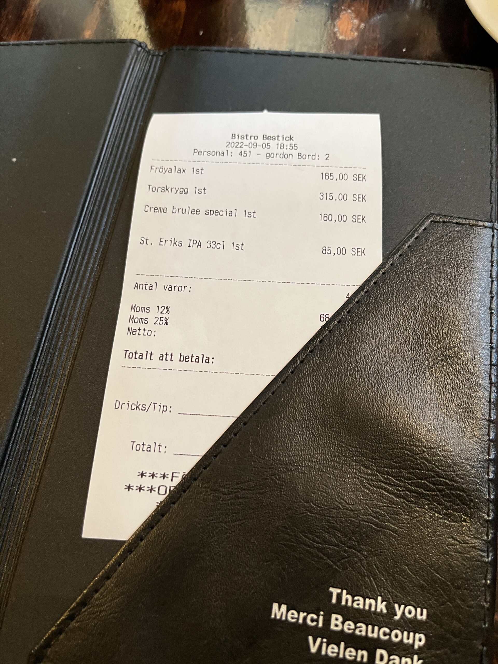 Back in Sweden and time for something new. Google showed up Bistro Bestick because it’s near my hotel (and has good reviews). I reserved a table for one person (people who arrived after me without a reservation had to settle for outside seating). The decor looks like a bistro, a bit worn and not fancy. I had three different dishes here. The starter was salmon with pickled onions, sour cream, and potatoes. The main course was cod. Dessert was a creme brulee with Parmesan and truffles (it could have used a bit more Parmesan to provide a salty contrast). Overall, though, it was very good.