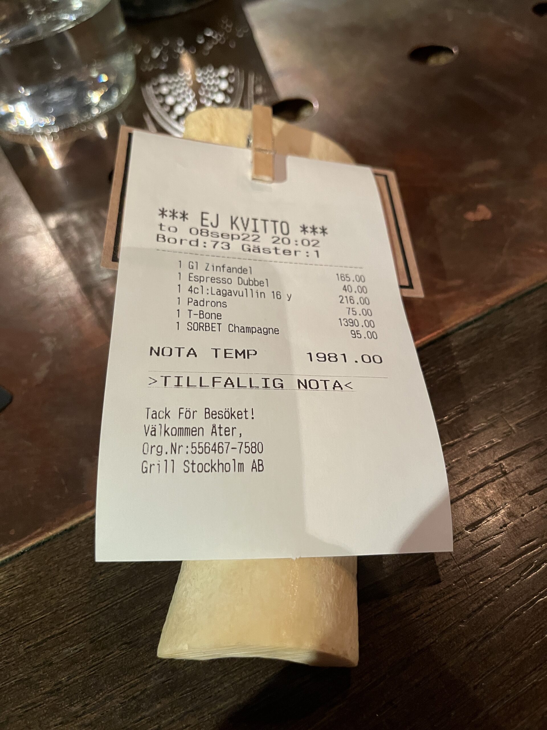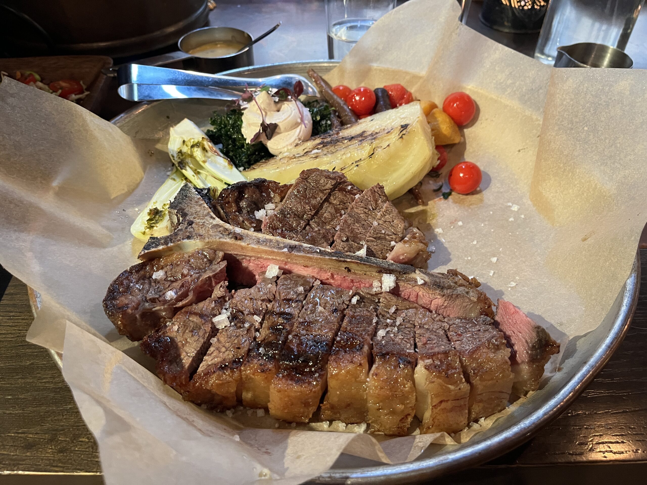 Köttmastarn is one of two restaurant in Stockholm I’ve visited twice. And I’m a total bore, so I had the T-bone again. Okay, the sides were a bit different, and I also had the pimentos as a starter and swapped dessert for the sorbet with champagne. Once again, the meat was excellent, as was the entire service. The table next to me was quite astonished by my large steak. The presentation was a little different this time. The T-bone was brought separately and shared at the table with a bit of a show. Anyone who wants a great steak in Stockholm has definitely come to the right place.