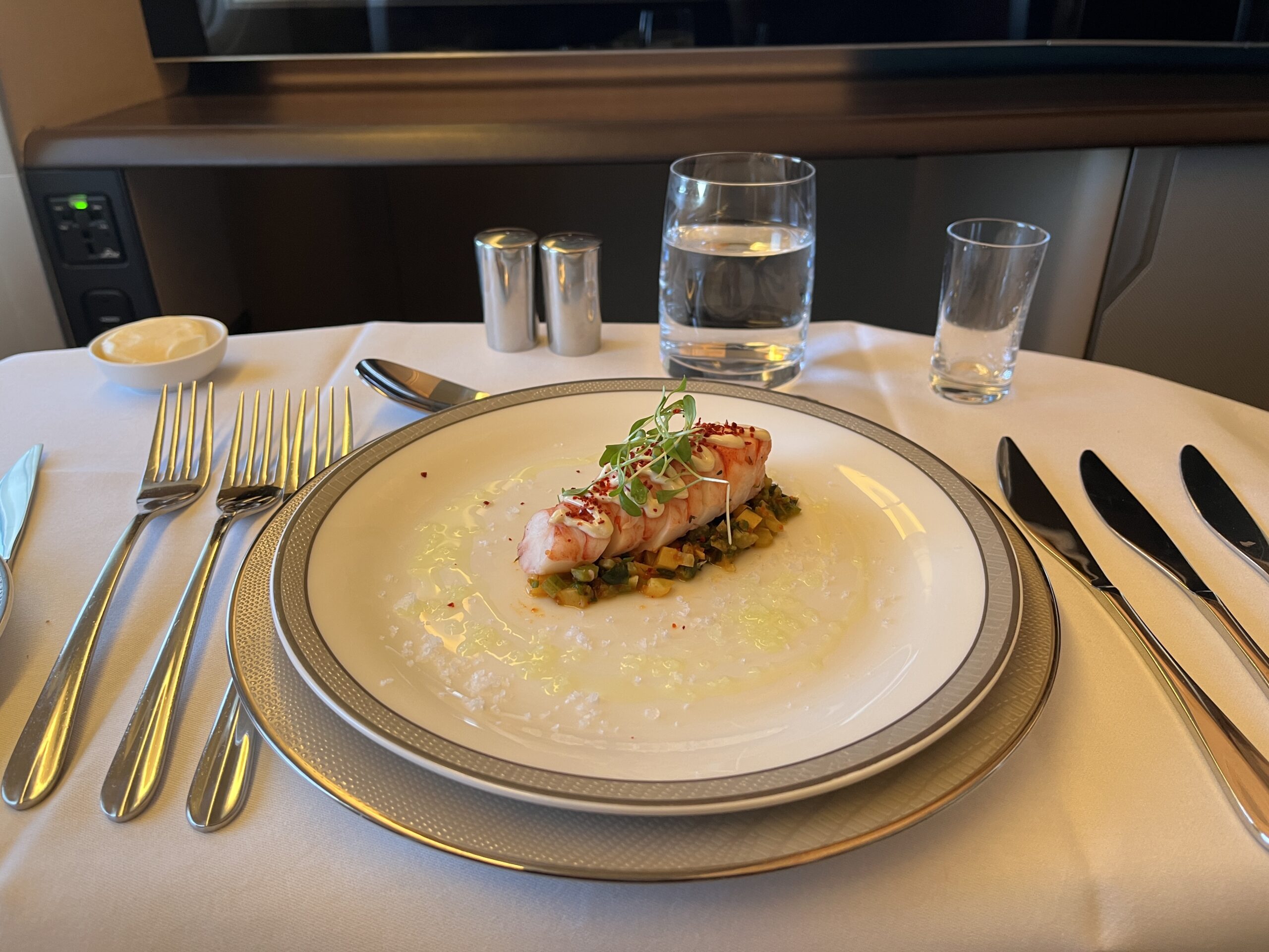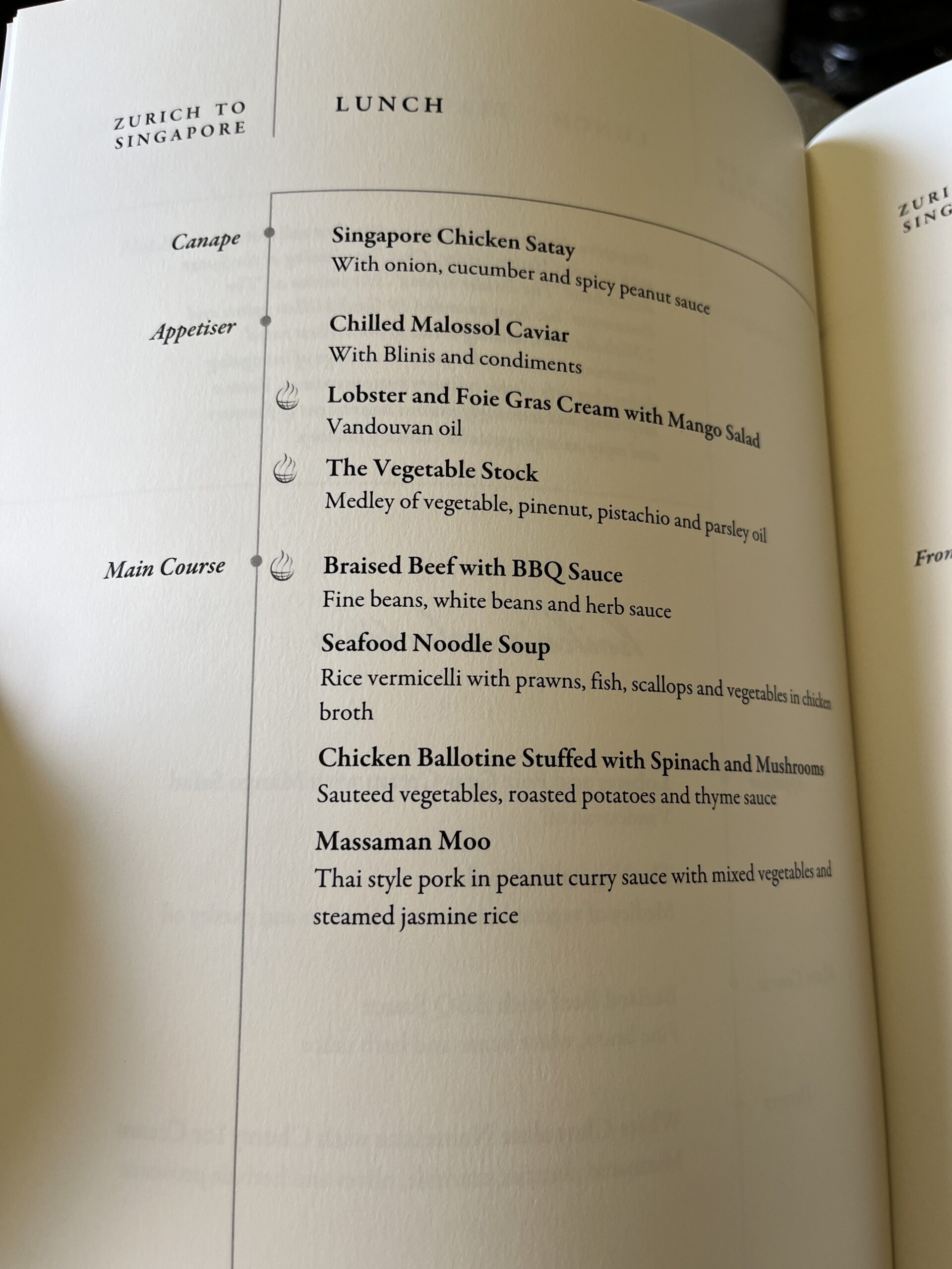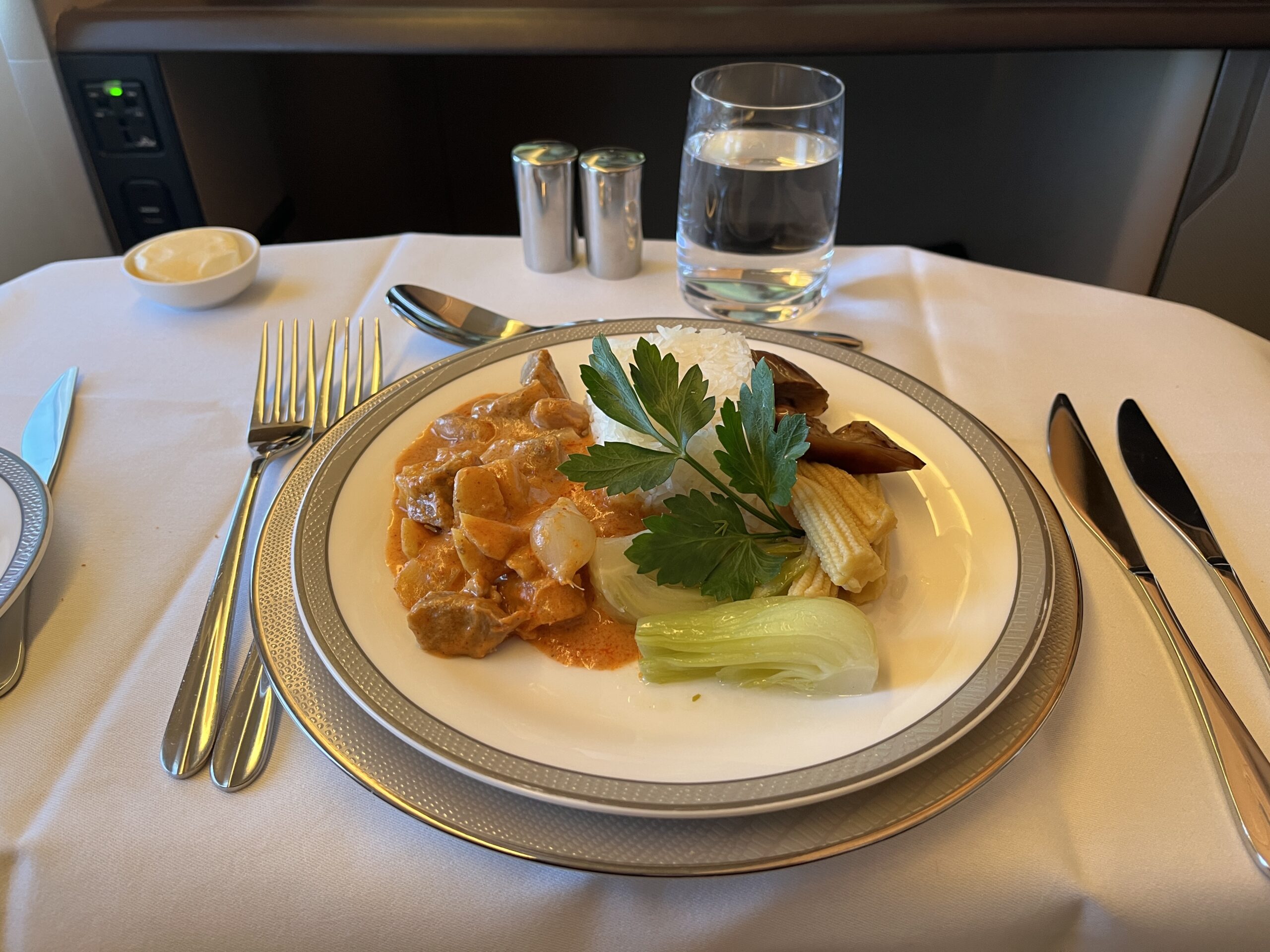 OK, we continued on with Singapore Airlines to Singapore, but this time in First Class ;). At the check-in counter, we were given another ticket, this time from Singapore (okay, the same ticket three times). On board, the usual question: Krug or Dom (and of course, I always go for Krug). Since the beginning of August, the mask requirement has also been lifted on Singapore (at least for guests). After boarding, service started pretty quickly. To start, there was a Singapore Sling and the Satte skewers with peanut sauce. Then you could choose from the extensive menu (both routes are already listed here). To start, there was Caviar, and the second appetizer was Lobster. For the main course, there was Thai curry, and for dessert, a banana split with ice cream. To help with digestion, I had a MacAllen. After that, my bed was made, and I had a good night’s sleep. I woke up three hours before landing and was asked what I wanted for breakfast. There was fruit, yogurt, and scrambled eggs with bacon. MatreeDeCabine then wrote me a few tips for Kuala Lumpur (he was from there).