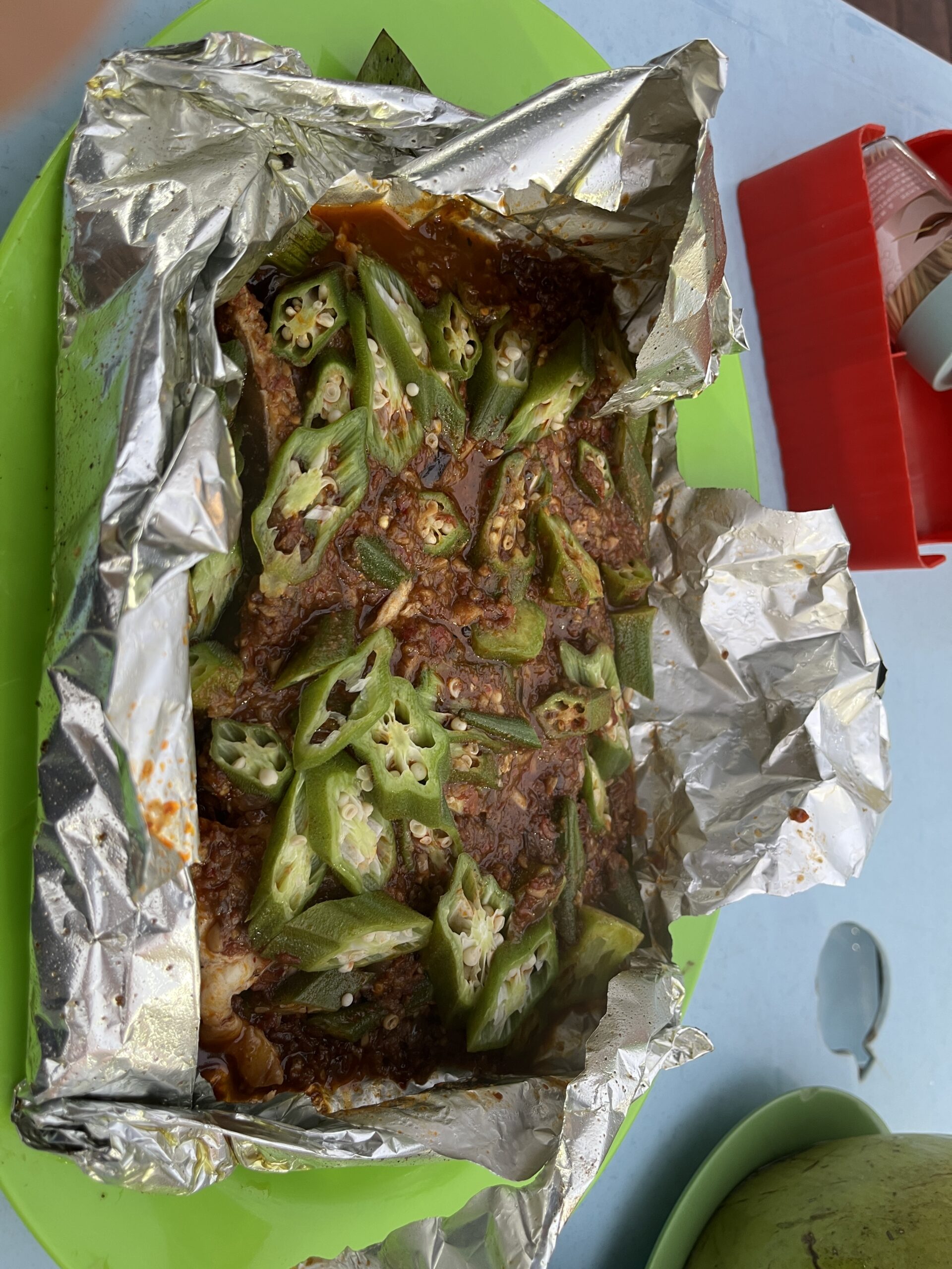 I had actually planned something new, but unfortunately, I couldn’t find the restaurant. Due to time constraints (lunch break), I decided to repeat the experience. I even ate almost the same thing. This time, however, I had the stingray fish Portuguese style (steamed in foil) instead of grilled. The fish was actually quite tasty. Only the cut I used was a bit annoying because of the bones. Another not-so-ideal approach is steaming okra (it always creates a slime-like texture). I also had a vegetable (no idea what it was) and a coconut. All in all, it was once again very tasty.