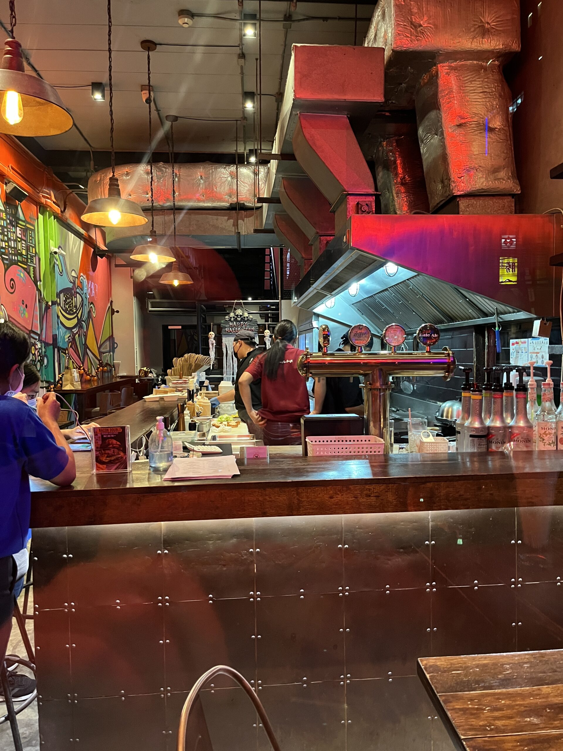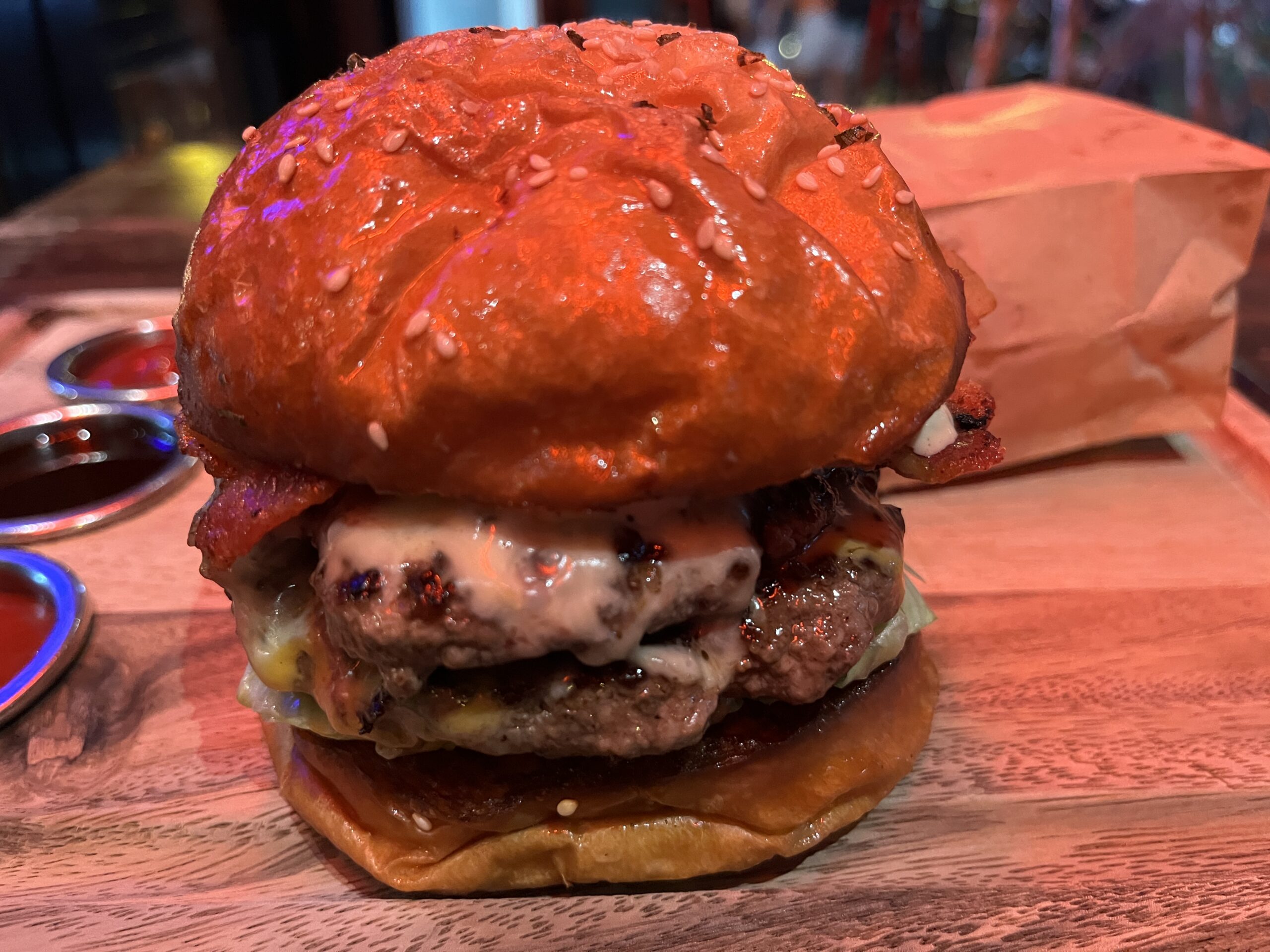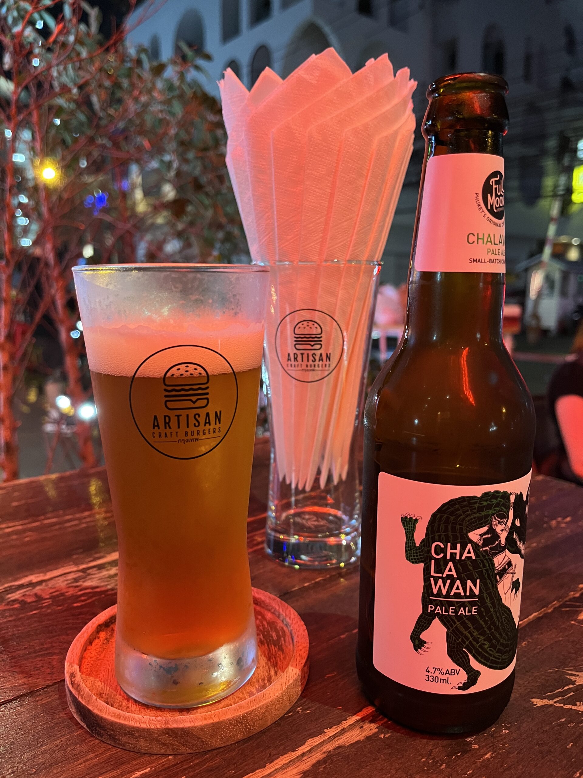 I was kind of in the mood for a burger and fries, and since there are practically three burger joints next to each other on this street, I decided to go with the oldest, the Artisan. The restaurant is a long, smart one where you can almost always see what’s happening while the food is cooking. There are various burger varieties to choose from (including a Beyond Meat, but who wants that anyway). The current special was a double bacon burger, and I opted for it. Unfortunately, you couldn’t choose your own sauce (but you could at least swap one out). The fries were good (crispy and well-salted), the burger was great, very juicy, but unfortunately practically impossible to eat without making a mess :D. They also had an IPA.