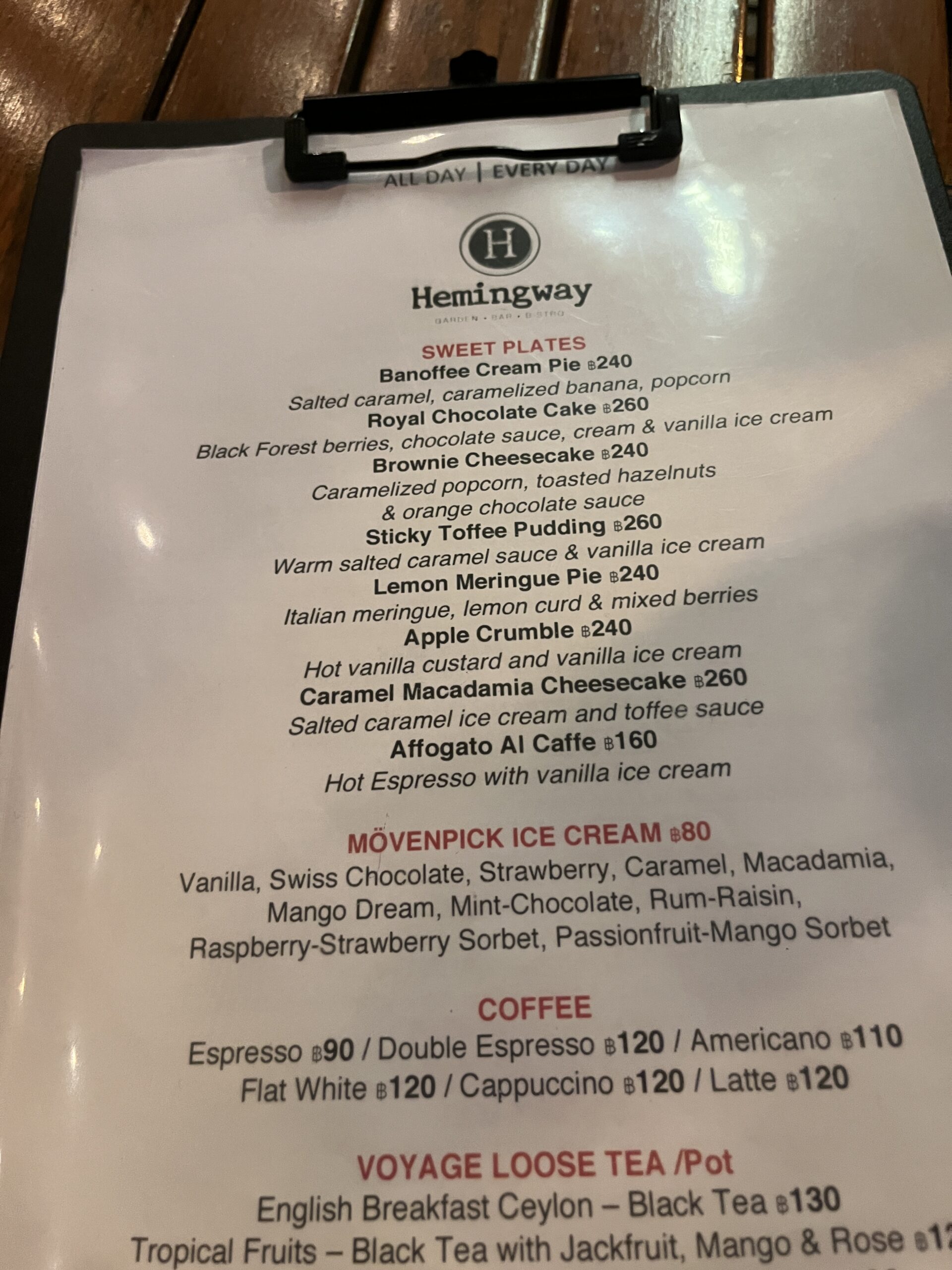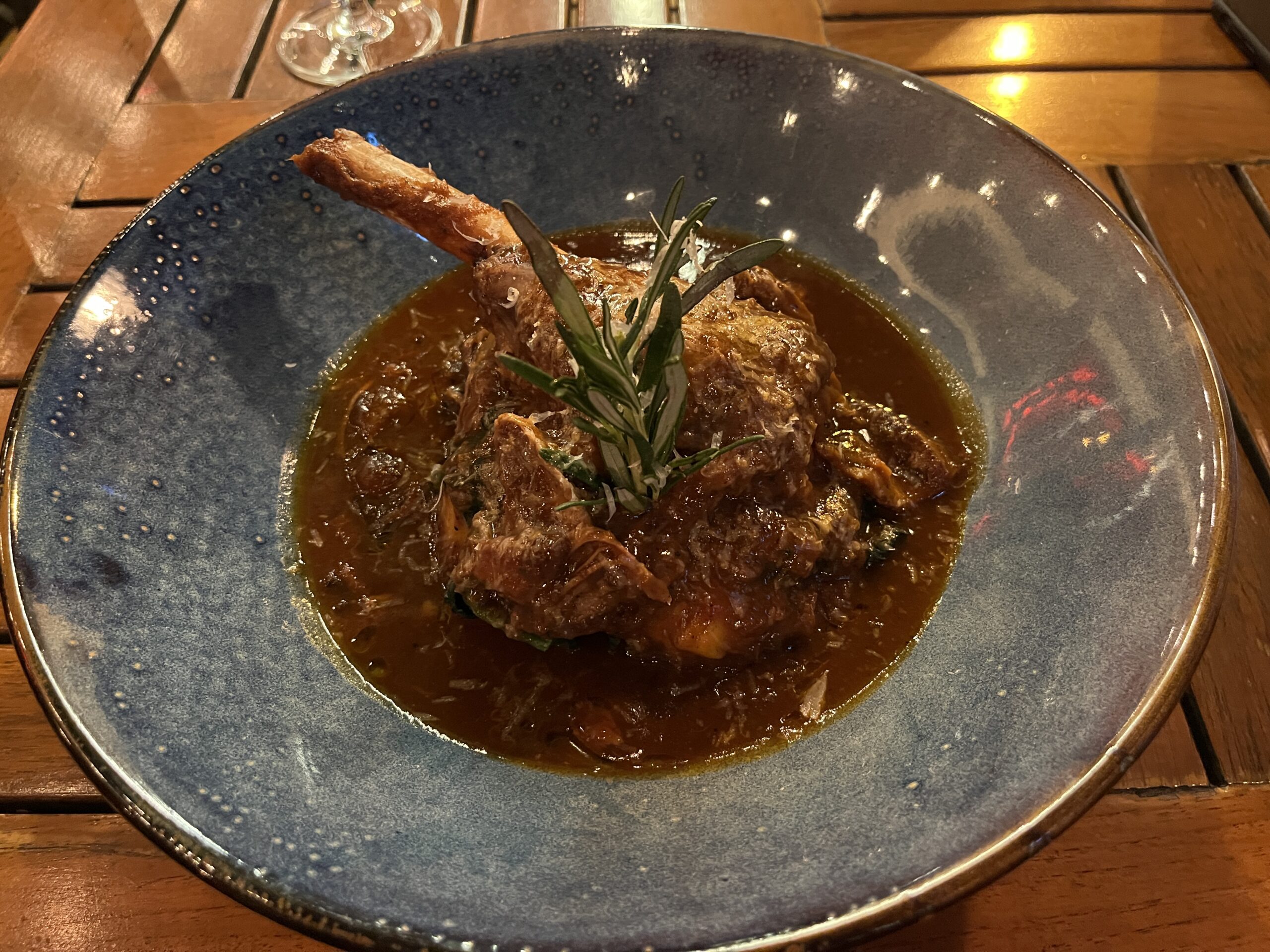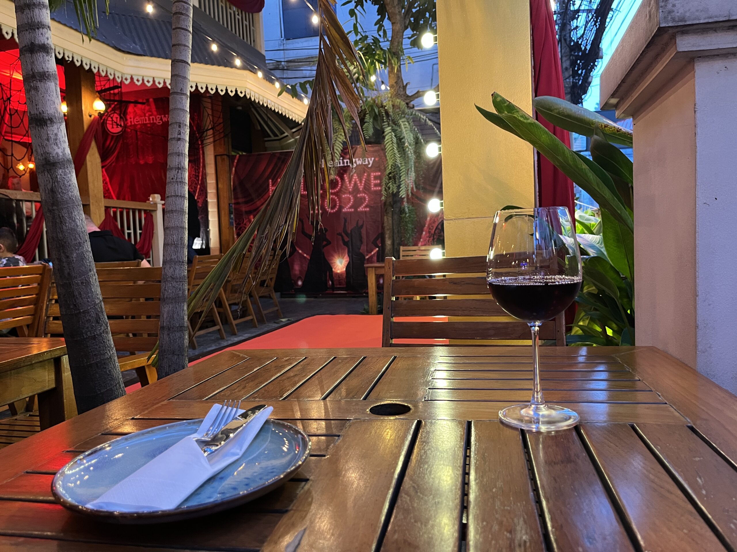 This time it was time for something new again: Hemingway’s. The restaurant is practically in front of the Mercury Hotel, so it would also be a good rainy option ;). The restaurant has two floors and a fairly large outdoor area. The interior isn’t really air-conditioned, as the front is completely open to the outside. I ordered burrata, lamb shank, and another pudding with ice cream. The burrata with tomatoes lacked a bit of creaminess (but it was still good). The lamb shank was great (low and slow); the meat just fell apart. The whole thing was served on mashed potatoes and spinach (you can’t really tell from the pictures). Dessert was also delicious (although I preferred the cheesecake, which was unfortunately sold out). They also had the house wine (recommendation, since it was happy hour). All in all, very good and perfect if you’re in the mood for something more local.