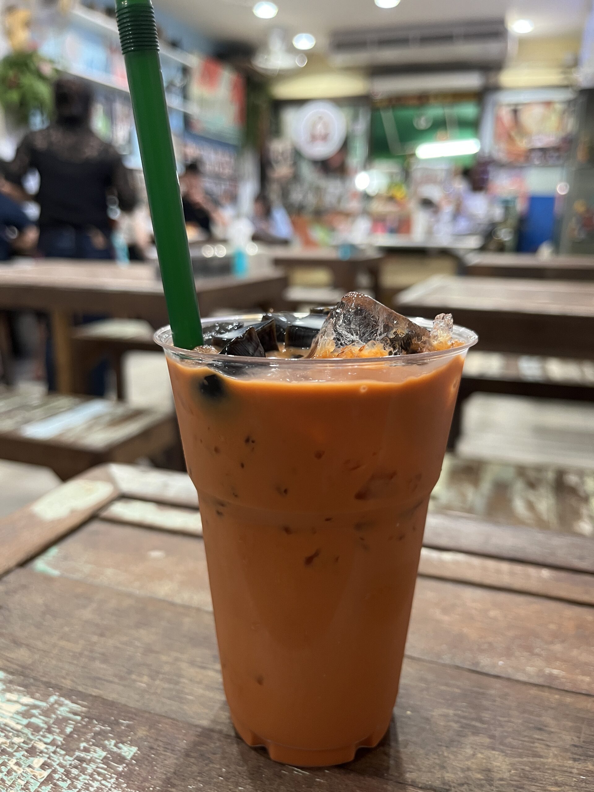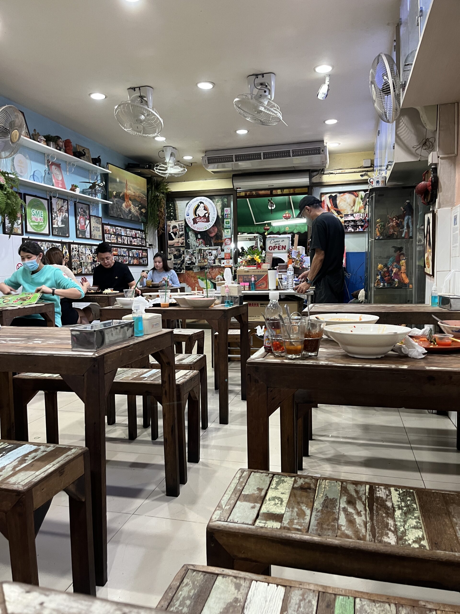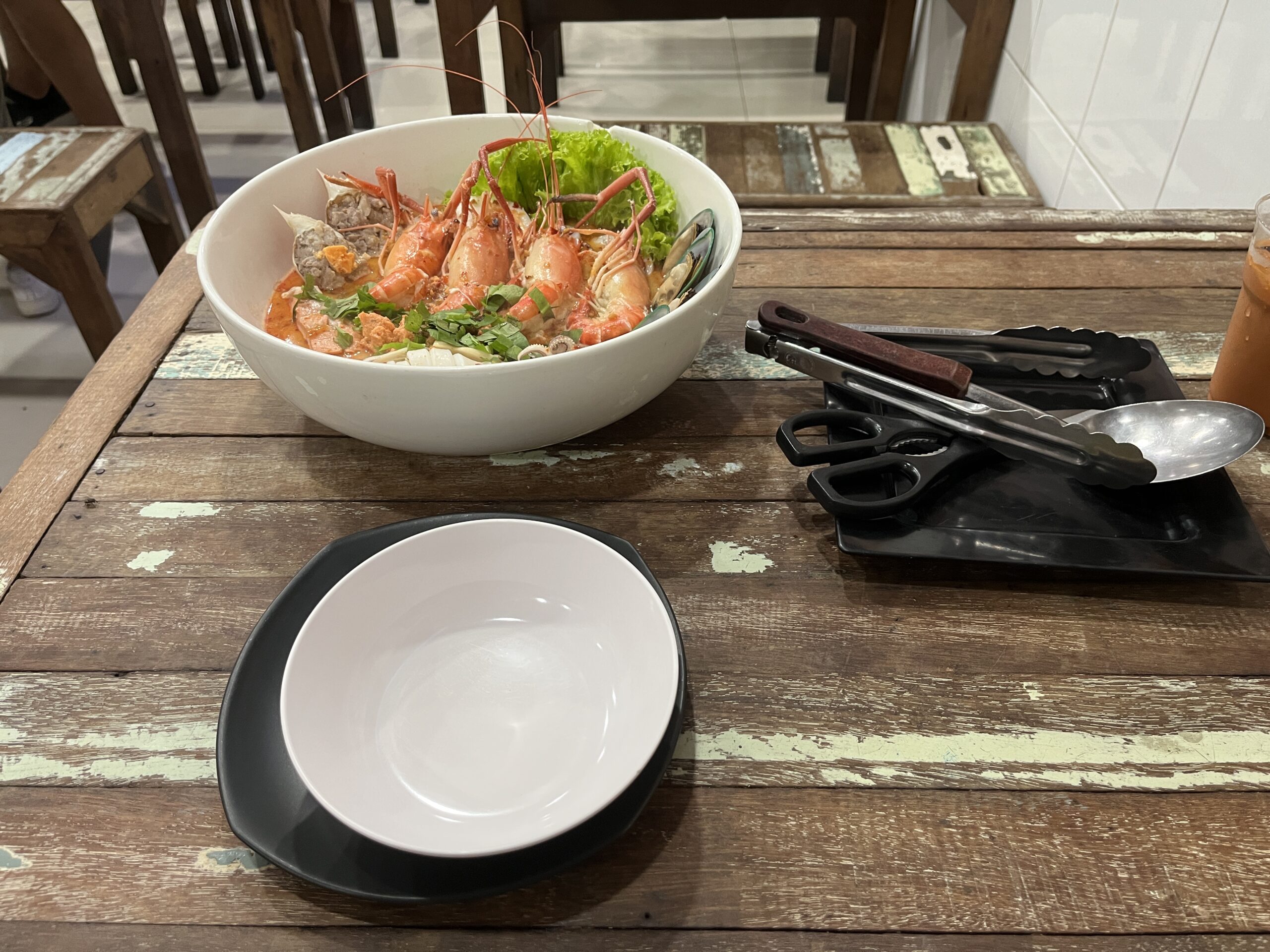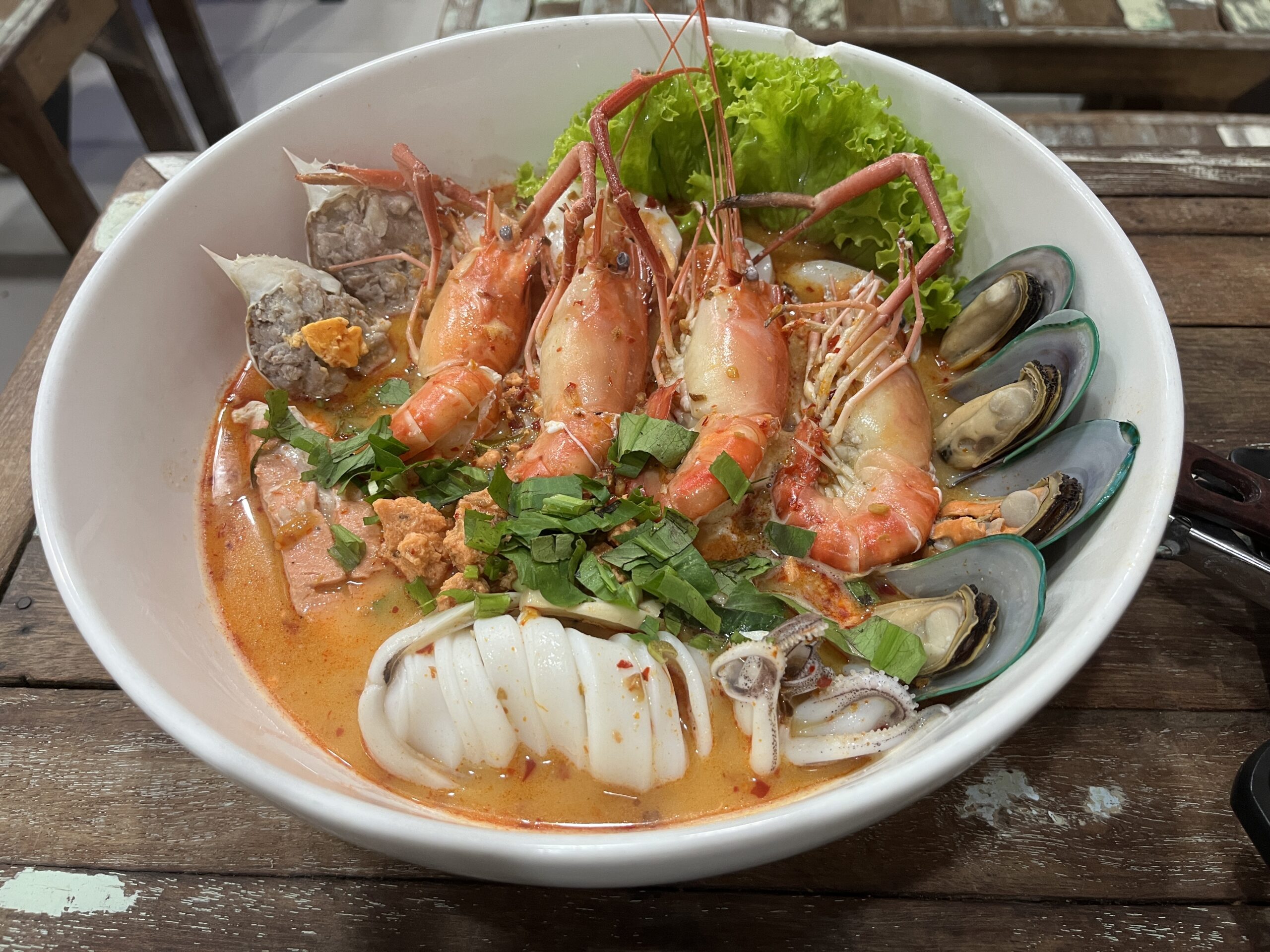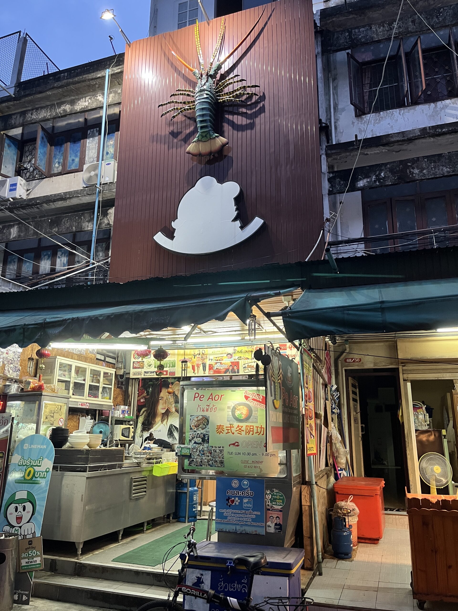 Tom Yum Gong is one of my favorite dishes in Thailand, so if you google ‘best tom yum goong bangkok’ you inevitably come up with Pe Aor. So my expectations are naturally quite high. Unfortunately I have to say that these are not really met. The soup is basically strained, meaning there are no ingredients (tomatoes, mushrooms, roots, kefir…) in it, which is a shame and doesn’t really add to the flavor. The whole thing relies more on the ingredients, such as lobster or river prawns. But it’s still a rather mediocre Tom Yum Goong (oh yes, salmon doesn’t belong in this at all, as it is one thing above all else: hard and dry 🤷), which I even had to add more spice. This doesn’t detract from the success of the establishment; when I left there was a queue of guests waiting.