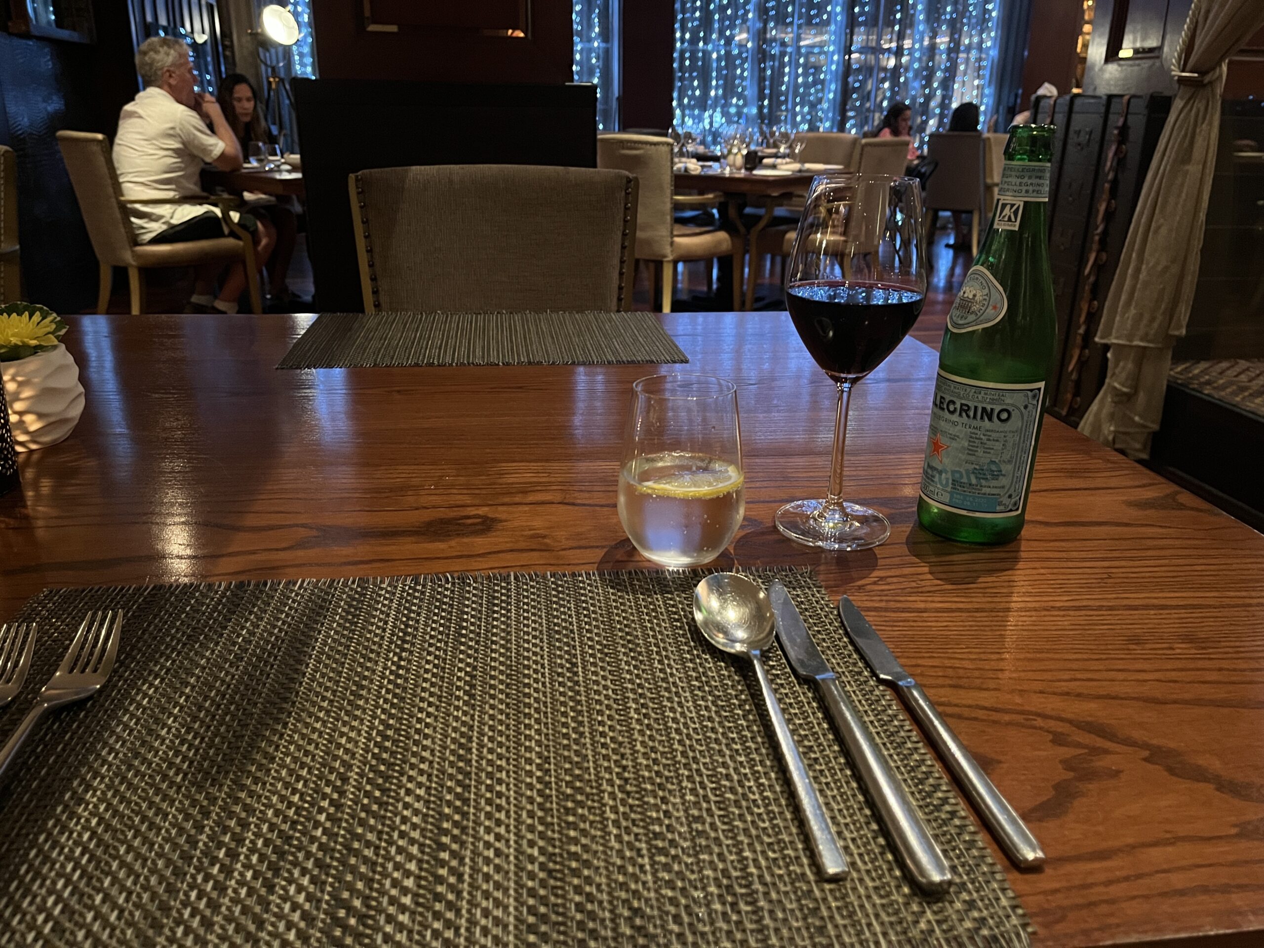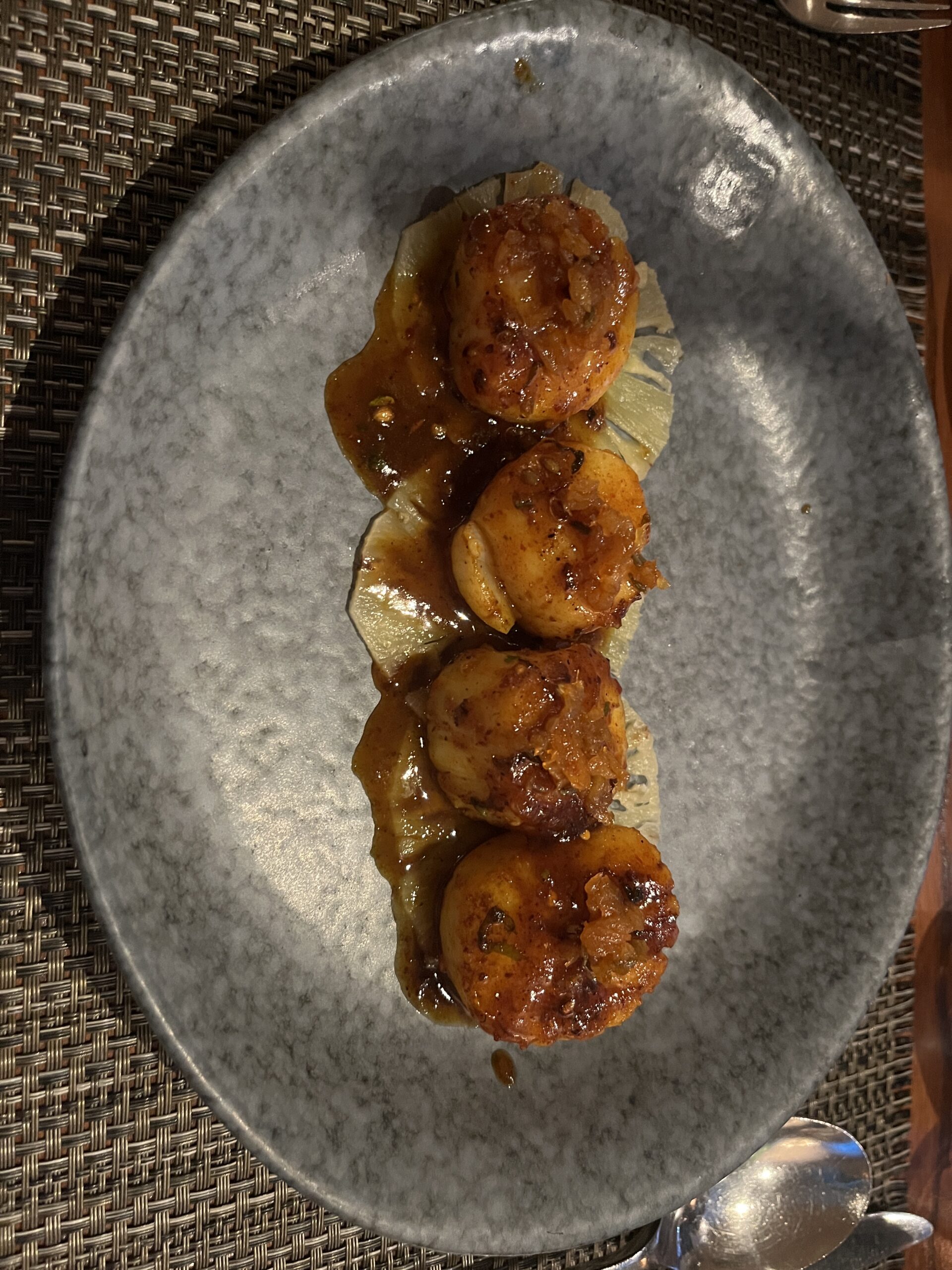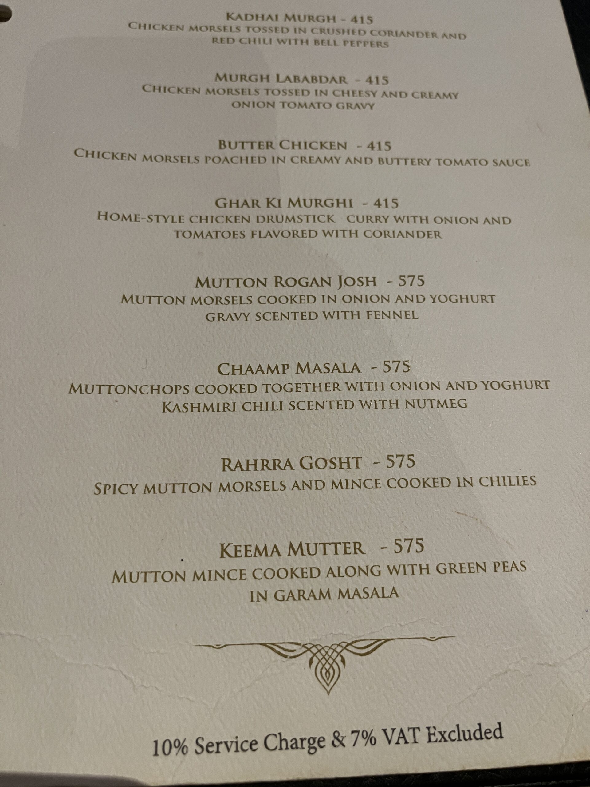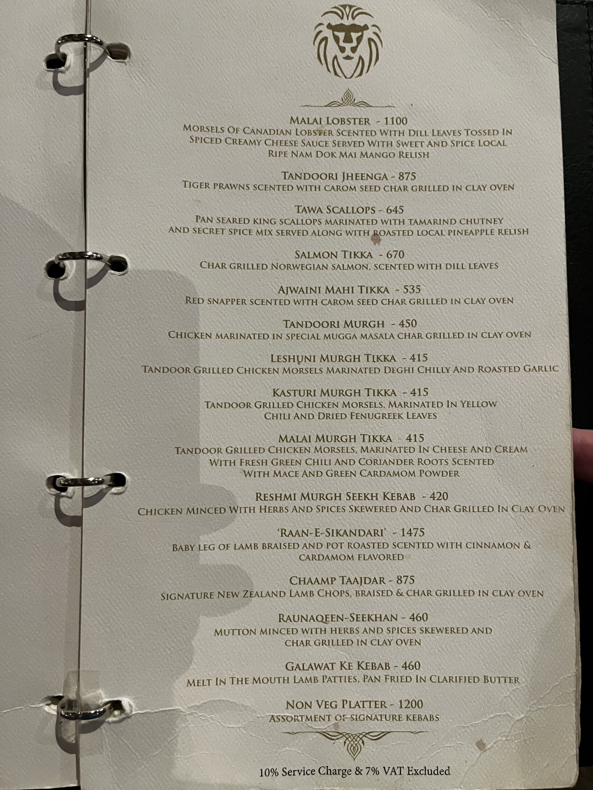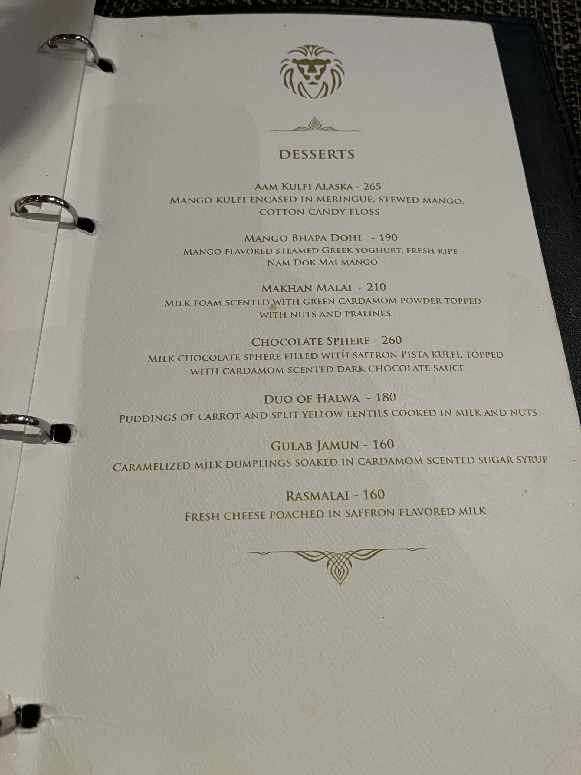 Punjab is also a recommendation from the Michelin Guide app and has been on my to-do list for a while. So I reserved a table using the Chope app (although the place is so big that this probably wasn’t really necessary). I was actually looking forward to the casting menu mentioned online, but it wasn’t on the menu (although one was apparently served at the next table, so maybe it’s only available upon request). Well, I ordered scallops, lamb, and something with mango for dessert. The problem with the scallops was that the spices didn’t leave much flavor. The lamb was delicious (two kinds, minced and chunks); it was supposed to be very spicy, but not really overly so. I once tried a filled naan with coconut with it, which was a bit sweet, but it went well with the dish. The dessert was quite funny. The sauce was hot and melted the chocolate. The waitress thought I wanted to film it too (like my two neighbors who took almost everything on video), but the before-and-after picture was completely sufficient for me. It was definitely delicious (Greek yogurt with infused mango). Uncharacteristically, I didn’t choose mango lassi this time, but rather a red wine.