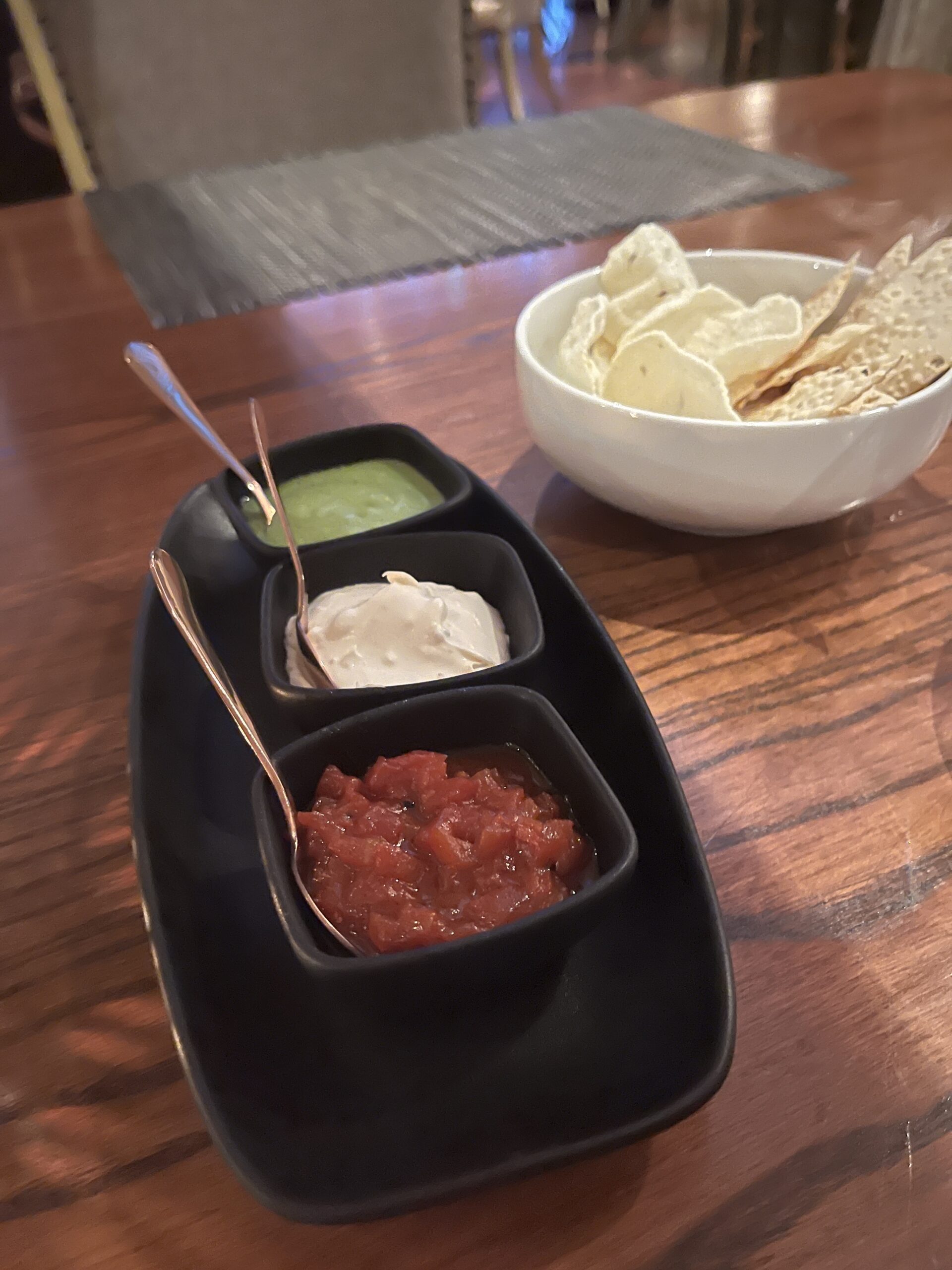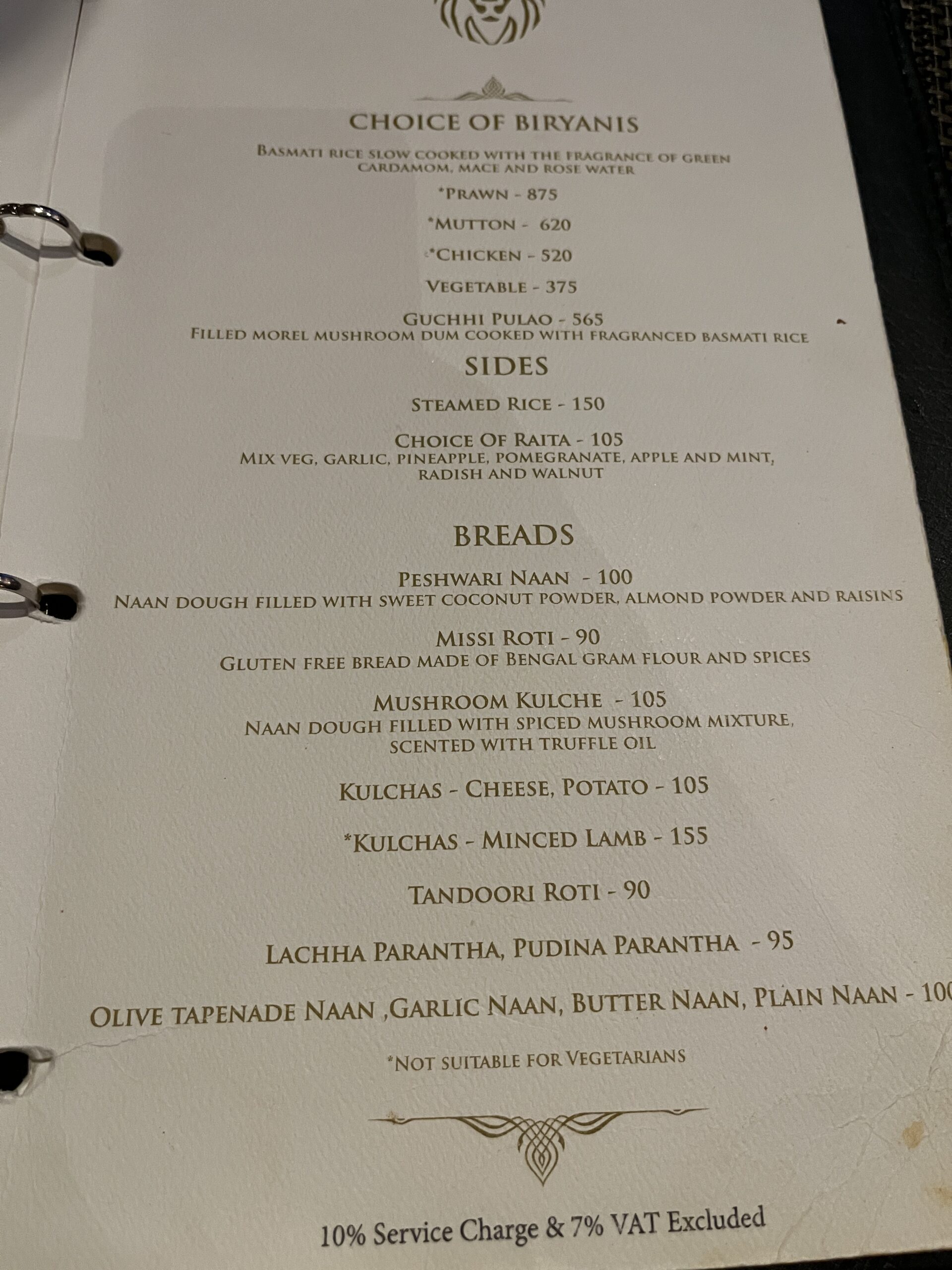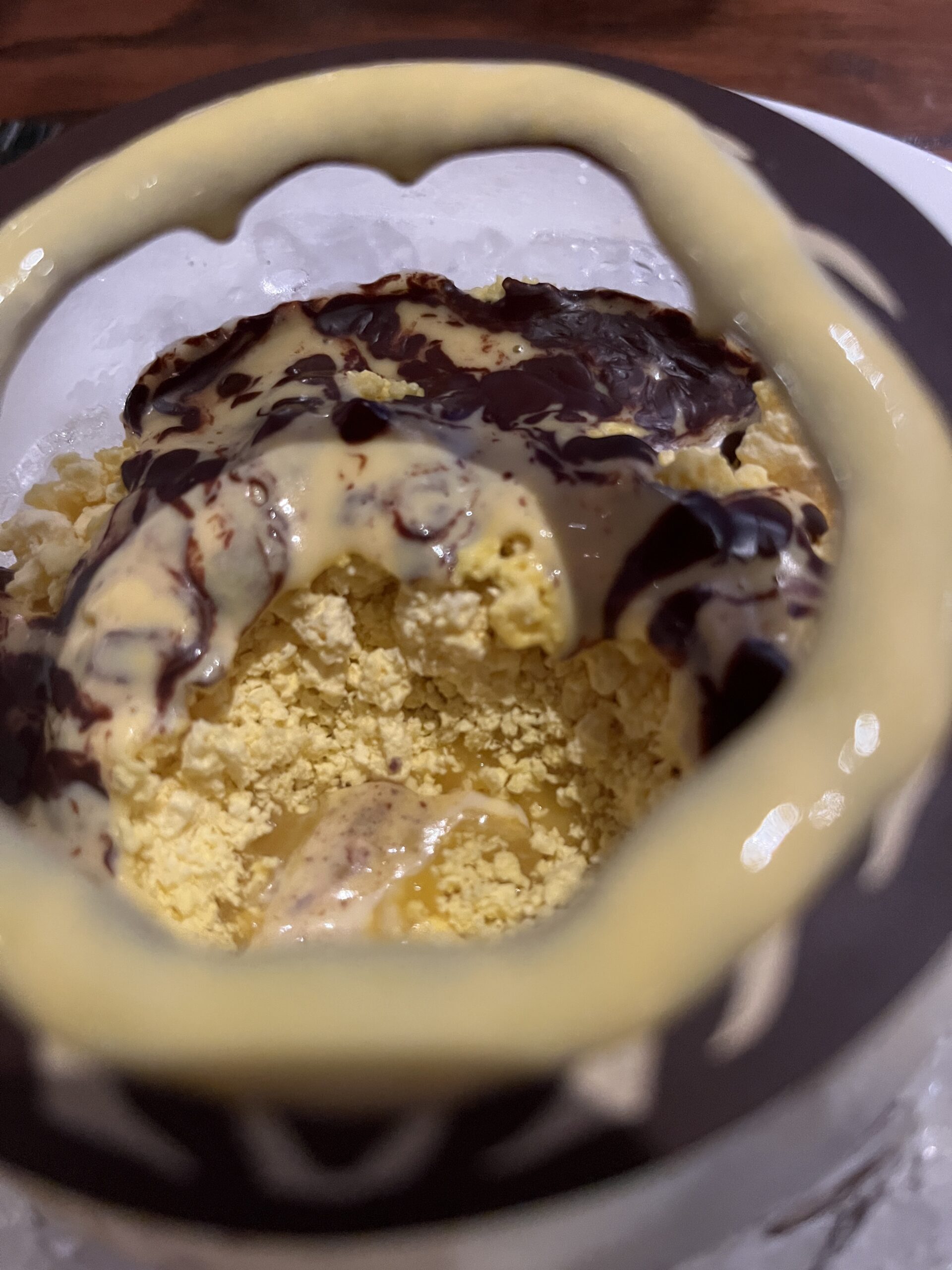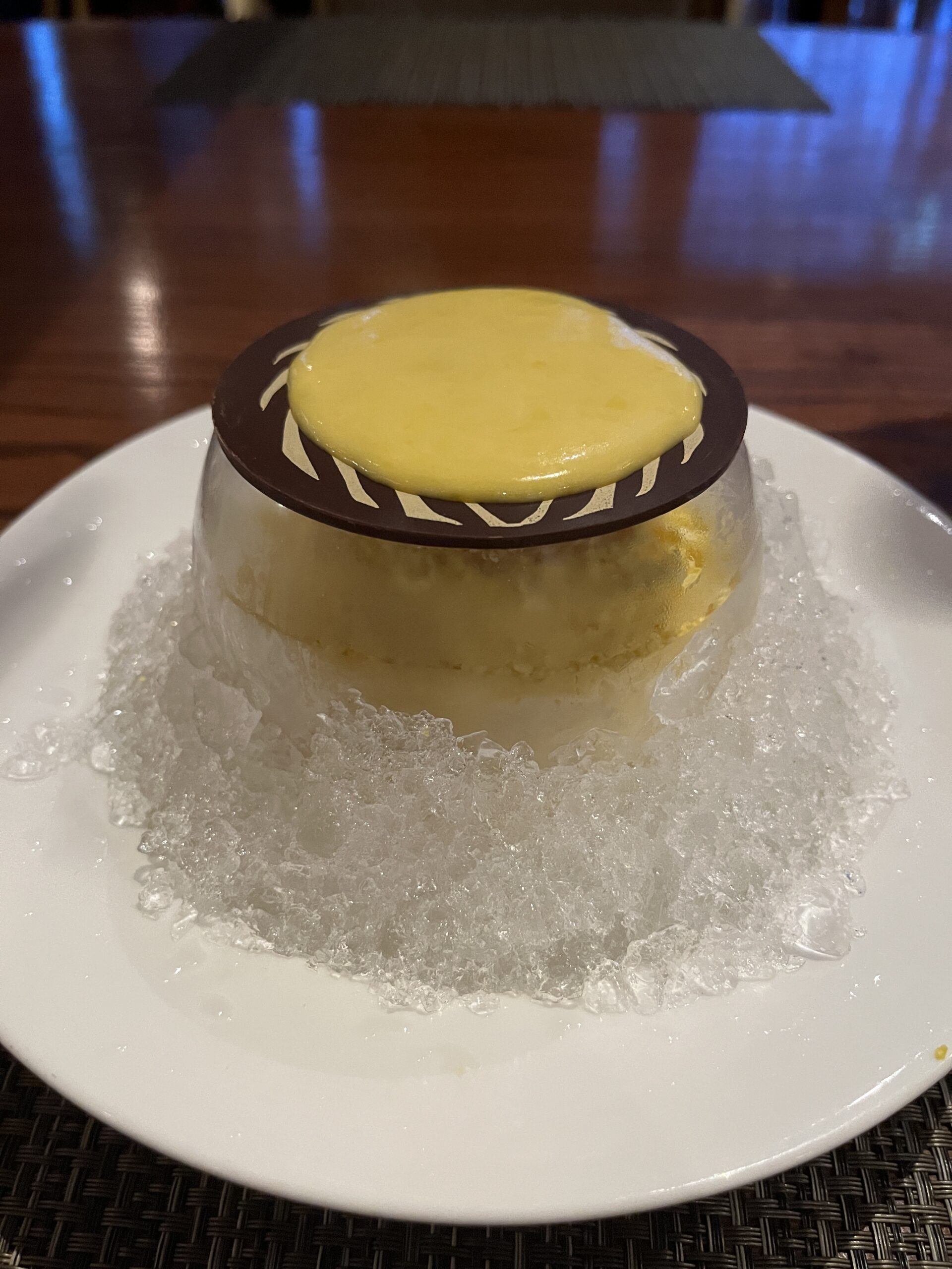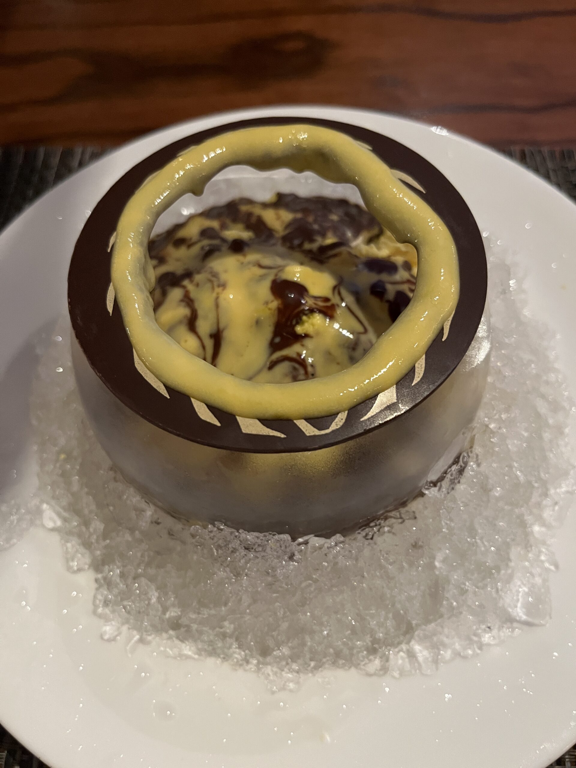 Punjab is also a recommendation from the Michelin Guide app and has been on my to-do list for a while. So I reserved a table using the Chope app (although the place is so big that this probably wasn’t really necessary). I was actually looking forward to the casting menu mentioned online, but it wasn’t on the menu (although one was apparently served at the next table, so maybe it’s only available upon request). Well, I ordered scallops, lamb, and something with mango for dessert. The problem with the scallops was that the spices didn’t leave much flavor. The lamb was delicious (two kinds, minced and chunks); it was supposed to be very spicy, but not really overly so. I once tried a filled naan with coconut with it, which was a bit sweet, but it went well with the dish. The dessert was quite funny. The sauce was hot and melted the chocolate. The waitress thought I wanted to film it too (like my two neighbors who took almost everything on video), but the before-and-after picture was completely sufficient for me. It was definitely delicious (Greek yogurt with infused mango). Uncharacteristically, I didn’t choose mango lassi this time, but rather a red wine.