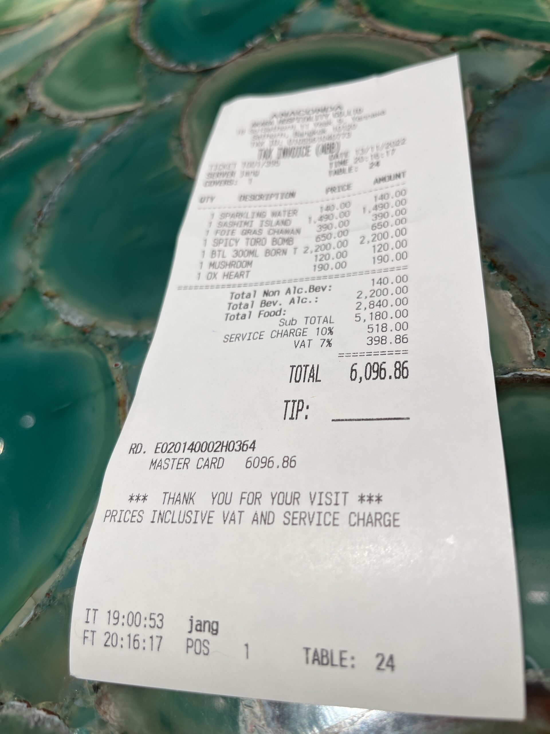 The Anaconda, where should I even begin? The Anaconda has just opened and looks very stylish. You practically sit around the chefs and can watch them at work, which is actually quite great. But in this case, it’s unfortunately fatal, because you can see the complete incompetence of the team. Even the European woman in charge of quality management doesn’t help. The preparation of my sashimi was the ultimate tragedy. The fish was re-dressed dozens of times, and a small piece was always cut off. The presentation itself was top-notch (although by then the fish was lukewarm and watery). The Froie-Grah custard egg was gritty and unfortunately flavorless, and the small pieces of liver were fried to death. The ox-heart was grilled to the limit, the mushrooms smothered in a marinade. Highlights were the spicy torro maki and the Dajingo sake (although that wasn’t their fault). The waitress was more concerned with partying than serving, and they were usually laughing shrilly. Yes, it was probably the worst experience I’ve ever had in Bangkok and definitely in the top three for that. Sometimes you just have to wait for a few reviews first 😀 But maybe this way I can at least help others and prevent them from having a flop.