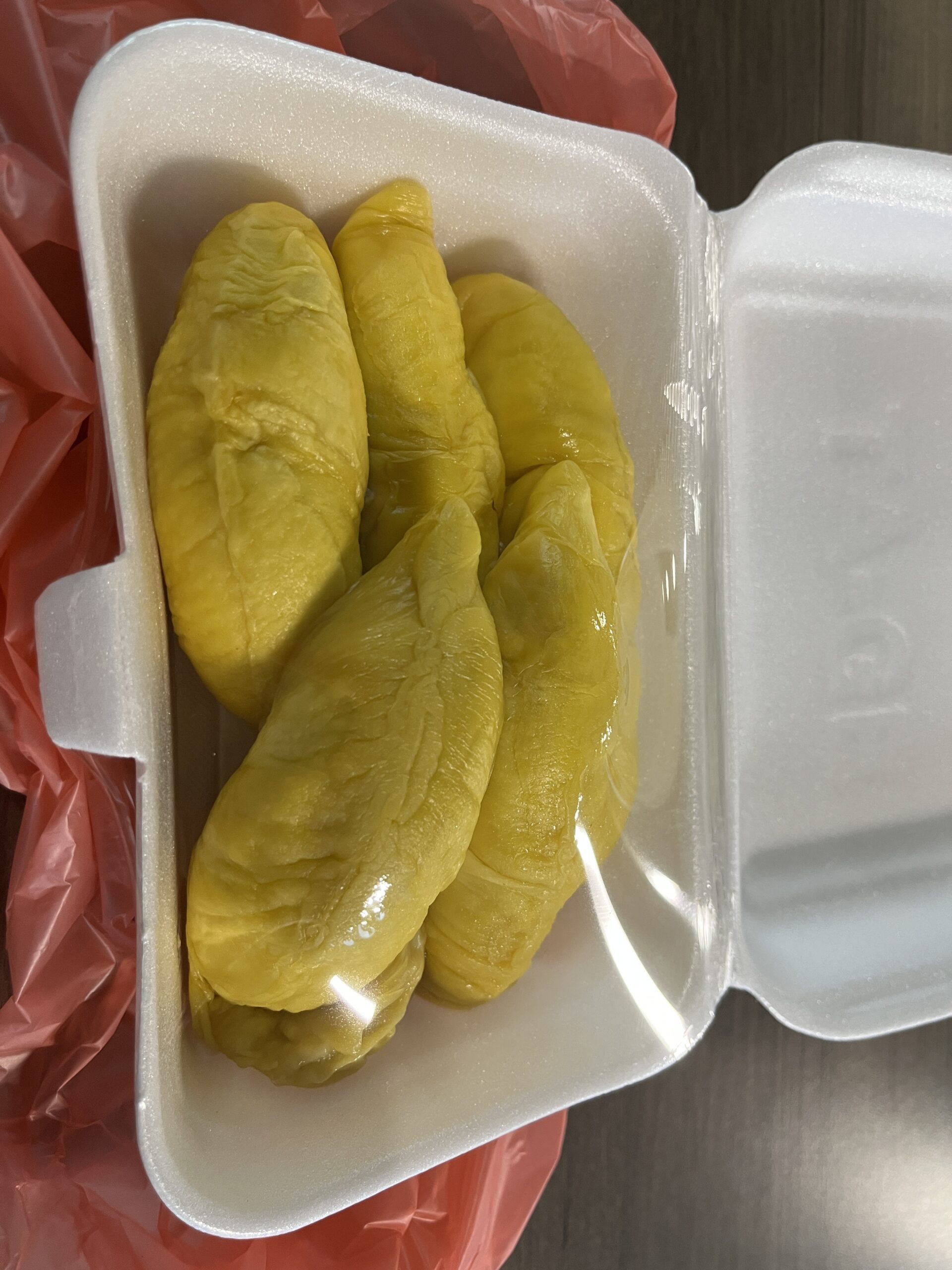 The address is a cluster of Hawker stores, or small shops that offer food. There’s one in Chinatown that even has a Michelin star. The problem with that one is that I’m always a bit late, as I usually arrive in the evening, and some are already closed or out of everything. But I’ve been here twice anyway. Once, I had duck and pork with rice, which was quite tasty. The second time, I also had rice, but with miso and salmon. That wasn’t quite as tasty (but not really bad either). I’ll see if I go again, but there are a few other places to try. The market here does have one good thing, though: there are a lot of shops that sell durian 😀