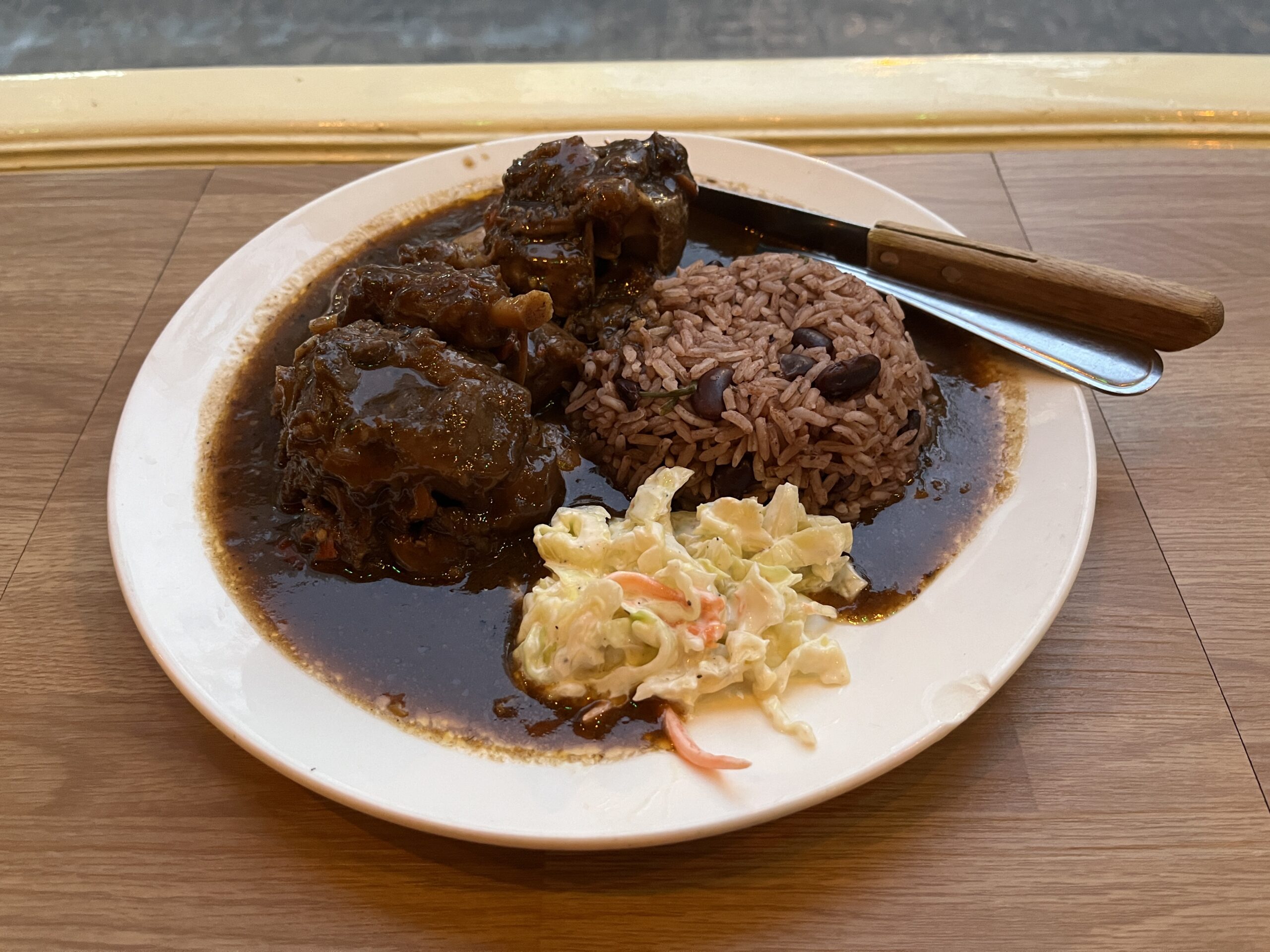 I don’t think I’ve ever had Jamaican food before, and since I wanted a change, I tried the pan jerk. The place is also new in this location, and I’m not sure if it hadn’t been somewhere else before (at least I had seen a similar place nearby on Google). I ordered oxtail, and I have to say it was delicious. It was particularly well seasoned, and a lot of it came straight from the bone. The rice that came with it was also very good. The place is right next to the Aloft Hotel, and you can sit outside, which is becoming more and more important to me ;). The only thing that was a bit annoying was the weird music (rap).