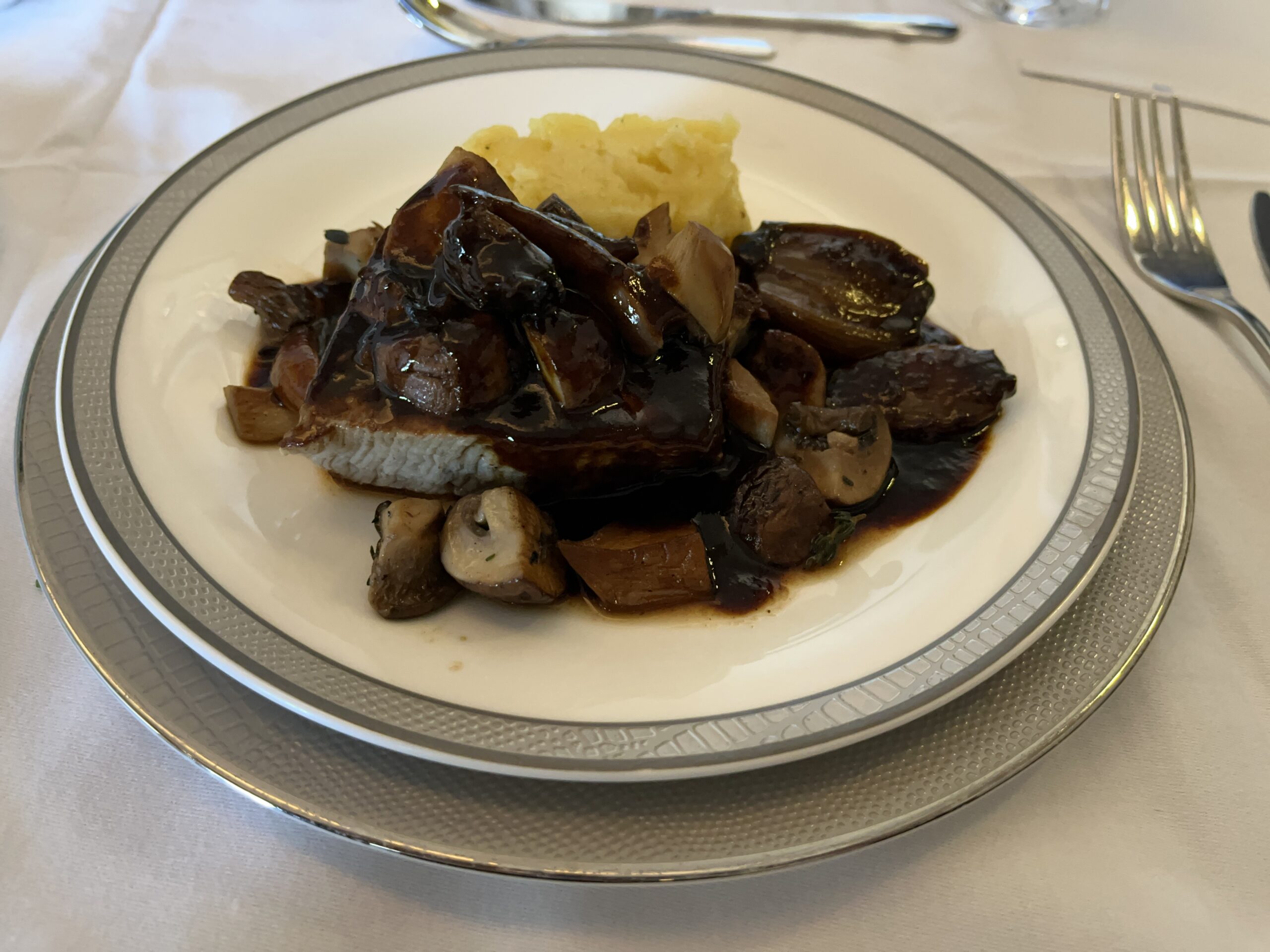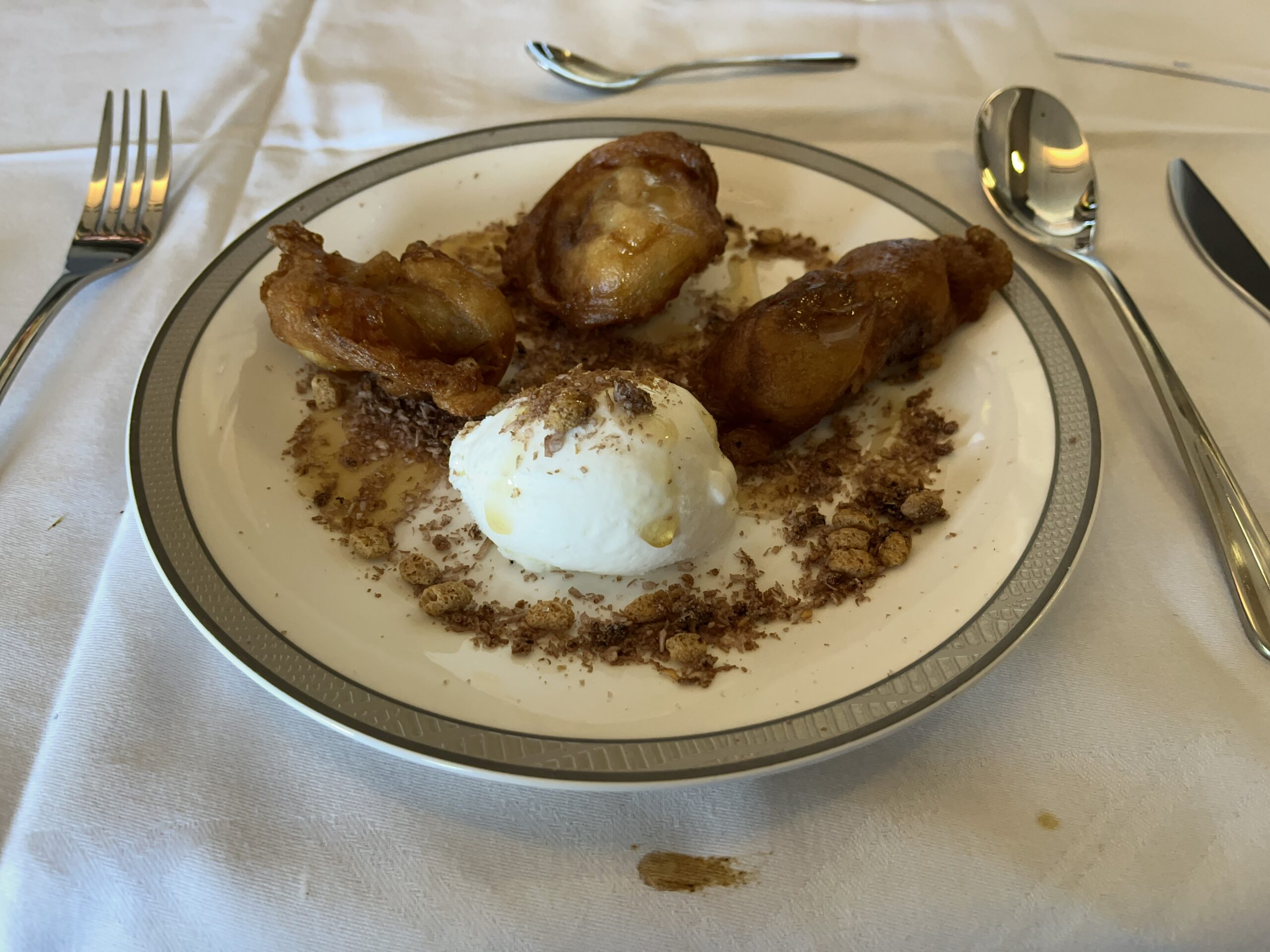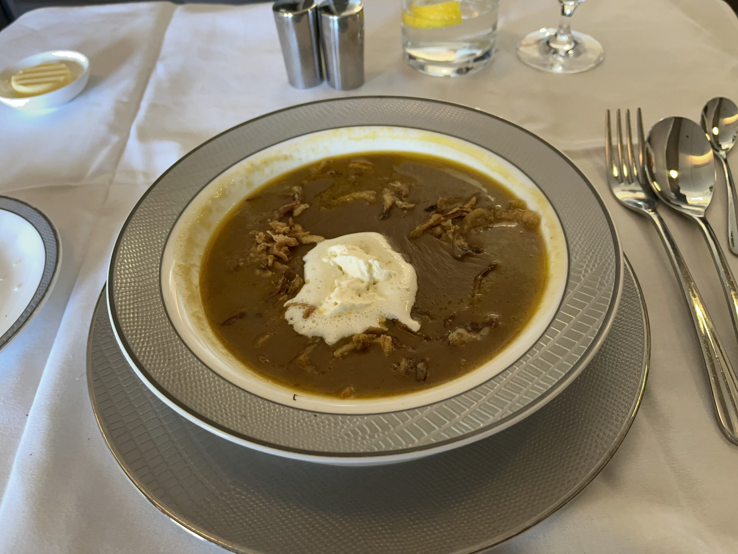 Now for the pleasant part of the journey in the new Singapore Suite from FRA to SIN on the A380. Since Singapore Airlines is no longer offering this flight as of the summer schedule, I had to hurry a bit 😀 The private cabin is huge for an airplane. You have your own swivel seat and a separate bed. Even though the bed in the 777 may be a bit wider, the one here is more comfortable thanks to the continuous surface. I have never slept so well on a plane (but that might also have been due to the quiet flight in the A380). The service is, as usual with Singapore, of a very high standard, both in terms of the food and the overall service. First, there were lots of Krug 😉, which I also chose for the caviar. Then there was the Johan Lager menu with soup and boiled beef, both very tasty. For breakfast, there was fruit and rice soup, also very tasty (I don’t usually eat much breakfast on airplanes).