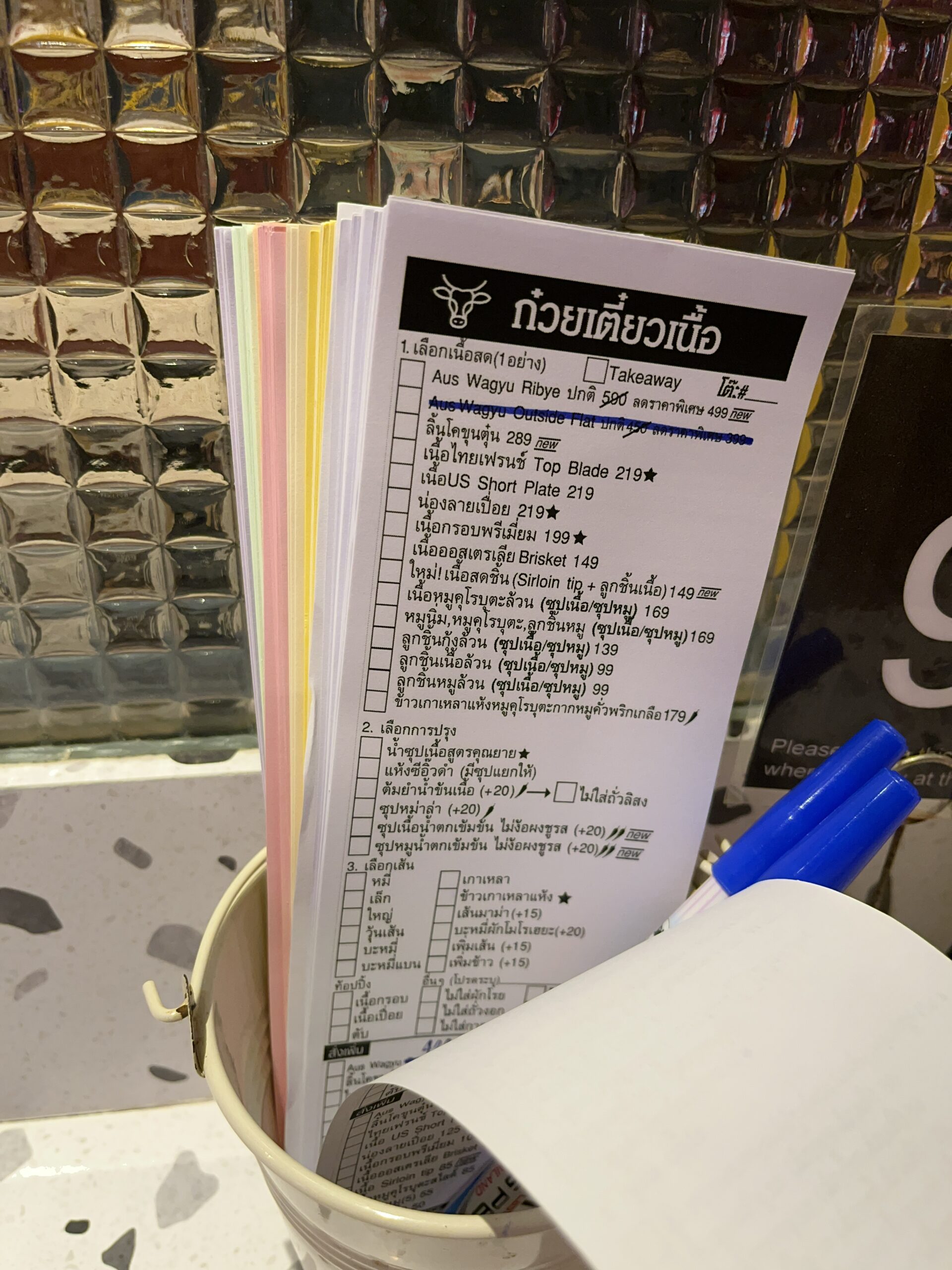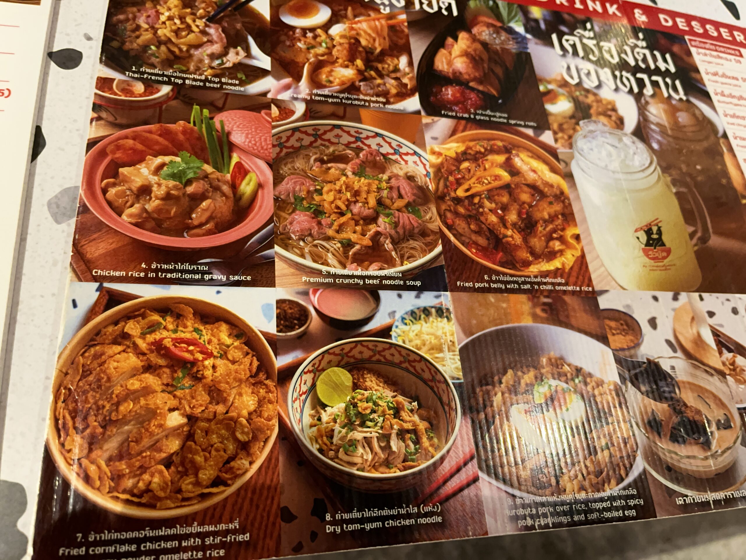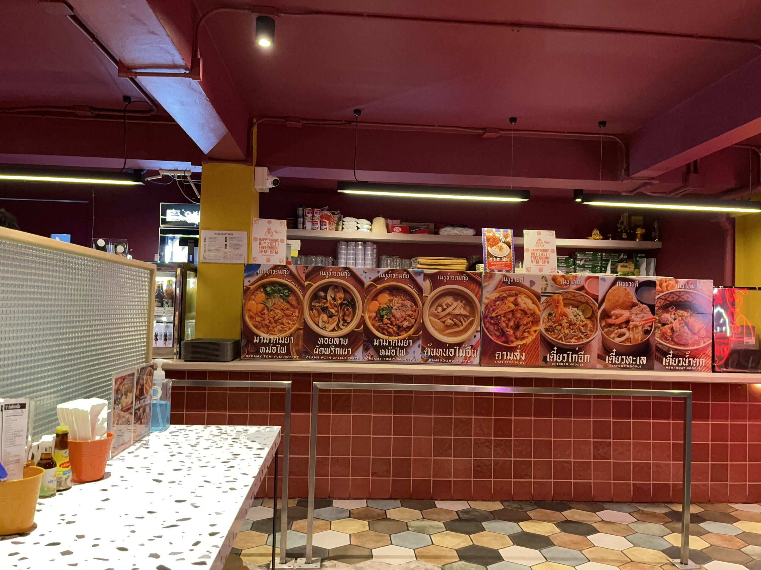 It was time for something new again: Kodungkhao. The restaurant is somewhat tucked away in the back corner. I’ve already been to various restaurants on the street. The decor is rather spartan and probably designed for a quick lunch. There are plenty of individual seats at a long counter. Orders are placed via slips of paper sorted by meat type (beef, pork, chicken, appetizers, and drinks). Once you’ve chosen your protein, you can choose whether you want it dry or with broth, the desired flavor, and even the topping. The slips are only available in Thai, but the waitress brought me a sentence in English and briefly explained the system. I opted for pork with broth, Tom Yum style. I also had an onion pizza as a starter and a lychee juice. As is almost usual, the starter came well after the main course, but hey, you get used to it. Both the soup and the starter were quite tasty. Definitely worth repeating!