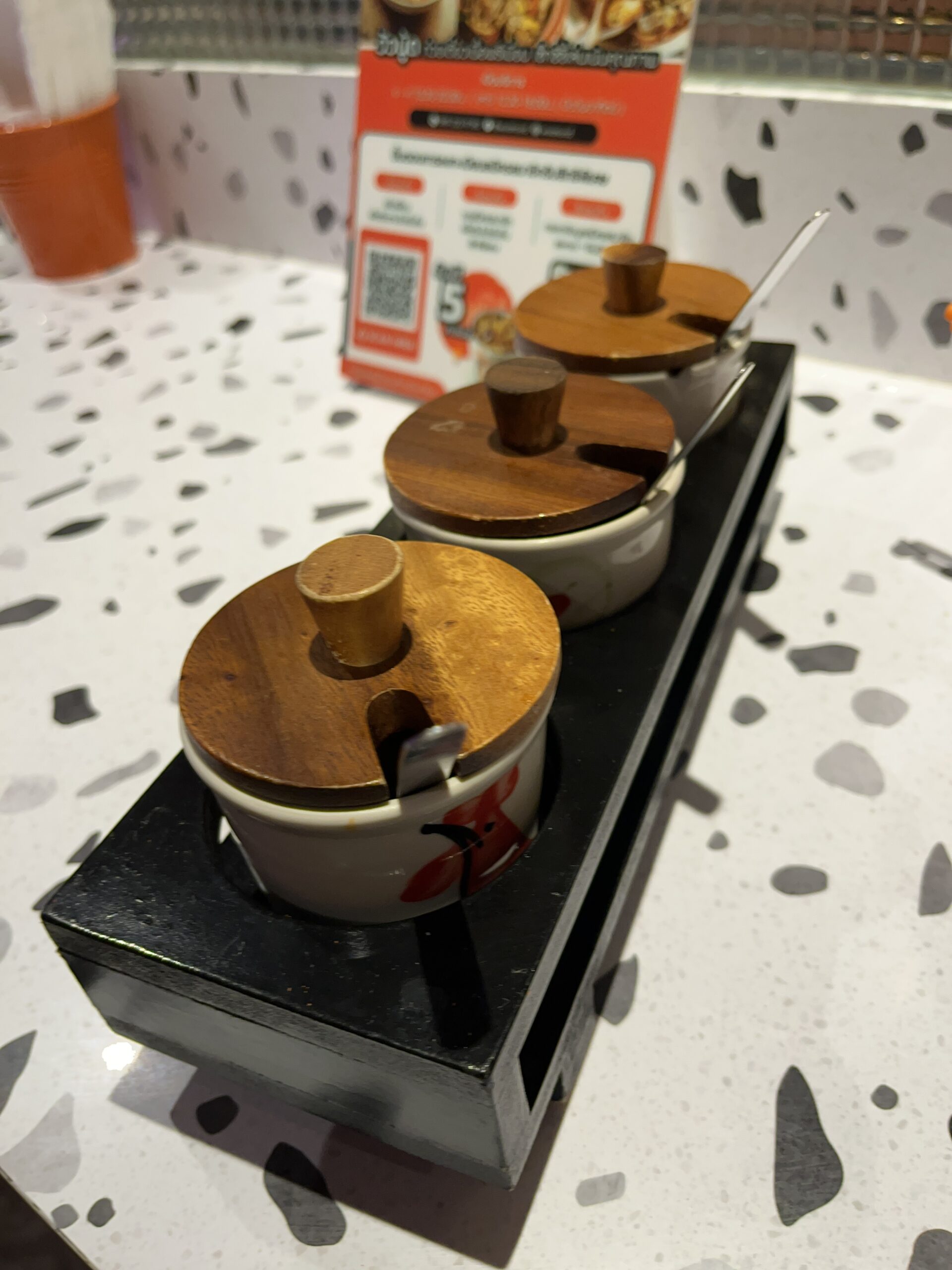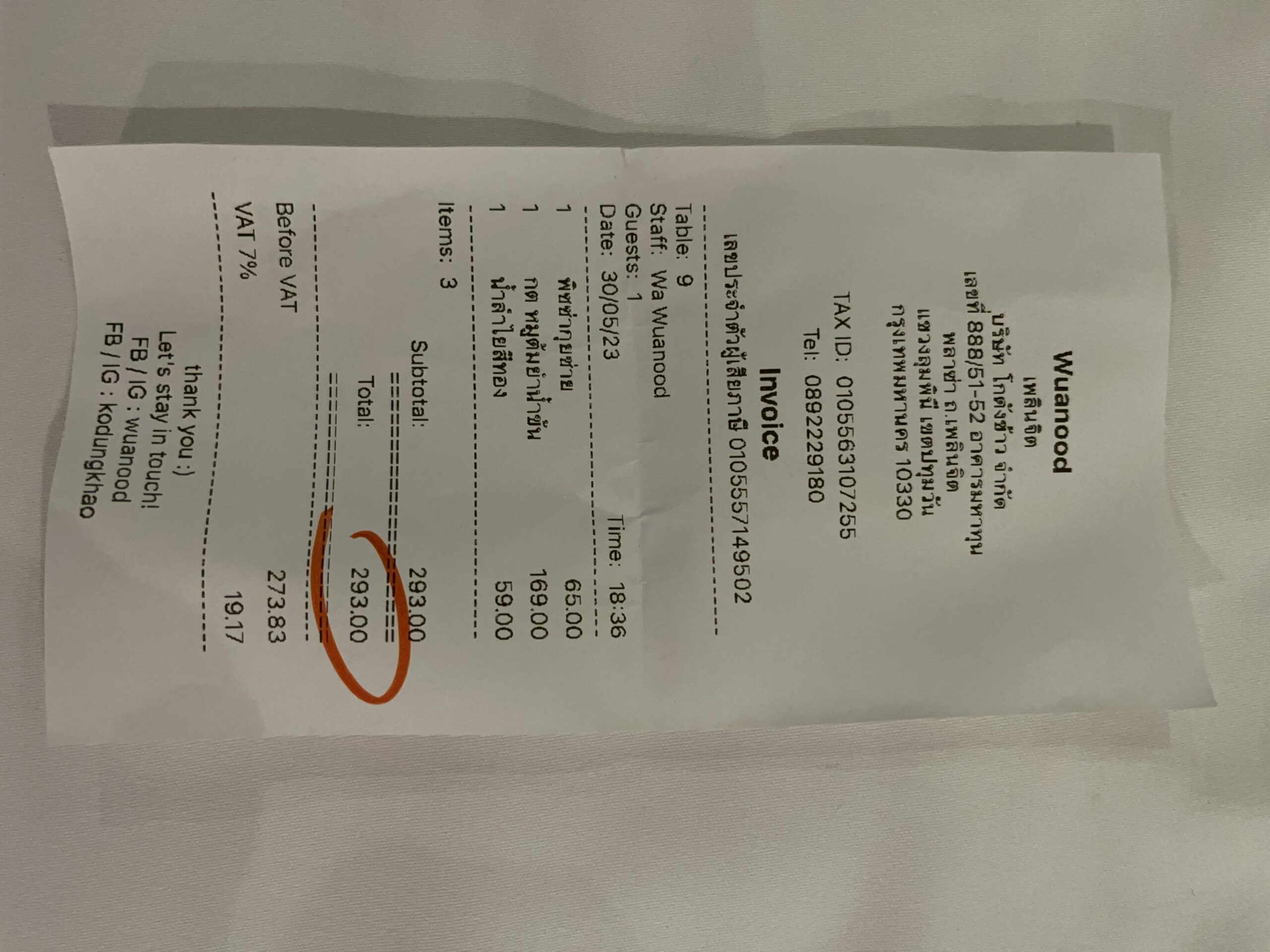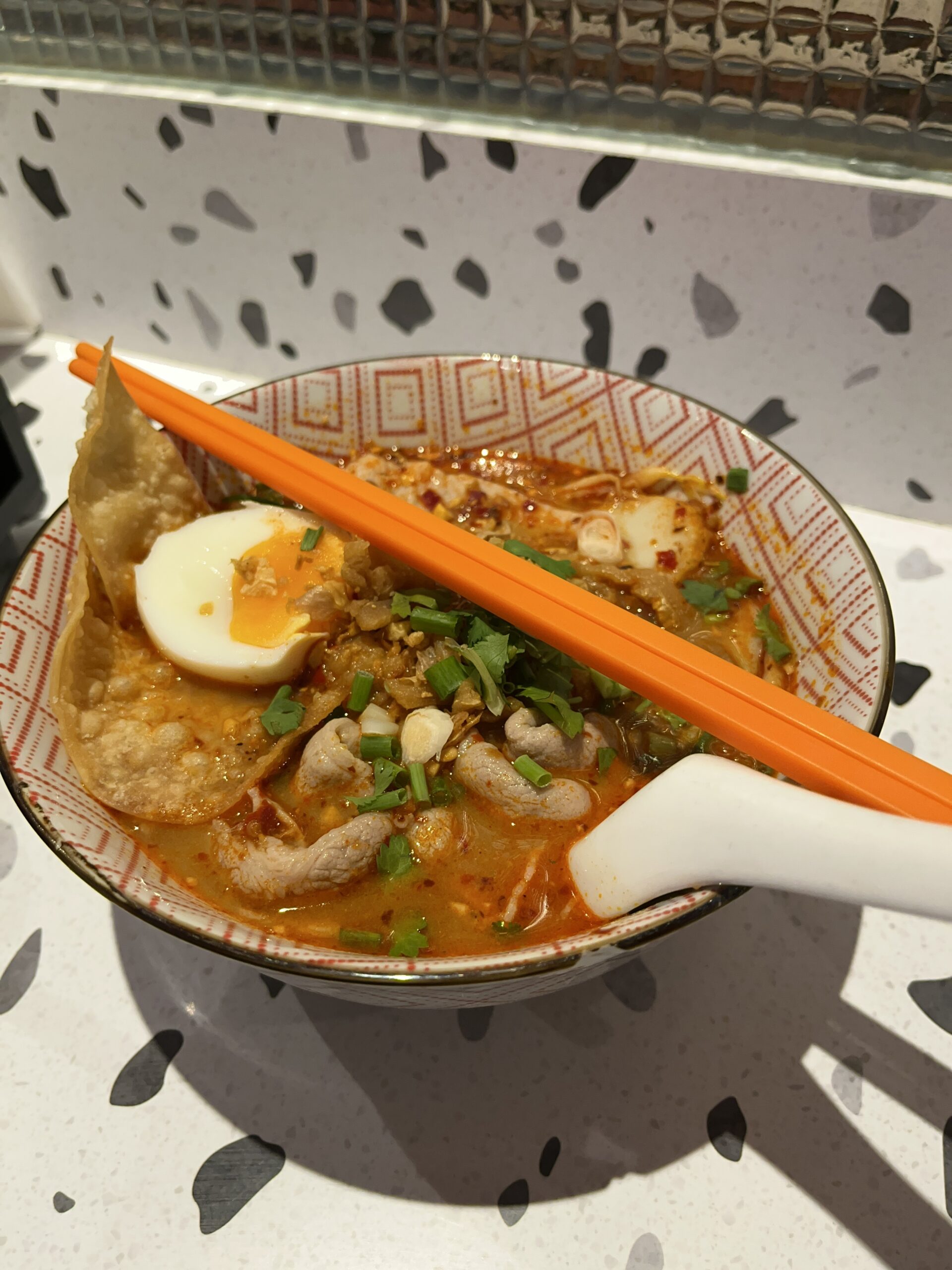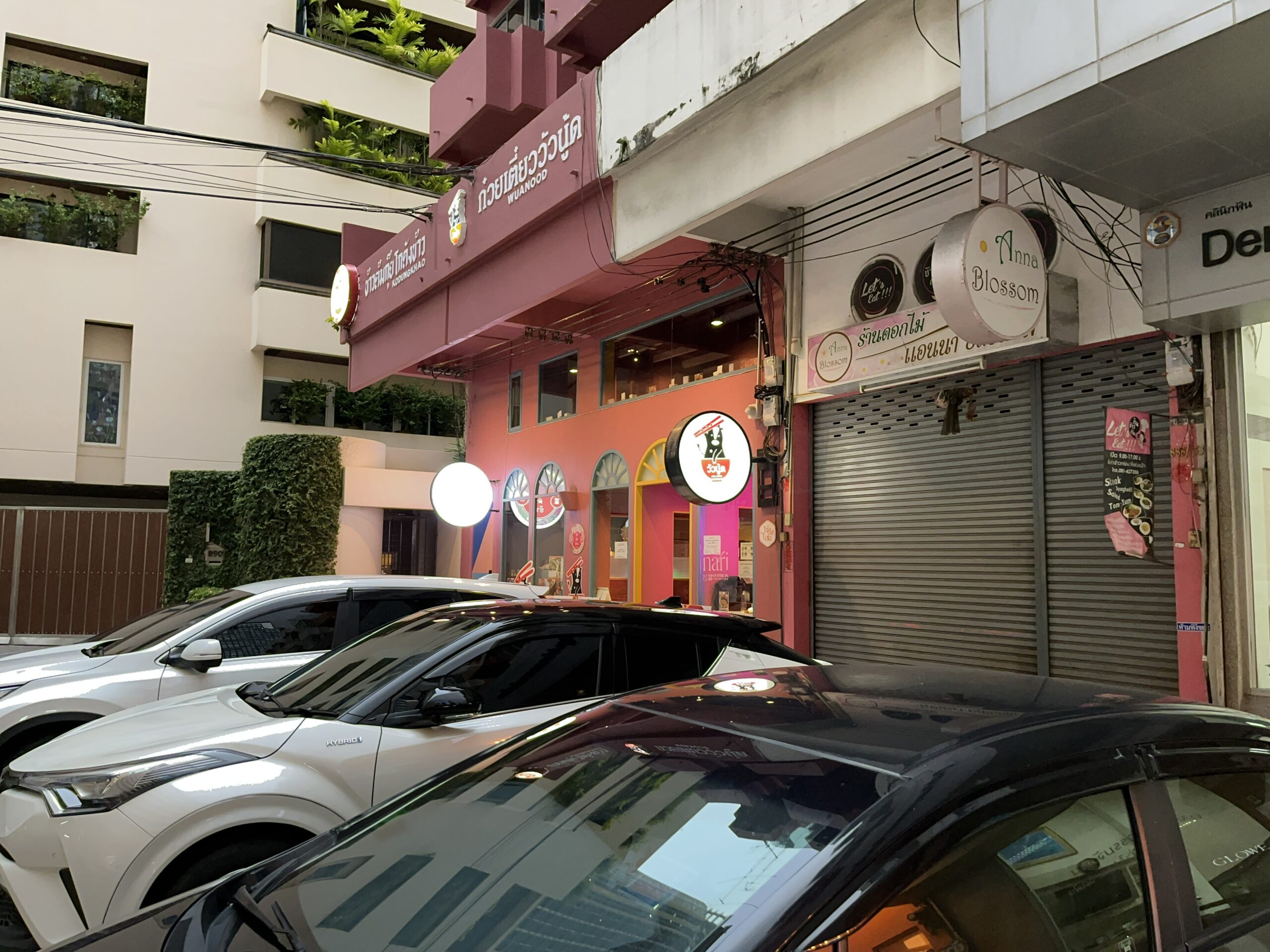 It was time for something new again: Kodungkhao. The restaurant is somewhat tucked away in the back corner. I’ve already been to various restaurants on the street. The decor is rather spartan and probably designed for a quick lunch. There are plenty of individual seats at a long counter. Orders are placed via slips of paper sorted by meat type (beef, pork, chicken, appetizers, and drinks). Once you’ve chosen your protein, you can choose whether you want it dry or with broth, the desired flavor, and even the topping. The slips are only available in Thai, but the waitress brought me a sentence in English and briefly explained the system. I opted for pork with broth, Tom Yum style. I also had an onion pizza as a starter and a lychee juice. As is almost usual, the starter came well after the main course, but hey, you get used to it. Both the soup and the starter were quite tasty. Definitely worth repeating!