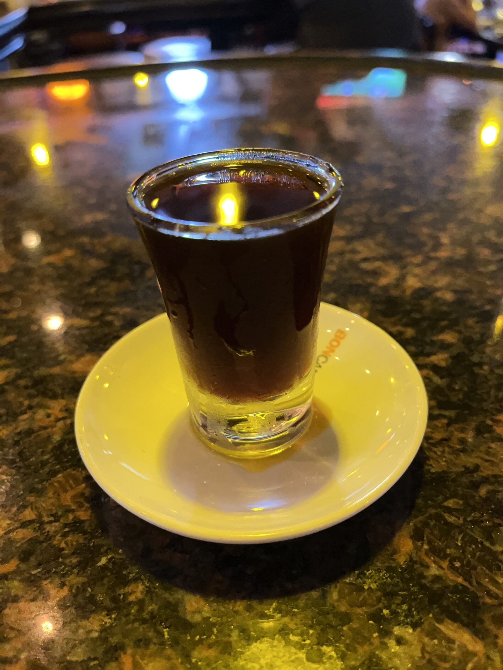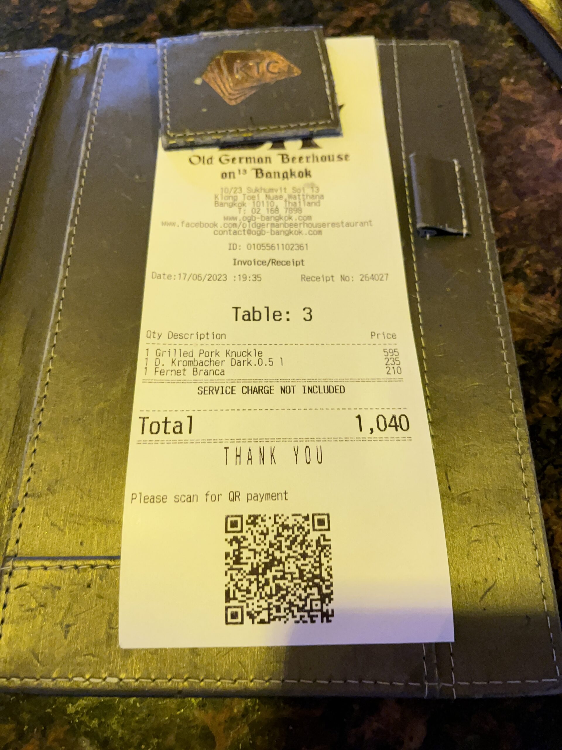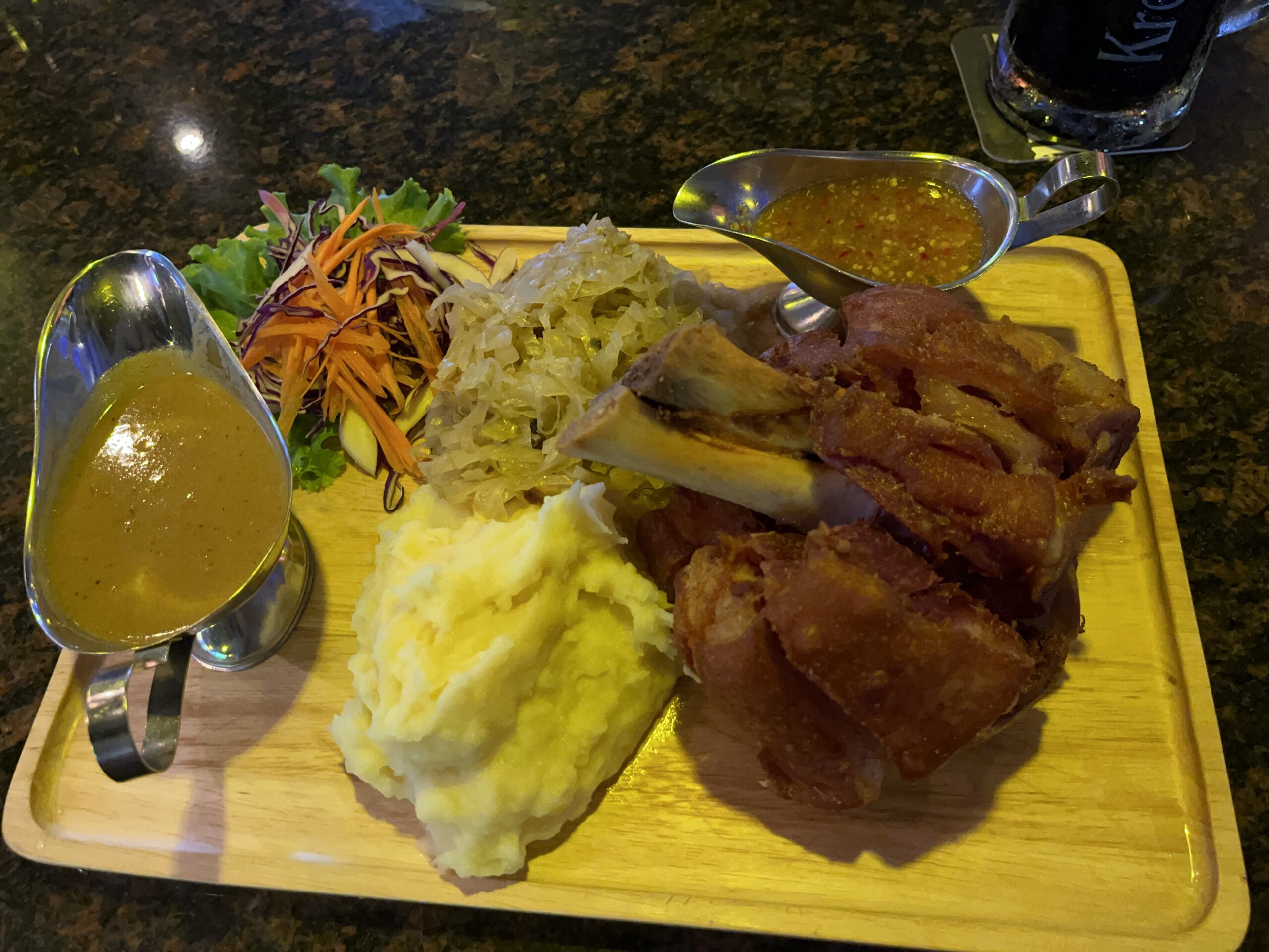OGB on 13 is the subsidiary of OGB on 11, which I visited last year. I actually wanted to try the pork knuckle back then, but another dish came up. So, I decided to try it again this time. I didn’t spend much time looking at the menu and went straight for the pork knuckle (with cabbage and mashed potatoes). It had little in common with a German pork knuckle, as it’s deep-fried (as I discovered in Taiwan, too). It came with a spicy chili and garlic sauce. This sauce is usually served with fish here, but it goes really well with the knuckle, too. The cabbage was okay; it wasn’t exactly sauerkraut, but it wasn’t bad (unfortunately, it was a bit cold). The mashed potatoes and the gravy weren’t bad either, but I only tasted them briefly and actually left them alone because the knuckle was so much 🙈 I also had a dark Köster and a Fernet to aid digestion 🤭 During the meal it started to rain heavily, but unlike OGB on 11, this version has glass doors which can be closed in the event of an incident like this!