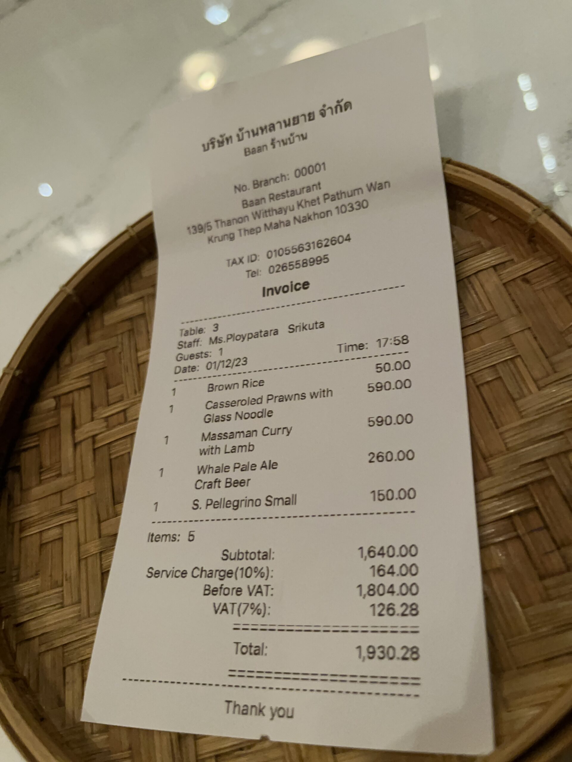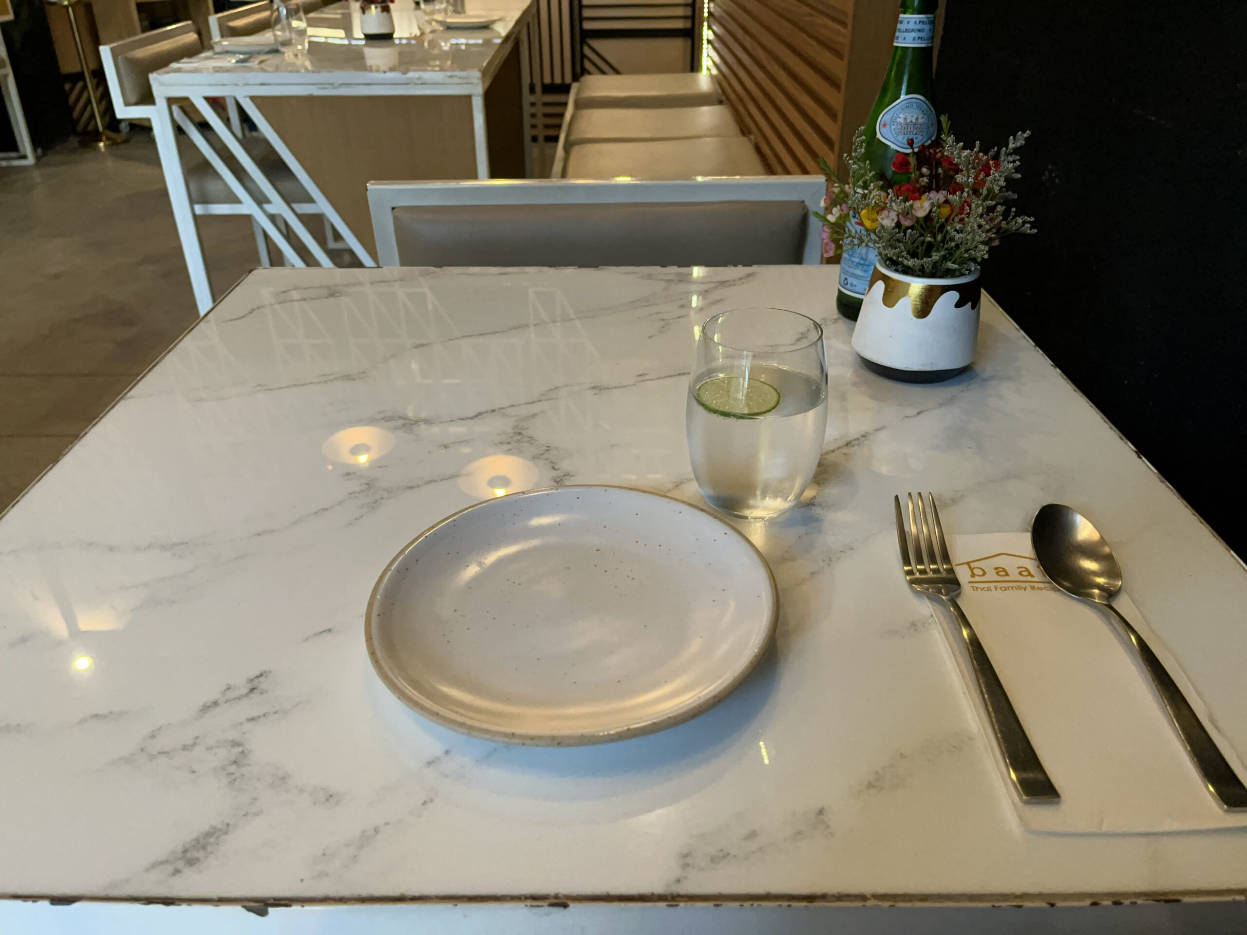 Baan is a bit further away and is a recommendation from the Michelin Guide app. It’s a Thai restaurant, which isn’t immediately obvious from the decor and music. It’s definitely geared toward a Western clientele. At 5:30 p.m., I was the only customer, and that didn’t change until I left. I ordered shrimp with noodles and the lamb curry, along with a pale ale. Both dishes were absolutely delicious, and there was nothing to complain about. However, the price per person is quite high at 2,000 baht, and it’s a bit too expensive compared to a Burapa or Thai Niyom.