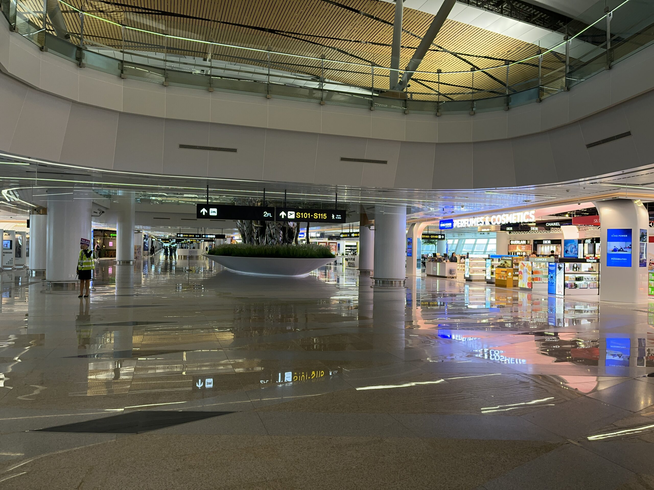 I actually didn’t want to write another post for the return flight, as this one is almost identical to the last one. But since the departure was from the new terminal, here’s a short report anyway. The new terminal SAT1 had its ‘soft opening’ at the end of October. While I was waiting in line, I had to do a quick Google search. Finding 1: There are no lounges there yet, so I went to my favorite lounge, Silver-Kris. As always, the food was great (good bak kut teh and curry). But it was quite short, so I walked to the new train; yes, you can only get to the new terminal by train. The journey takes about 3 minutes. There are already shops in the new terminal, but they’re more of an ordeal for the employees, as there are hardly any guests. There are also 2 restaurants (one of which is a MC), but they’re dead here too. You can also hear hammering from somewhere. A lounge seems to already be open, a Miracle Lounge (but there was still banging coming from up there too). According to Google, the terminal is scheduled to be fully operational in 2027! Currently, only four airlines are using it. I wonder if they’ll always be happy with that?