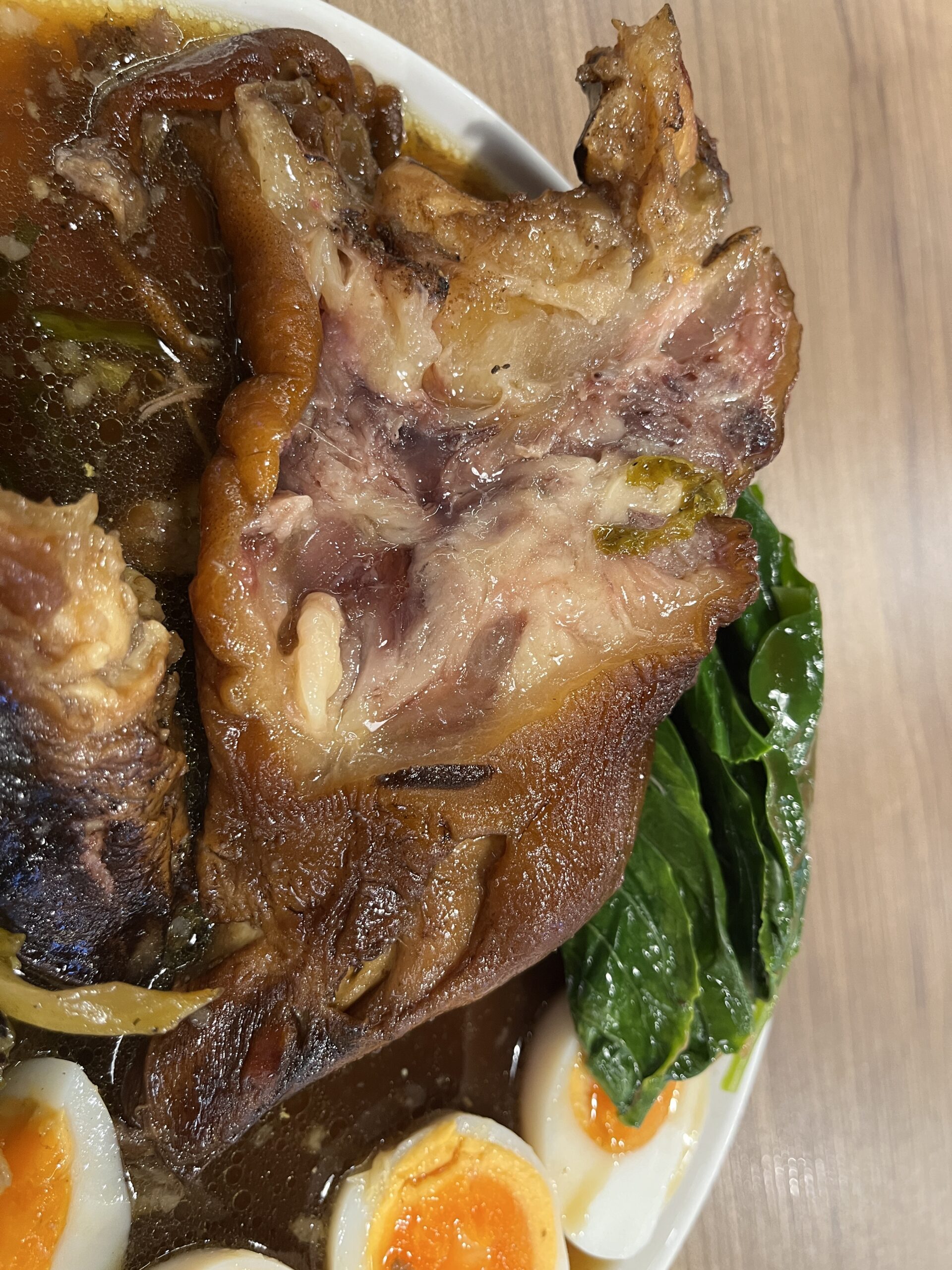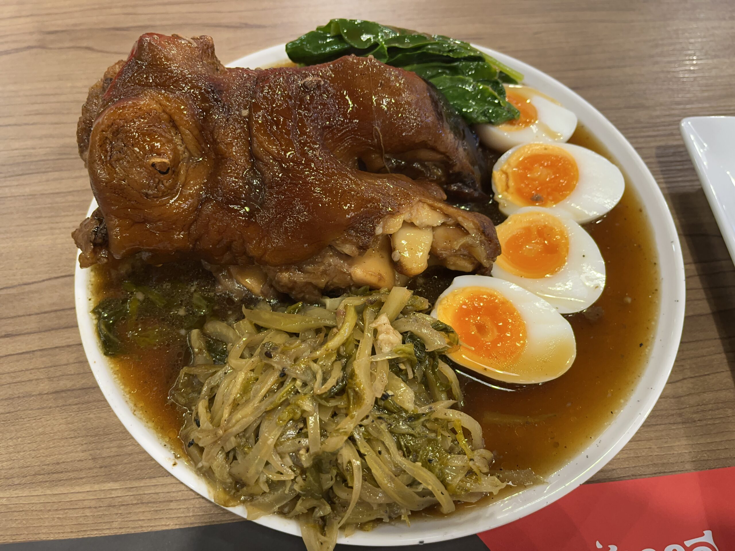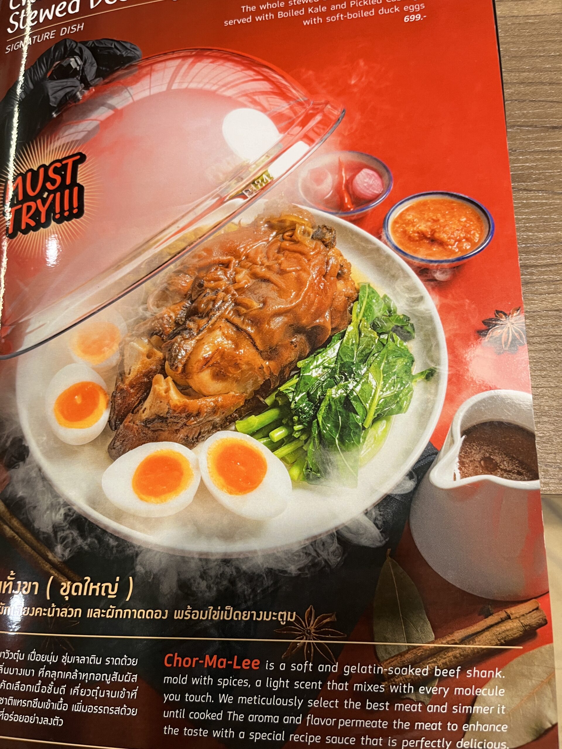 I stumbled upon Chor-Ma-Lee via a TikTok video. Their signature dish is ox foot. I also ordered their dumplings and fried lotus roots. The ox foot, as described on the menu, came under a glass dome with smoke. The smoke left a pleasant aroma. It also came with vegetables and two eggs (duck). The foot itself is most comparable to chicken feet at a Chinese restaurant. It’s basically pure gelatin and has no meat. The taste wasn’t bad, though, and it was very filling. The dumplings were good too. The lotus root was really tasty, it was sweet! All in all, it was good. At first, I had my doubts, as I was the only one in the restaurant, but later, significantly more guests arrived.