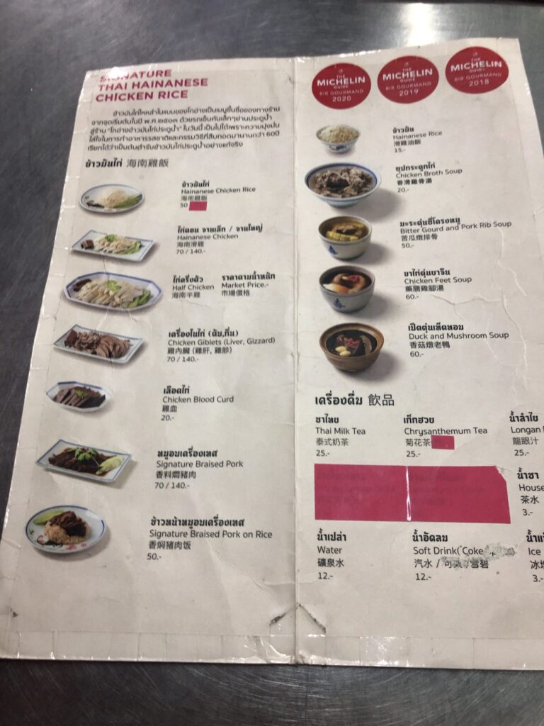 The ‘Go-Ang’ was also a recommendation from the Michelin app, and it’s close to Central World (which we only noticed on the way back 🙈). They basically only serve chicken, which is then charged at market price. Half a chicken costs the same as the rest of the meal 😳. At first, we didn’t order the chicken at all, but each ordered a soup (one with chicken bones and one with chicken feet). We also had giblets, blood cakes, and rice. Since we only got one portion of giblets and were feeling a bit hungry mid-way through, we ordered another half a chicken. The chicken was boiled and actually a bit bland, but it was served with a kind of huasin sauce. All in all, it was quite good, but probably not a repeat. On the way back, however, we saw a few other interesting restaurants 😉