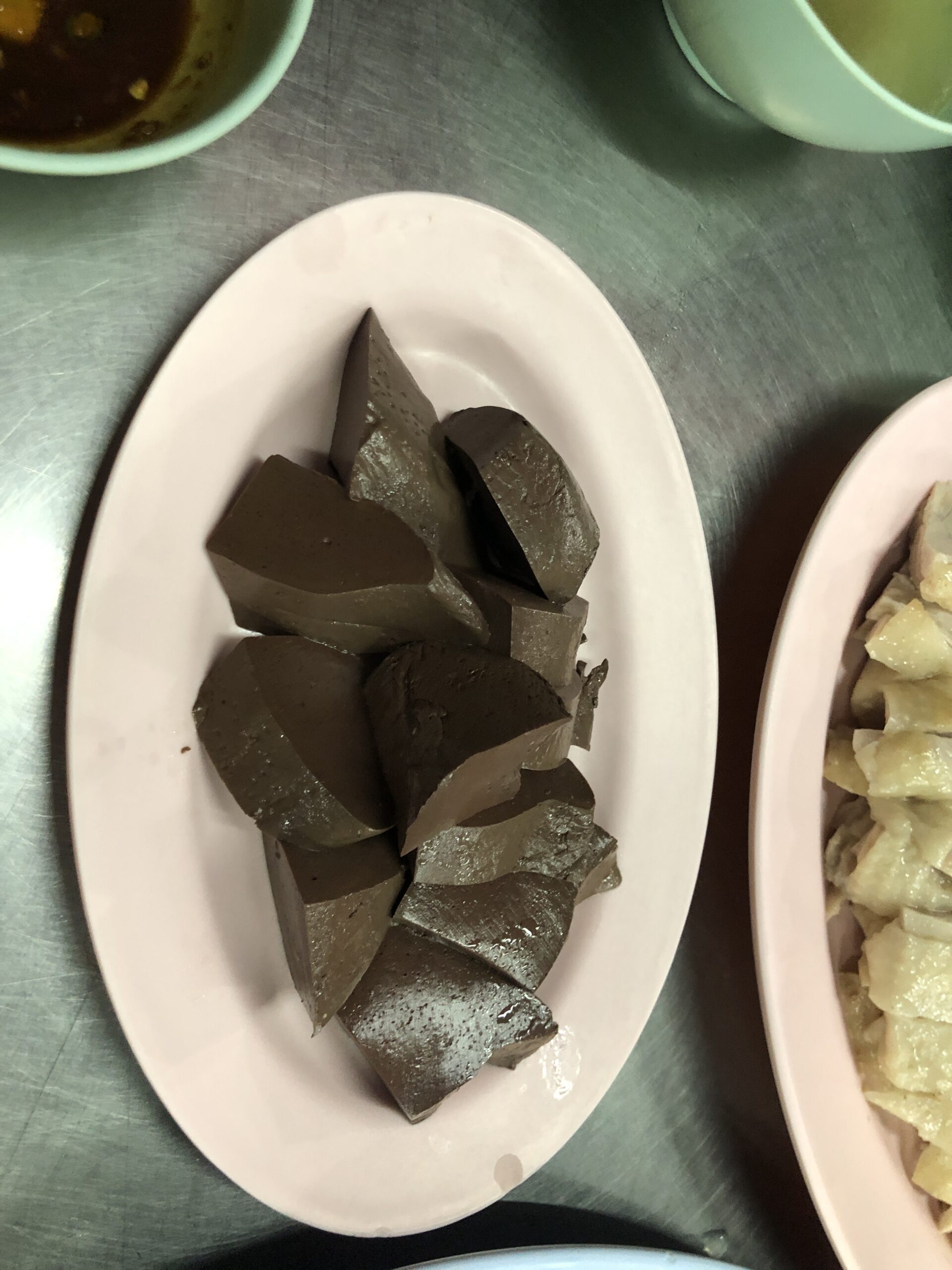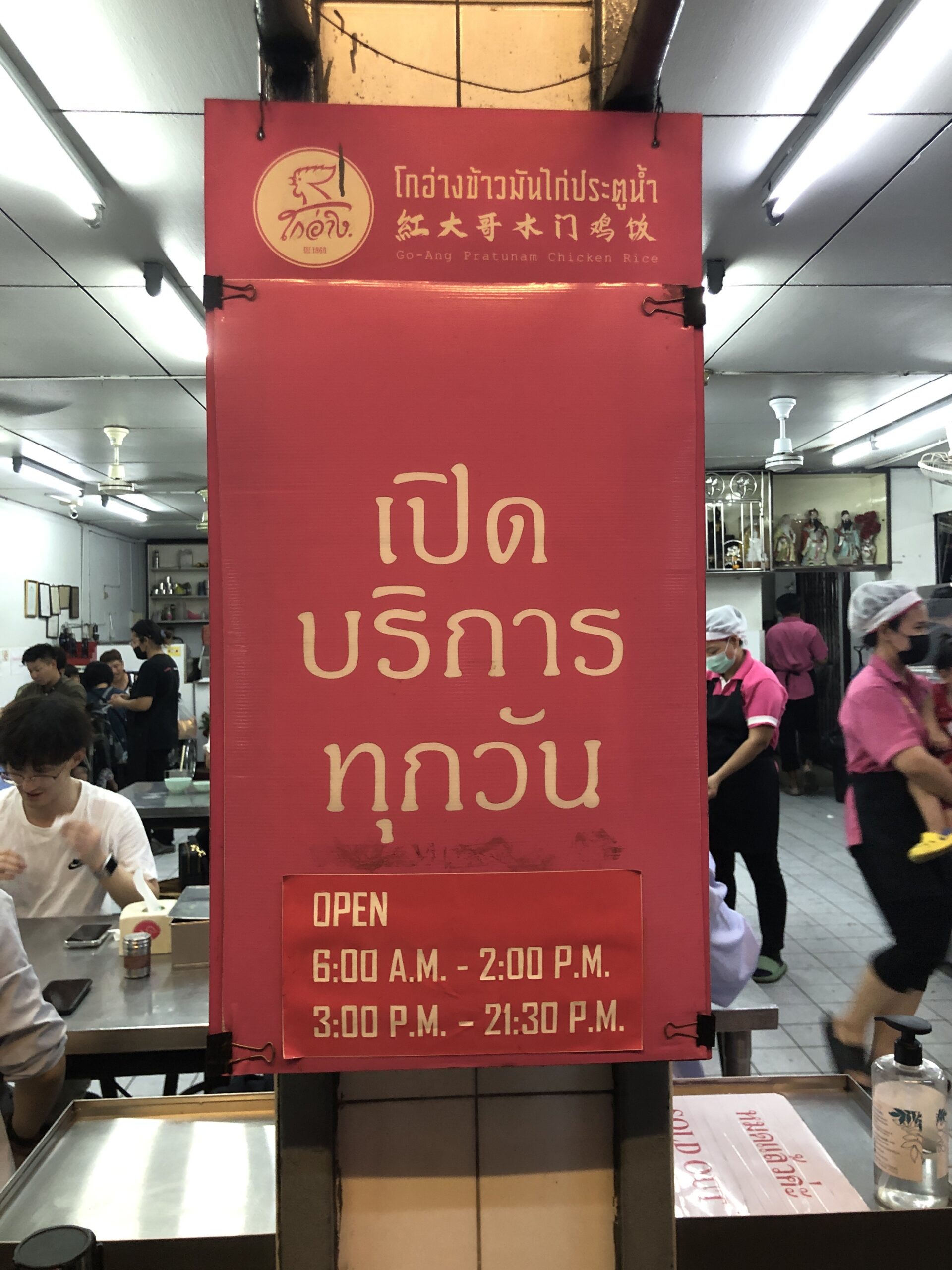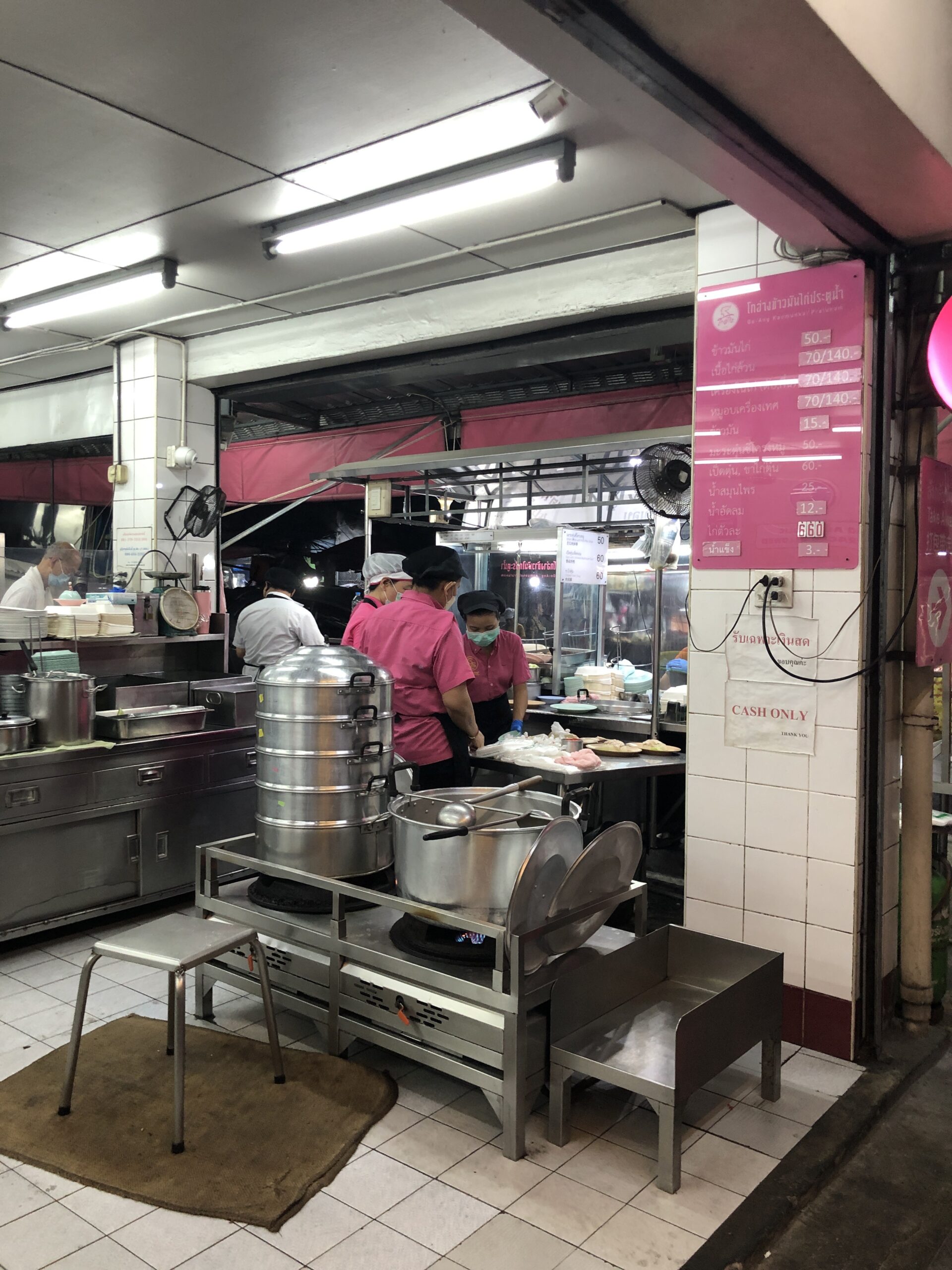 The ‘Go-Ang’ was also a recommendation from the Michelin app, and it’s close to Central World (which we only noticed on the way back 🙈). They basically only serve chicken, which is then charged at market price. Half a chicken costs the same as the rest of the meal 😳. At first, we didn’t order the chicken at all, but each ordered a soup (one with chicken bones and one with chicken feet). We also had giblets, blood cakes, and rice. Since we only got one portion of giblets and were feeling a bit hungry mid-way through, we ordered another half a chicken. The chicken was boiled and actually a bit bland, but it was served with a kind of huasin sauce. All in all, it was quite good, but probably not a repeat. On the way back, however, we saw a few other interesting restaurants 😉