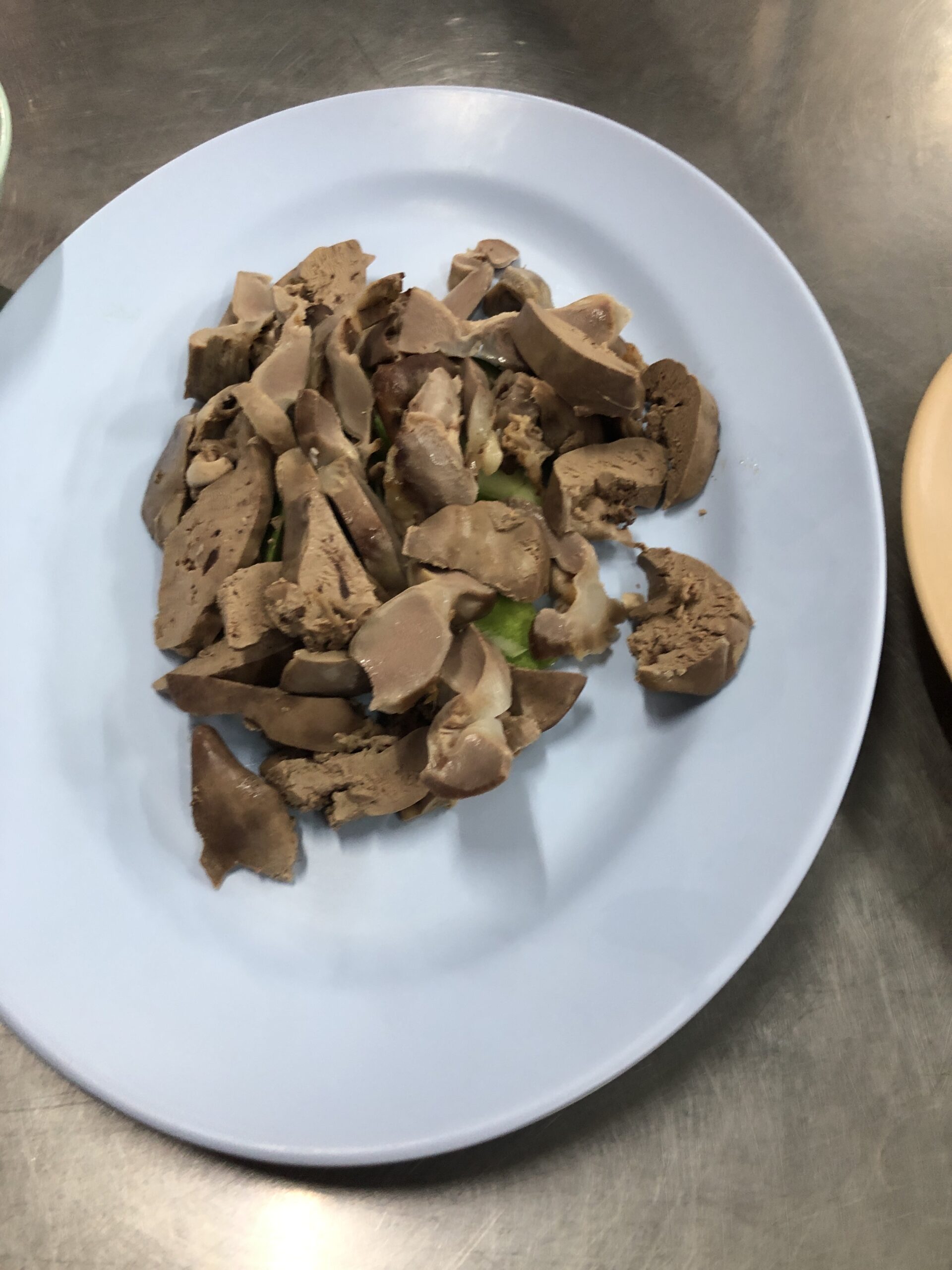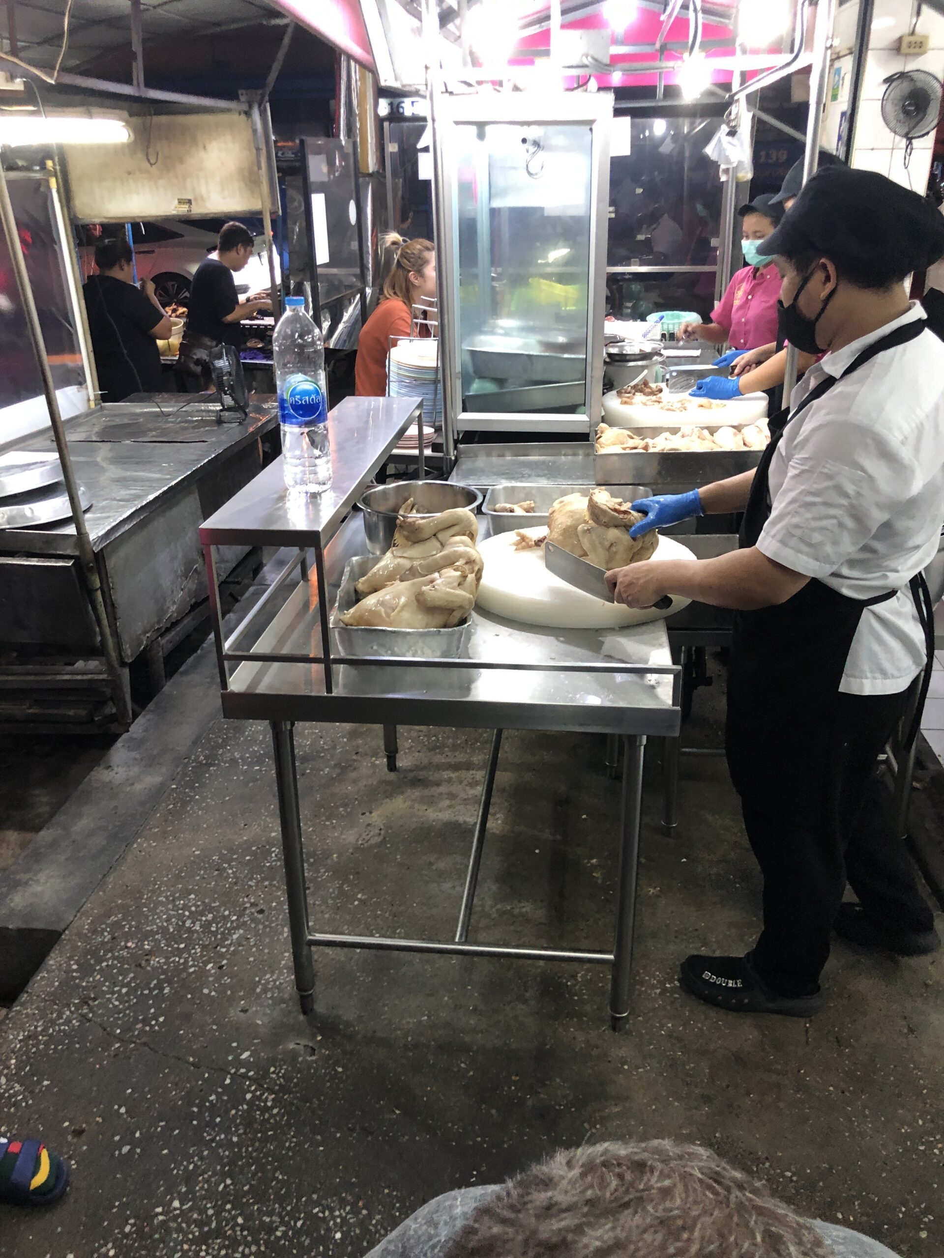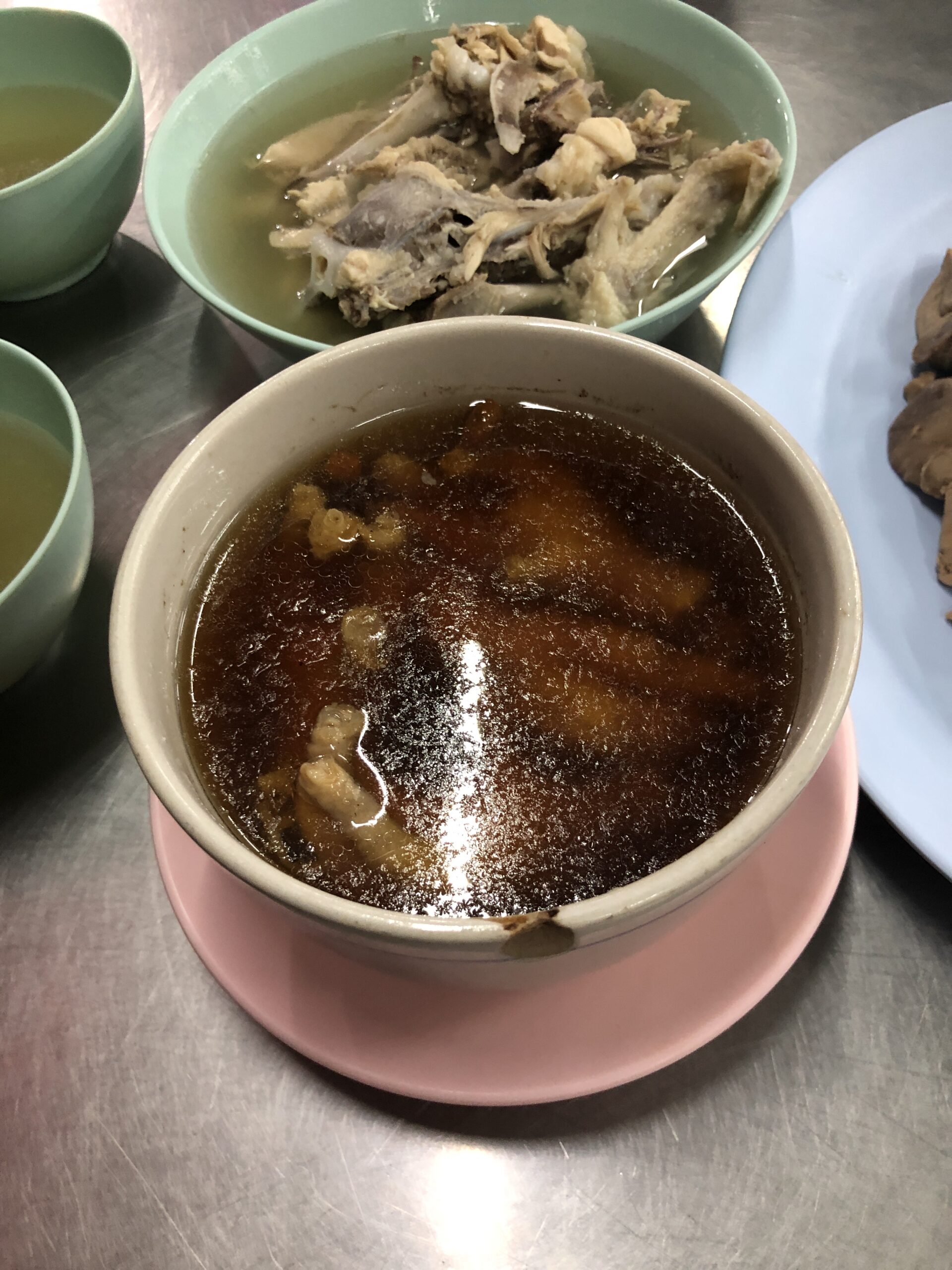 The ‘Go-Ang’ was also a recommendation from the Michelin app, and it’s close to Central World (which we only noticed on the way back 🙈). They basically only serve chicken, which is then charged at market price. Half a chicken costs the same as the rest of the meal 😳. At first, we didn’t order the chicken at all, but each ordered a soup (one with chicken bones and one with chicken feet). We also had giblets, blood cakes, and rice. Since we only got one portion of giblets and were feeling a bit hungry mid-way through, we ordered another half a chicken. The chicken was boiled and actually a bit bland, but it was served with a kind of huasin sauce. All in all, it was quite good, but probably not a repeat. On the way back, however, we saw a few other interesting restaurants 😉