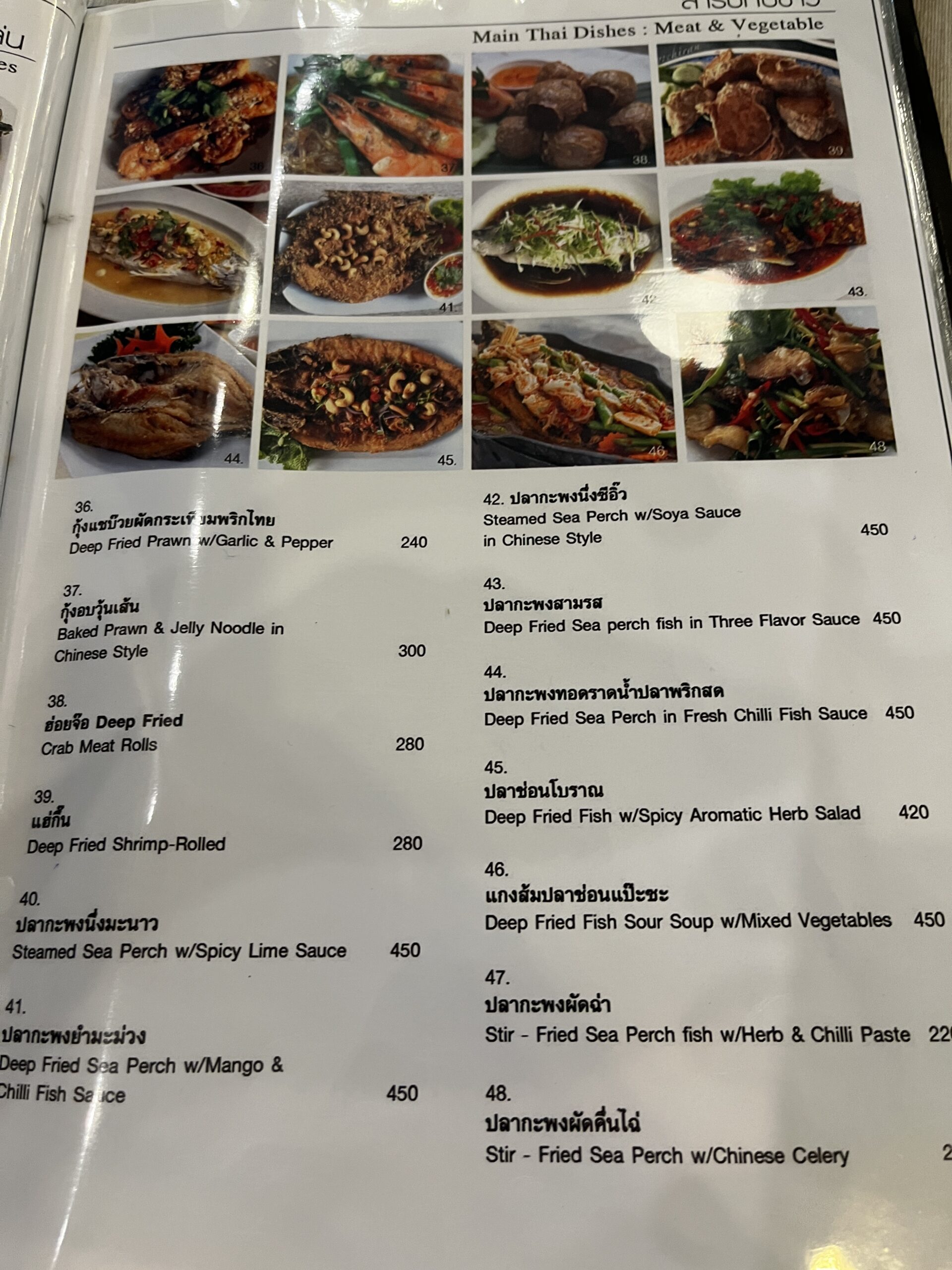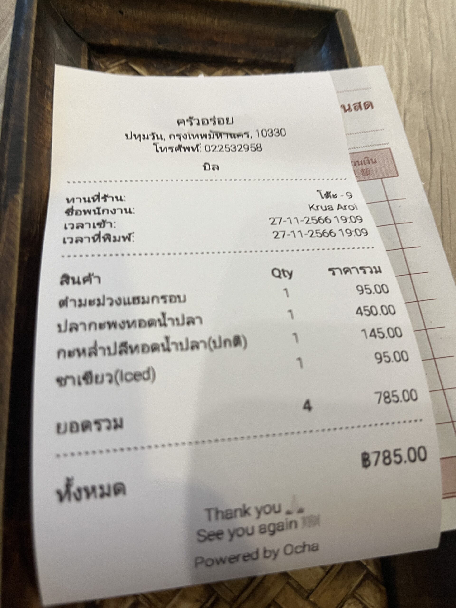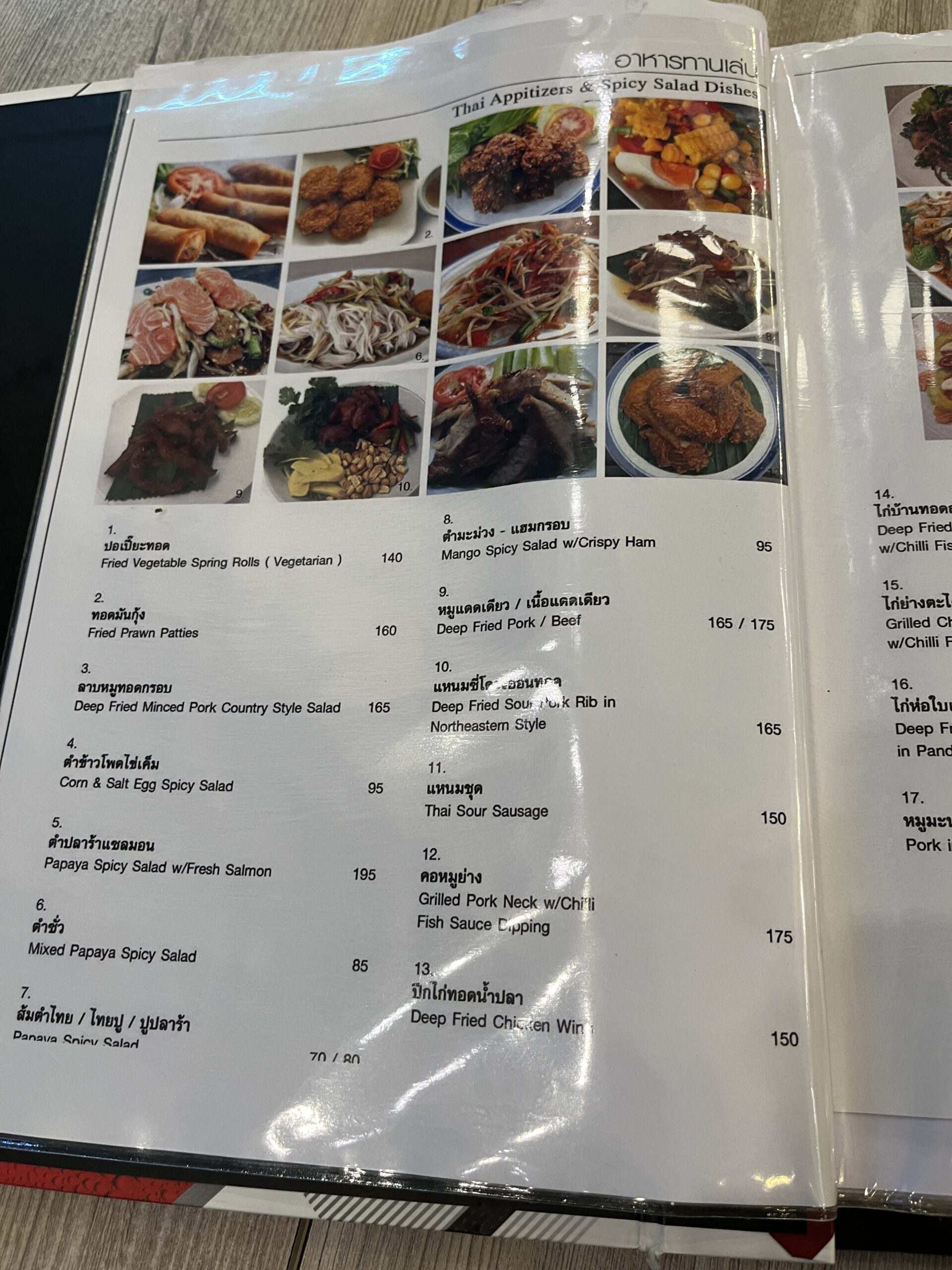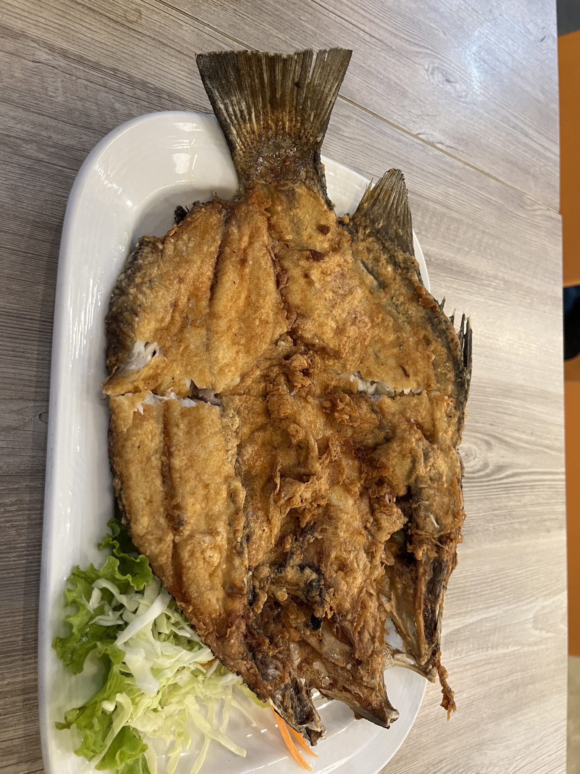 Krua A-Roi is once again authentic Thai and is somewhat tucked away near Central World. But not so hidden that other farangs would have discovered it. I ordered the deep-fried sea bass, a spicy mango salad, and cabbage with fish sauce. The fish was, unlike usual, coated in flour before being fried. This may not have made it quite as crispy, but it was also cooked for a shorter time and was therefore very juicy (at some other places it is fried to death). It came with a delicious chili sauce. The mango salad didn’t look that spicy, but it was also very hot (they could have done without the ham either). Then there was the cabbage. It was actually super simple with fish sauce, whole garlic, and some fried stuff on top. It was incredibly tasty; we definitely lack variety ;). All in all, very, very tasty and definitely worth another visit.