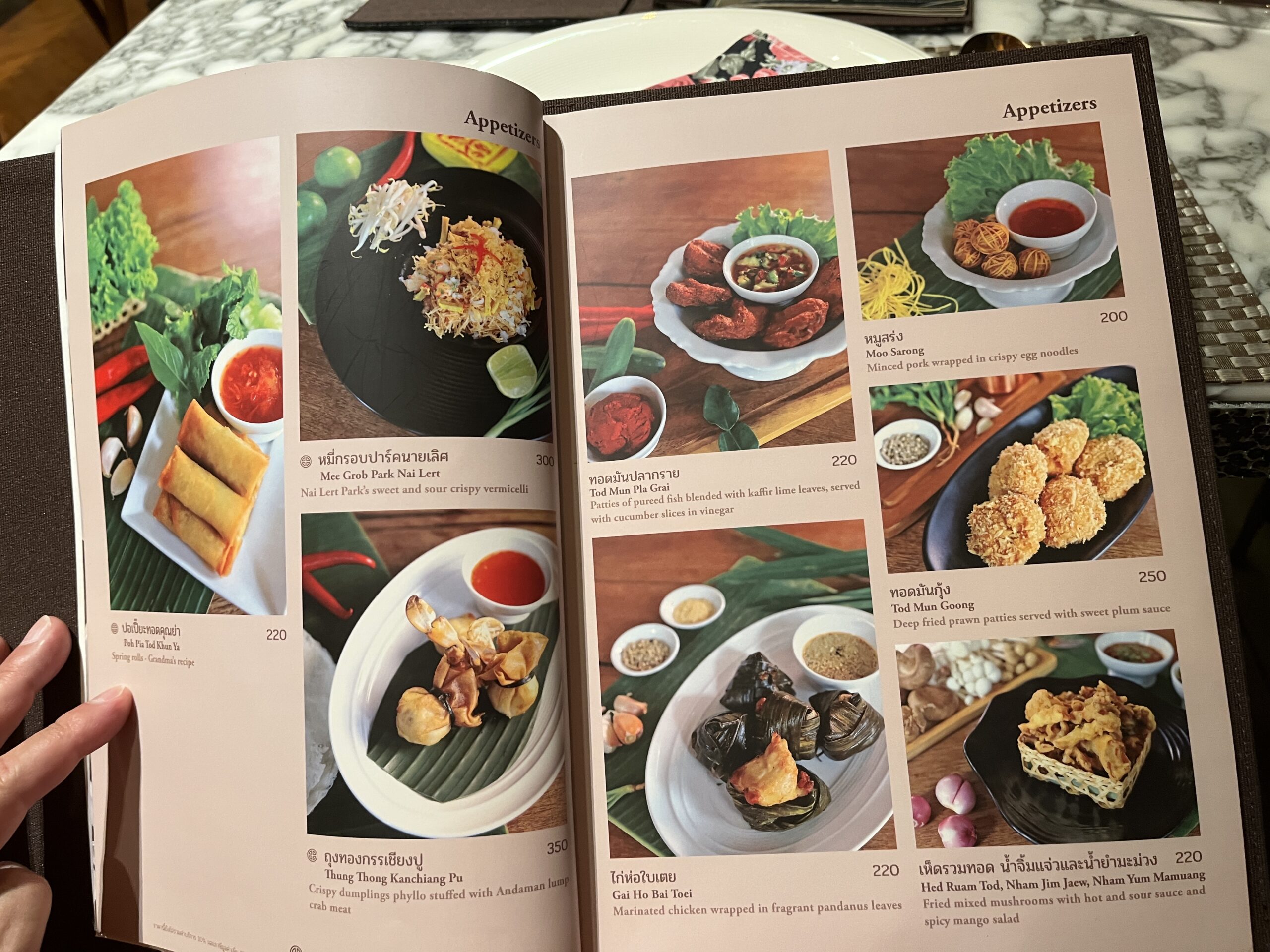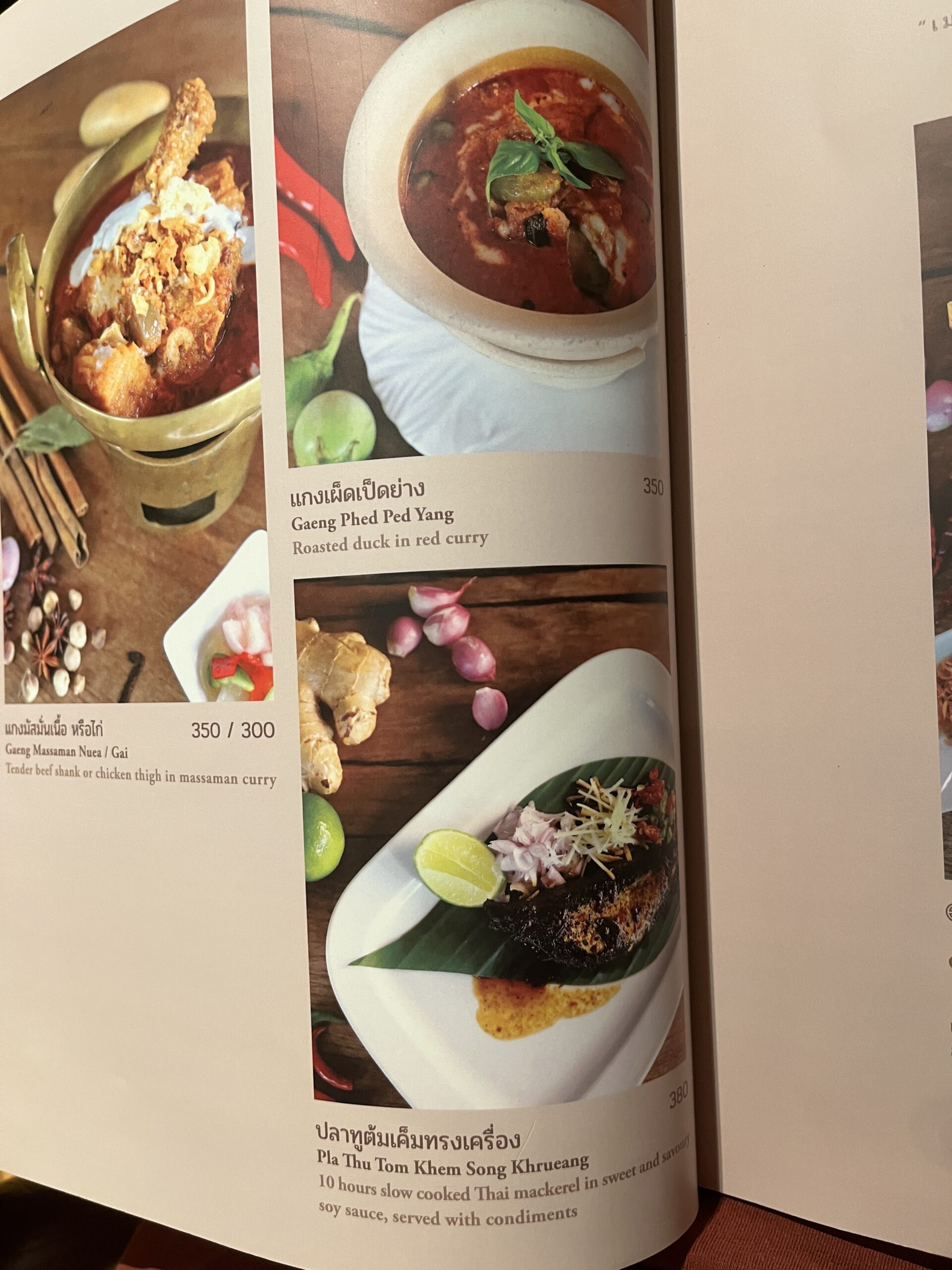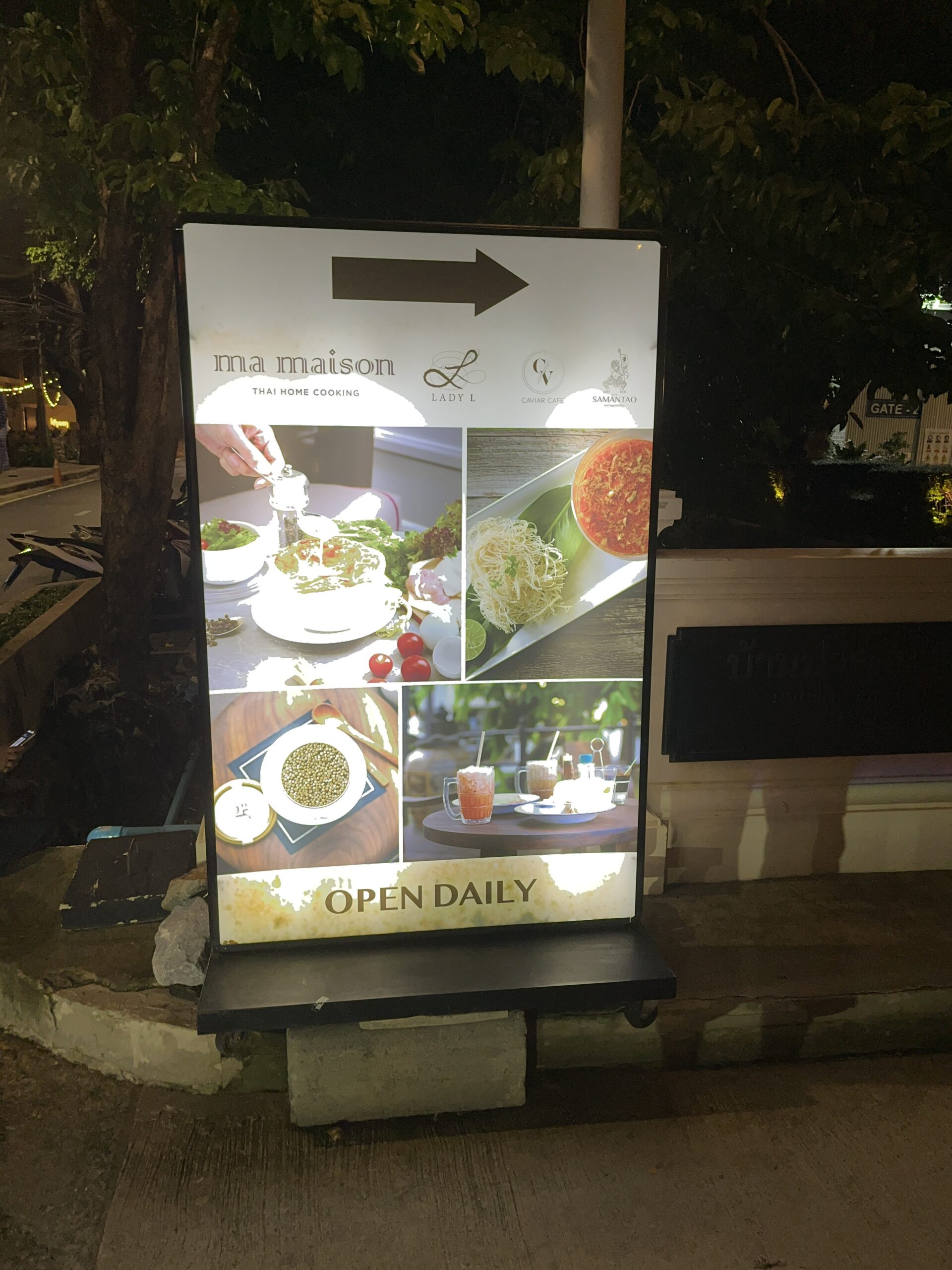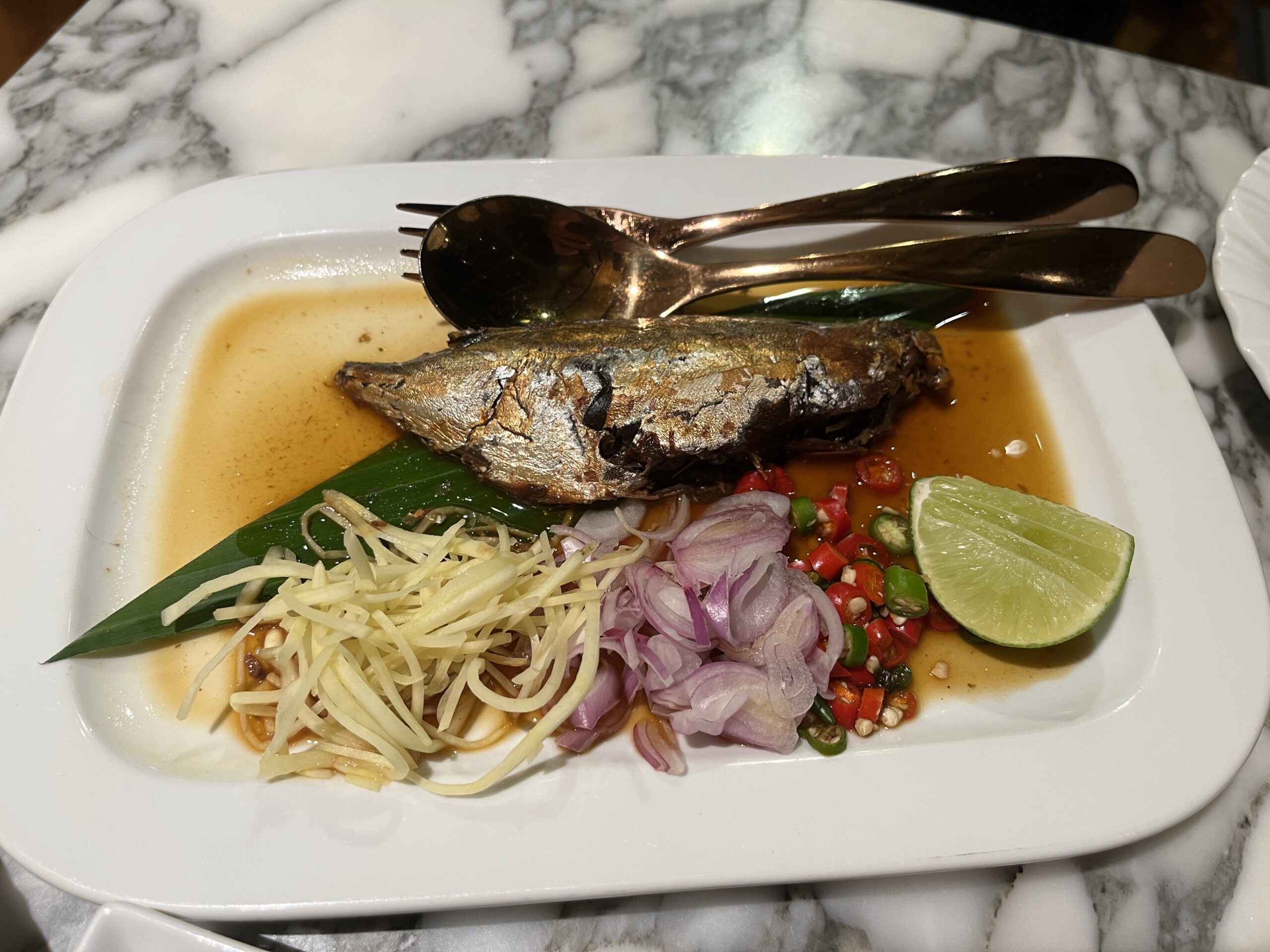 Ma Maison is located behind the Central Embassy in Nai Lert Park. It’s the middle of the three restaurants there (there’s also a cooking school there). Ma Maison is very stylishly decorated and has an outdoor area directly overlooking the park. The only downside, as is often the case, is the low air conditioning 🥶. I ordered fried mushrooms as a starter, followed by a banana sprout salad with shrimp and another Thai mackerel, and a tamarind with honey to drink. The drink wasn’t as sweet as I expected and was slightly sour, delicious and refreshing. The mushrooms were also good, and the three accompanying sauces went well with it (from sweet to spicy). The course actually came first as an appetizer 👍. The salad was super delicious, with a bit of crunch and very spicy 🤭. The mackerel was cooked for 10 hours, and you could eat the bones (I just left out the middle bone). It tasted pretty good, but I felt like the rice was missing a bit of sauce; the little bit that was included wasn’t enough (so I added a bit more sauce to the three other sauces). Unfortunately, I was already too full for dessert. All in all, it was very tasty and I’ll definitely order it again!