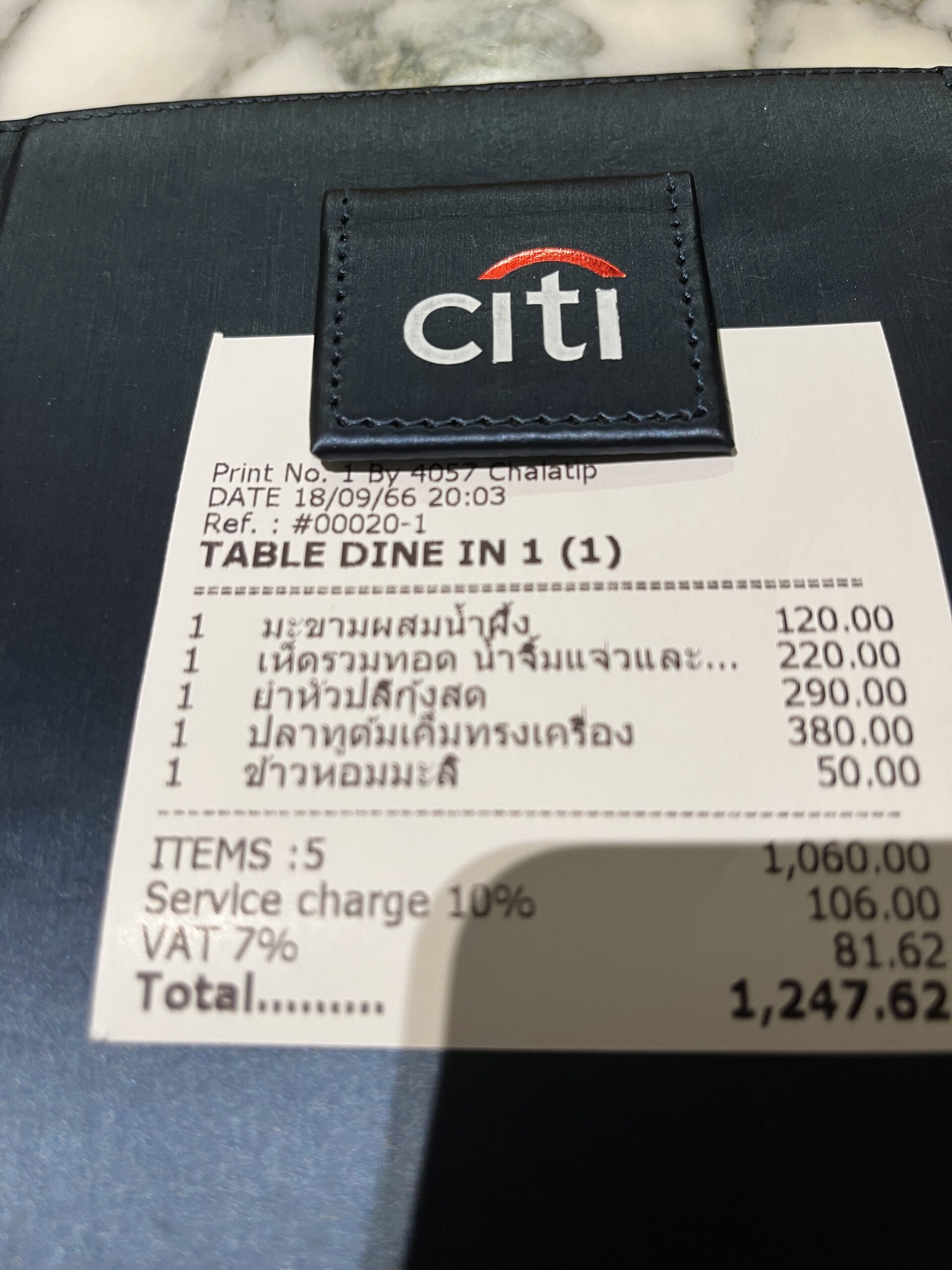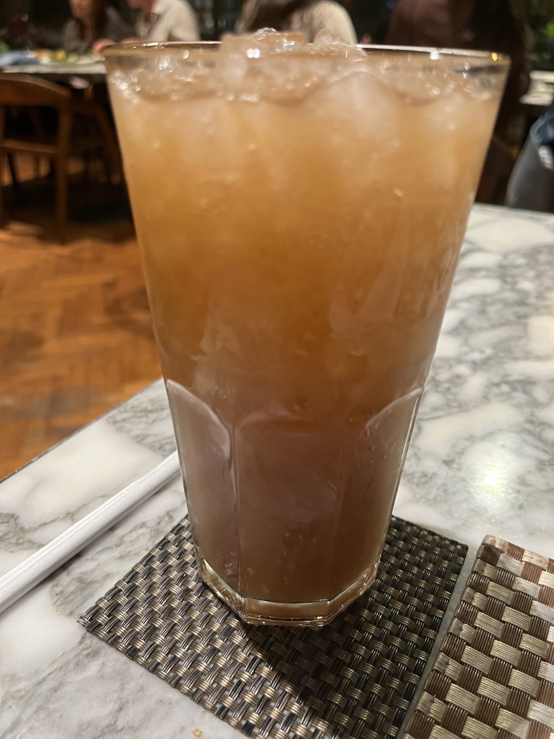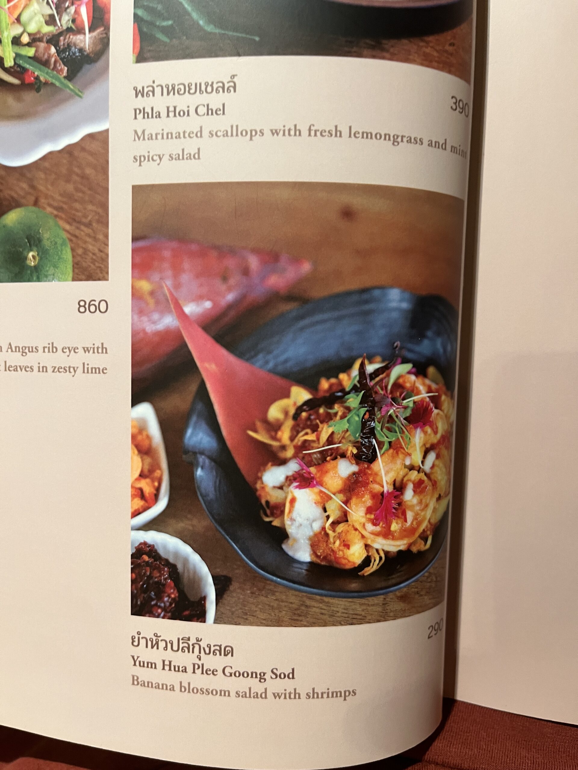 Ma Maison is located behind the Central Embassy in Nai Lert Park. It’s the middle of the three restaurants there (there’s also a cooking school there). Ma Maison is very stylishly decorated and has an outdoor area directly overlooking the park. The only downside, as is often the case, is the low air conditioning 🥶. I ordered fried mushrooms as a starter, followed by a banana sprout salad with shrimp and another Thai mackerel, and a tamarind with honey to drink. The drink wasn’t as sweet as I expected and was slightly sour, delicious and refreshing. The mushrooms were also good, and the three accompanying sauces went well with it (from sweet to spicy). The course actually came first as an appetizer 👍. The salad was super delicious, with a bit of crunch and very spicy 🤭. The mackerel was cooked for 10 hours, and you could eat the bones (I just left out the middle bone). It tasted pretty good, but I felt like the rice was missing a bit of sauce; the little bit that was included wasn’t enough (so I added a bit more sauce to the three other sauces). Unfortunately, I was already too full for dessert. All in all, it was very tasty and I’ll definitely order it again!