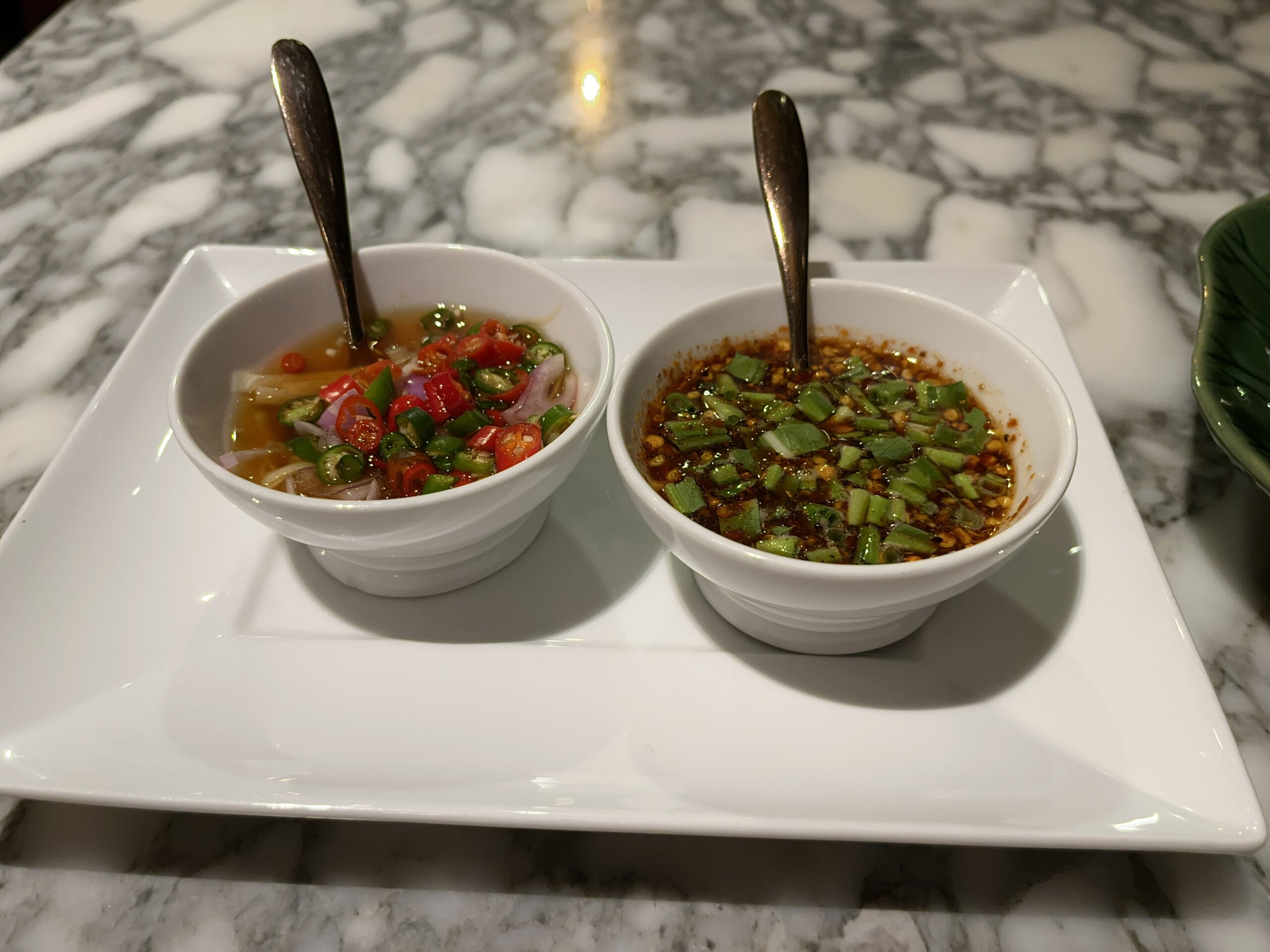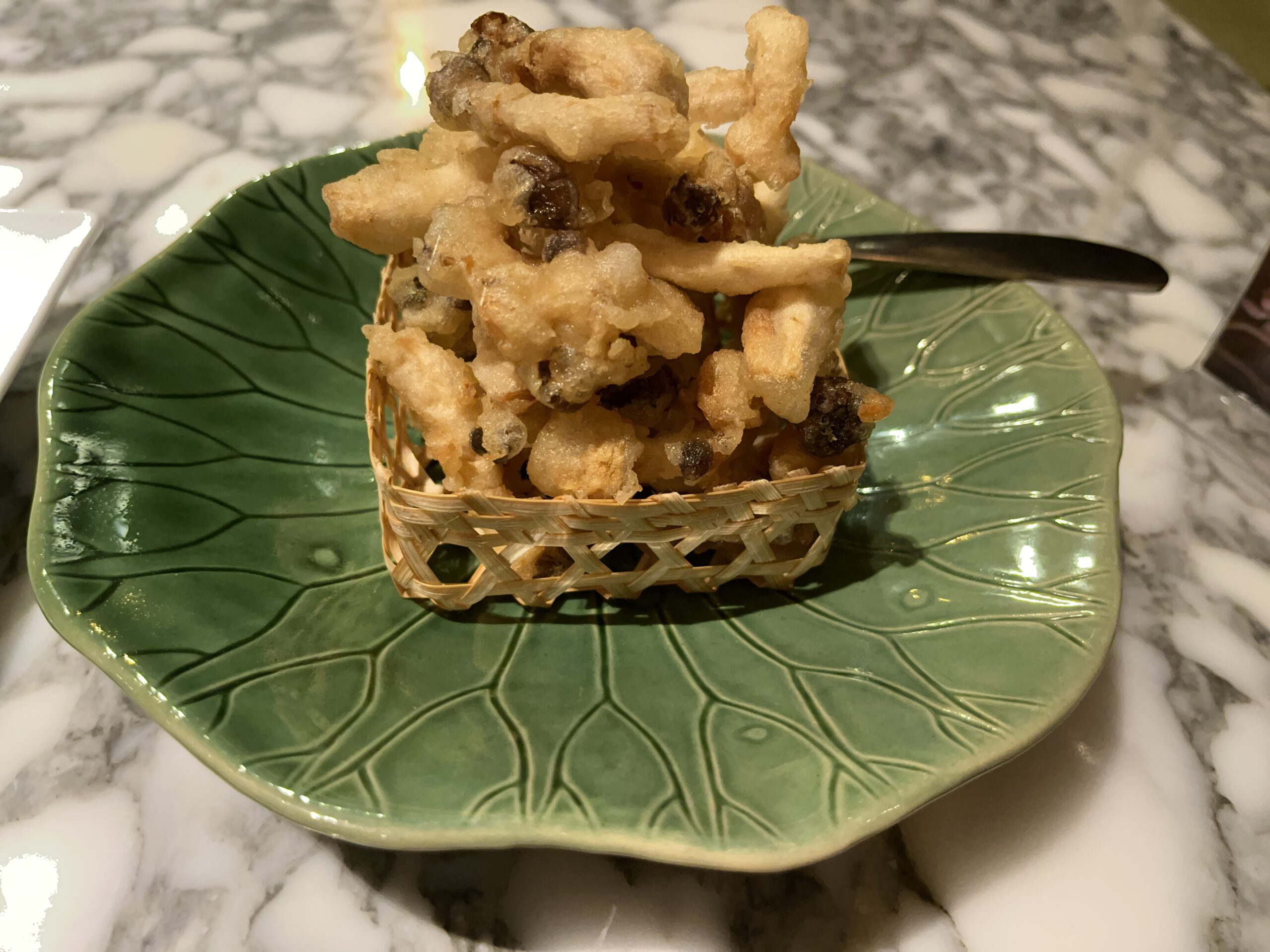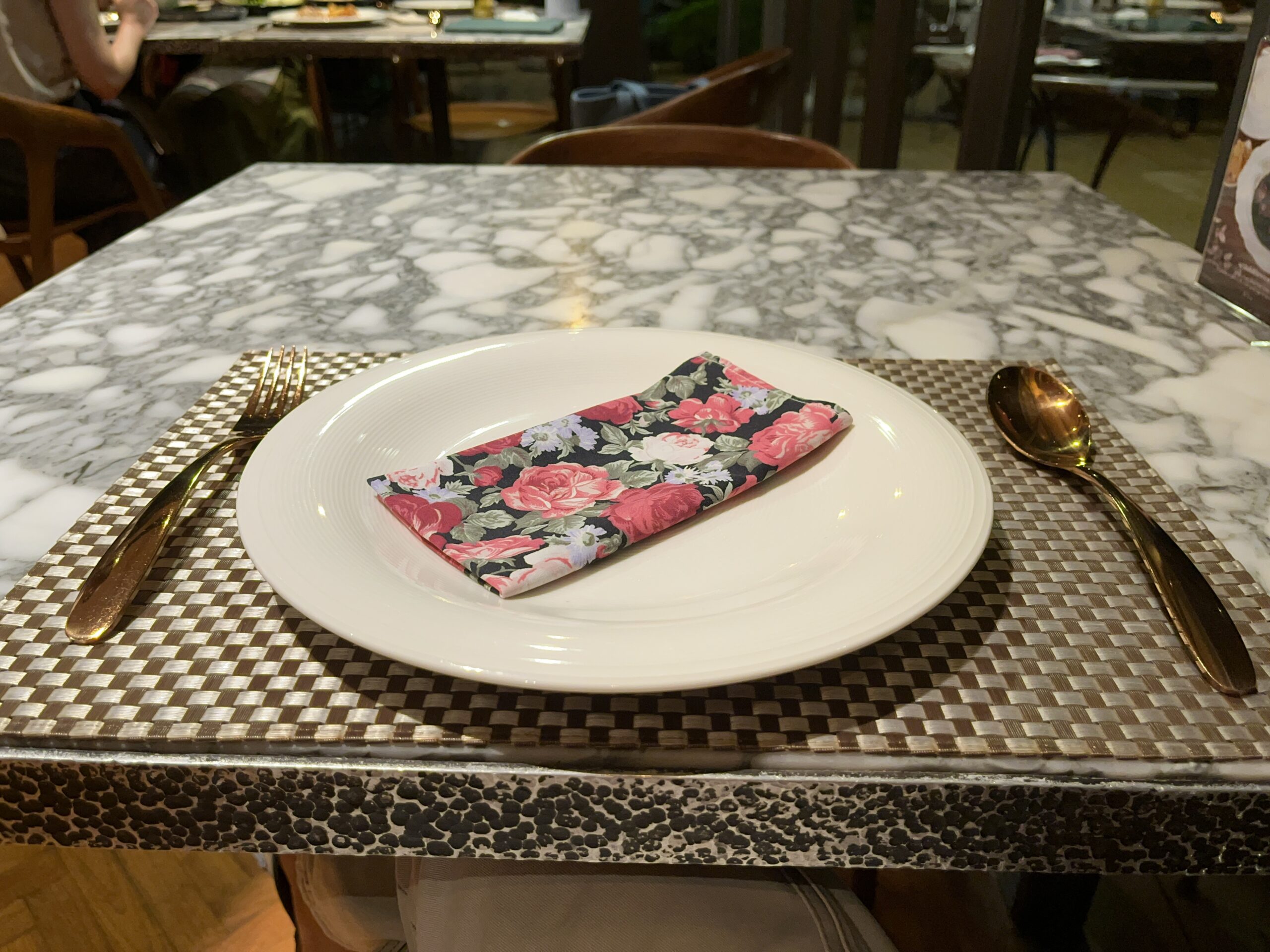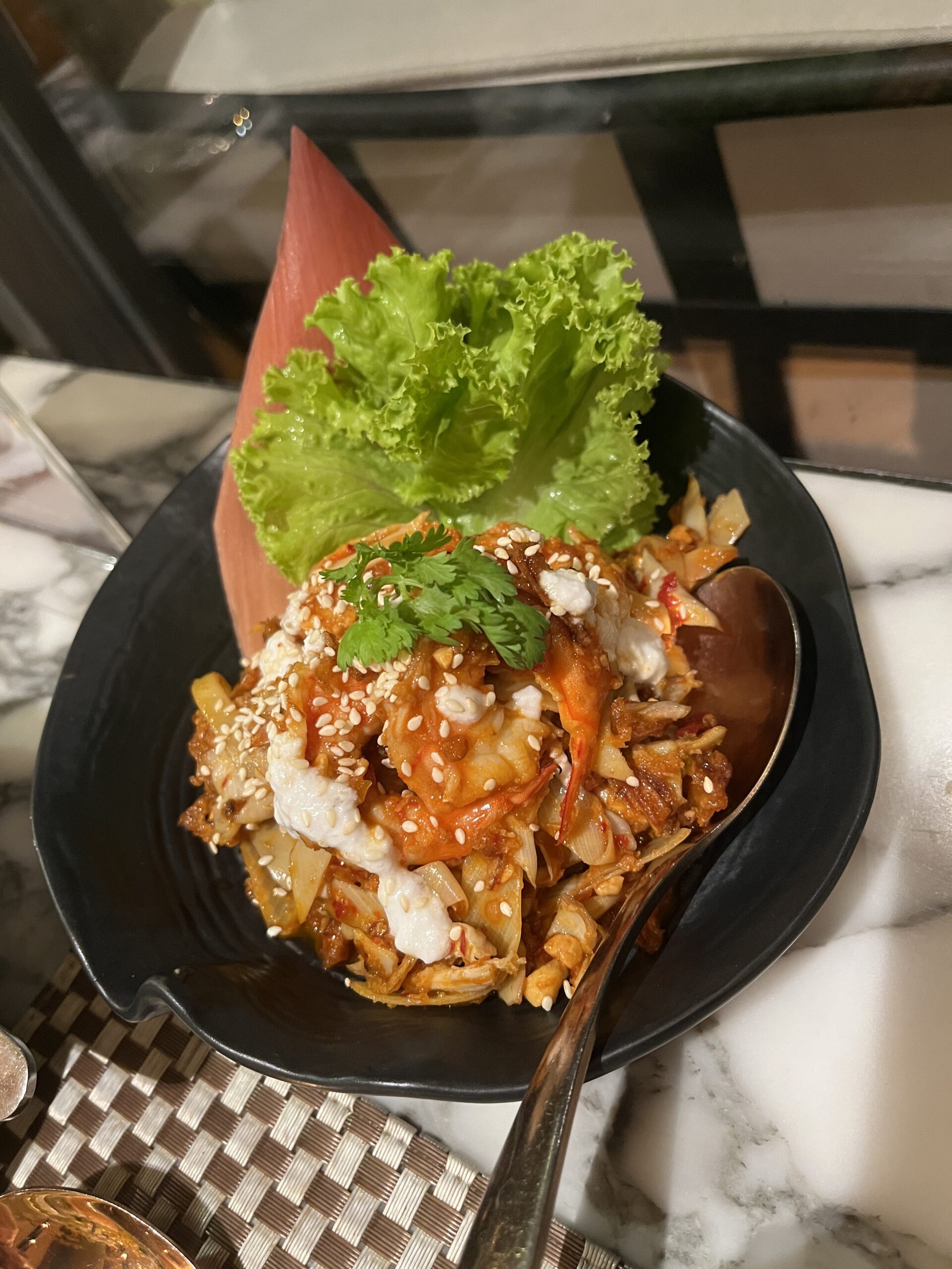 Ma Maison is located behind the Central Embassy in Nai Lert Park. It’s the middle of the three restaurants there (there’s also a cooking school there). Ma Maison is very stylishly decorated and has an outdoor area directly overlooking the park. The only downside, as is often the case, is the low air conditioning 🥶. I ordered fried mushrooms as a starter, followed by a banana sprout salad with shrimp and another Thai mackerel, and a tamarind with honey to drink. The drink wasn’t as sweet as I expected and was slightly sour, delicious and refreshing. The mushrooms were also good, and the three accompanying sauces went well with it (from sweet to spicy). The course actually came first as an appetizer 👍. The salad was super delicious, with a bit of crunch and very spicy 🤭. The mackerel was cooked for 10 hours, and you could eat the bones (I just left out the middle bone). It tasted pretty good, but I felt like the rice was missing a bit of sauce; the little bit that was included wasn’t enough (so I added a bit more sauce to the three other sauces). Unfortunately, I was already too full for dessert. All in all, it was very tasty and I’ll definitely order it again!