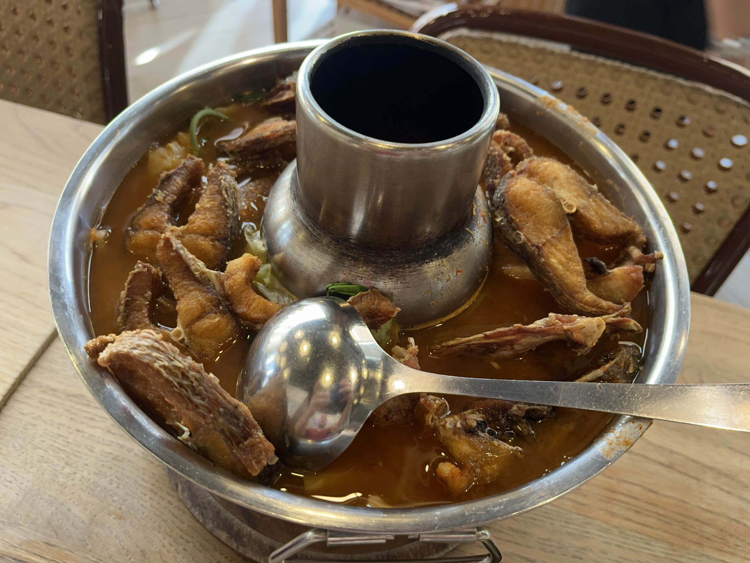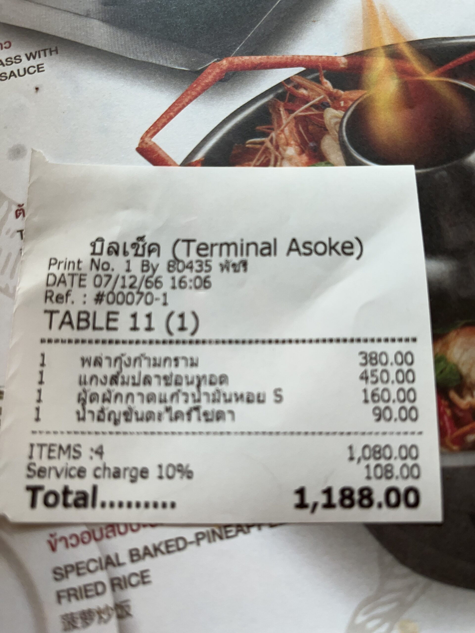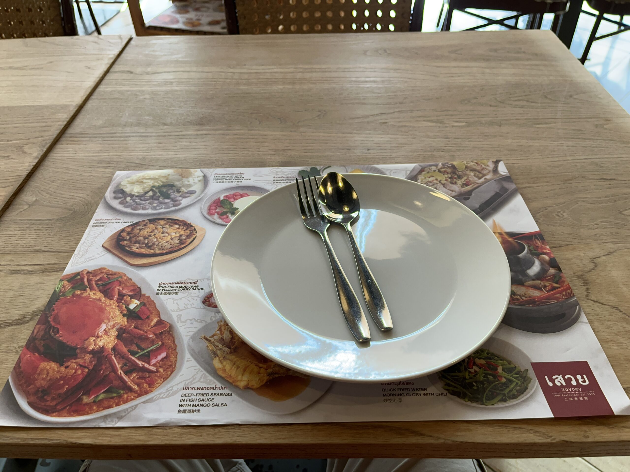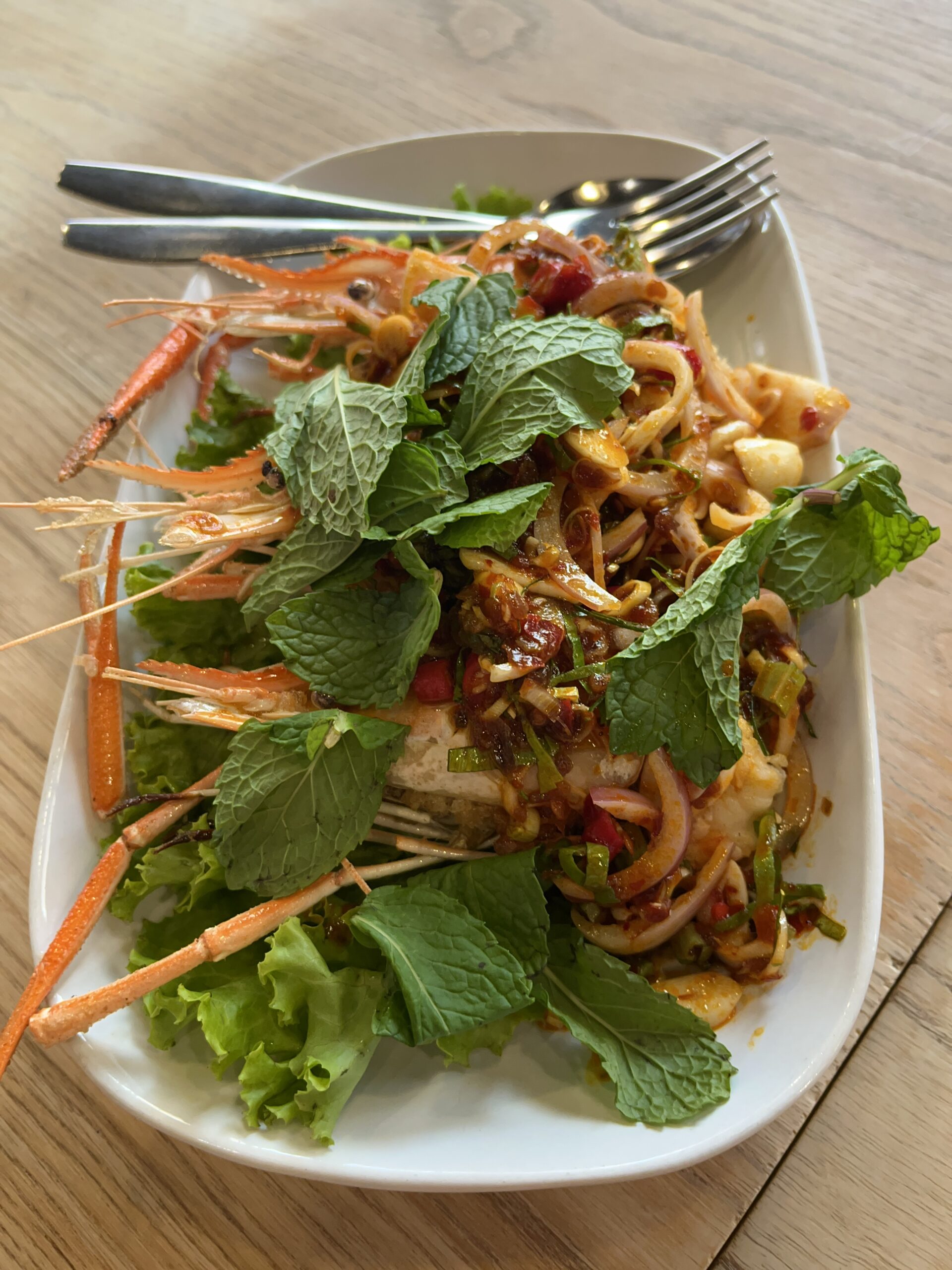 Savoey is located in Terminal 21 Asok. I actually wanted to have Pad Kra Pao, but the place was closed (more on that later). Savoey has four locations in Bangkok, and the menu looked quite promising. I ordered spicy shrimp, snakefish with tamarind, and iceberg lettuce as a vegetable (I actually thought I’d ordered cabbage, but that wasn’t the case). The crispy fish in tamarind broth was delicious. The iceberg lettuce as a vegetable, completely unexpectedly, was also super tasty. The crowning glory, however, were the spicy fried shrimp. Firstly, they were only briefly fried and not dry. The spicy mix around them was absolutely top-notch. Spicy, fresh (mint and Thai grass), sour (tamarind), and then herbs and garlic. Truly delicious Thai food, worth repeating!