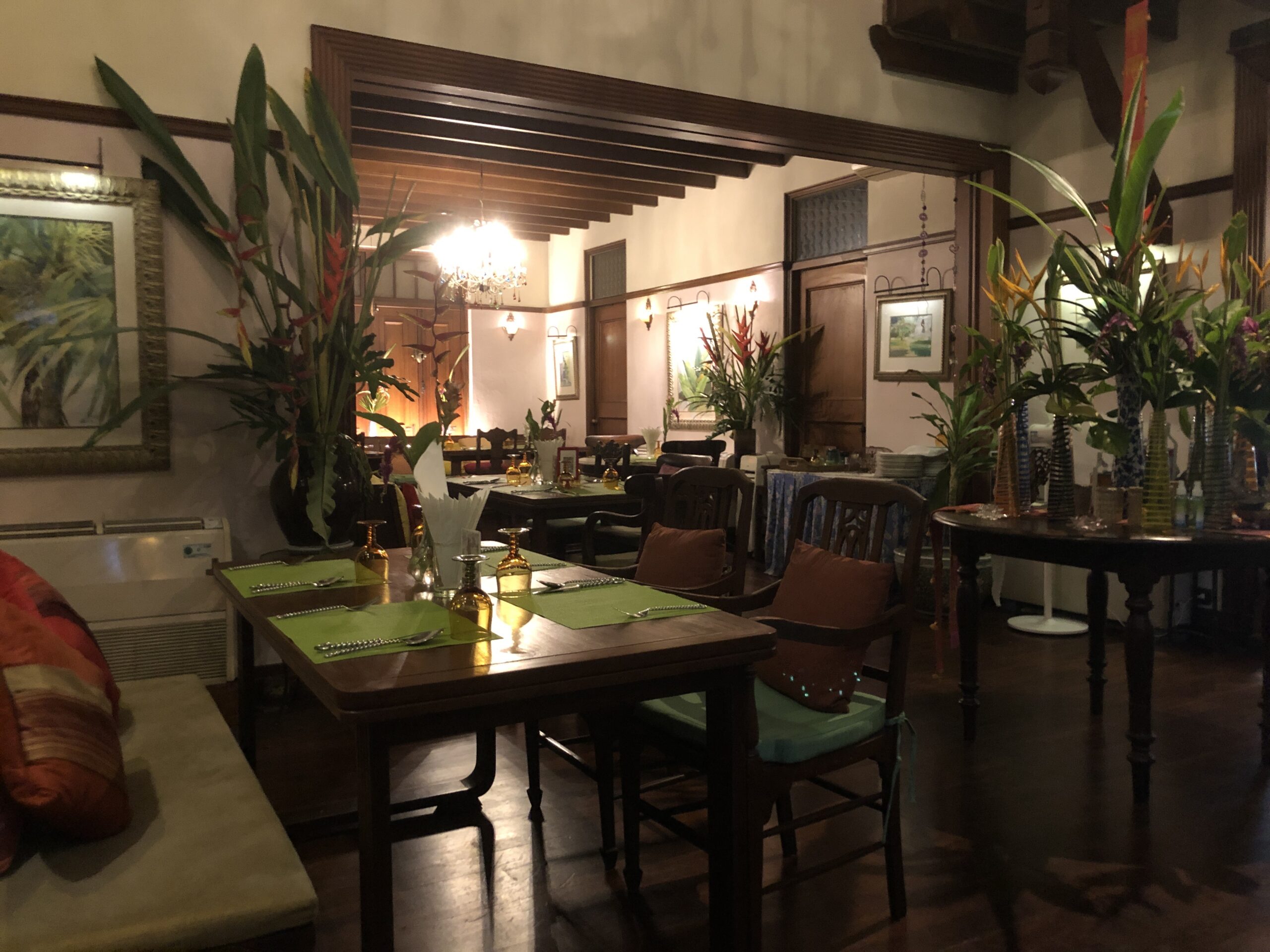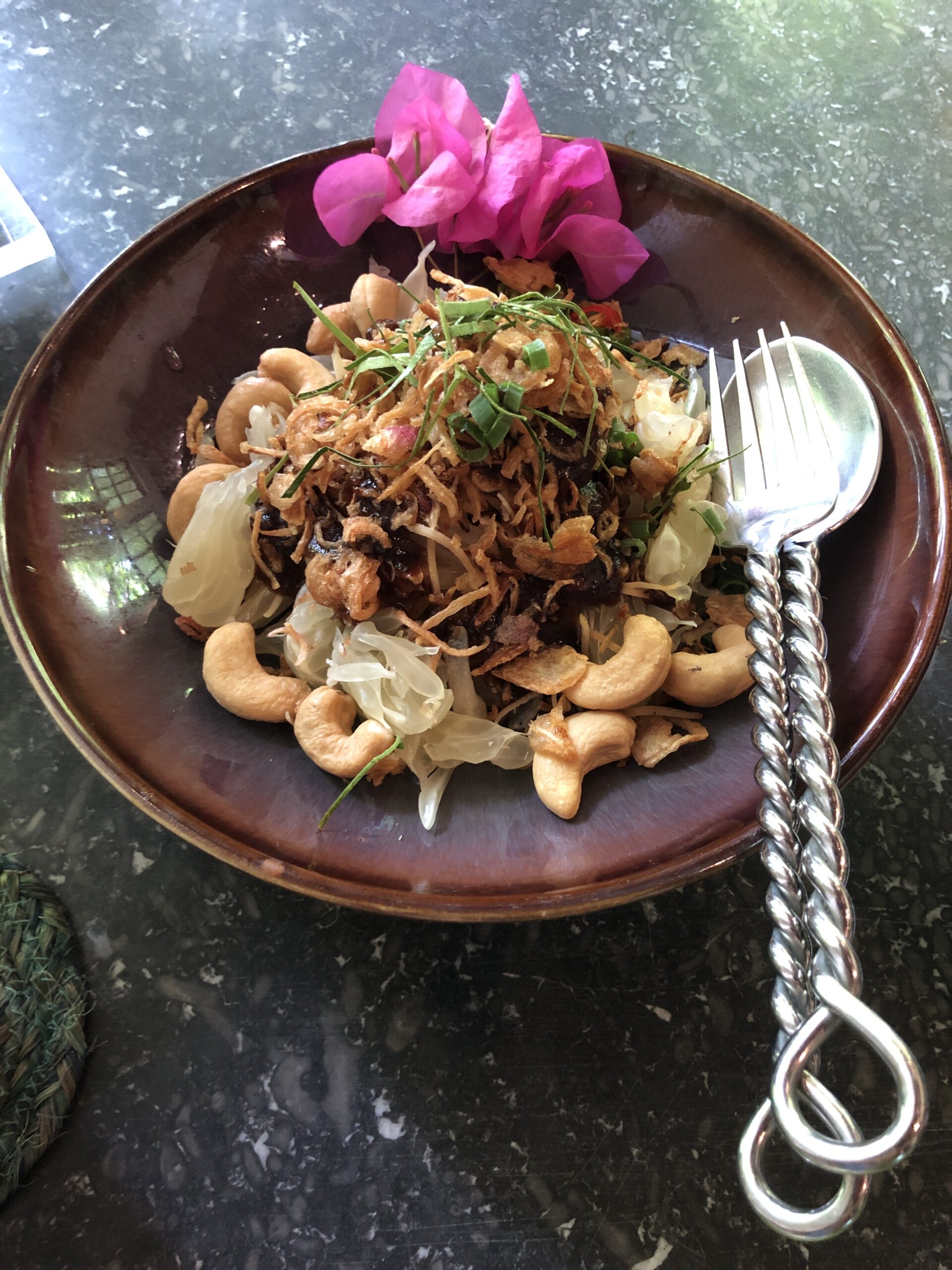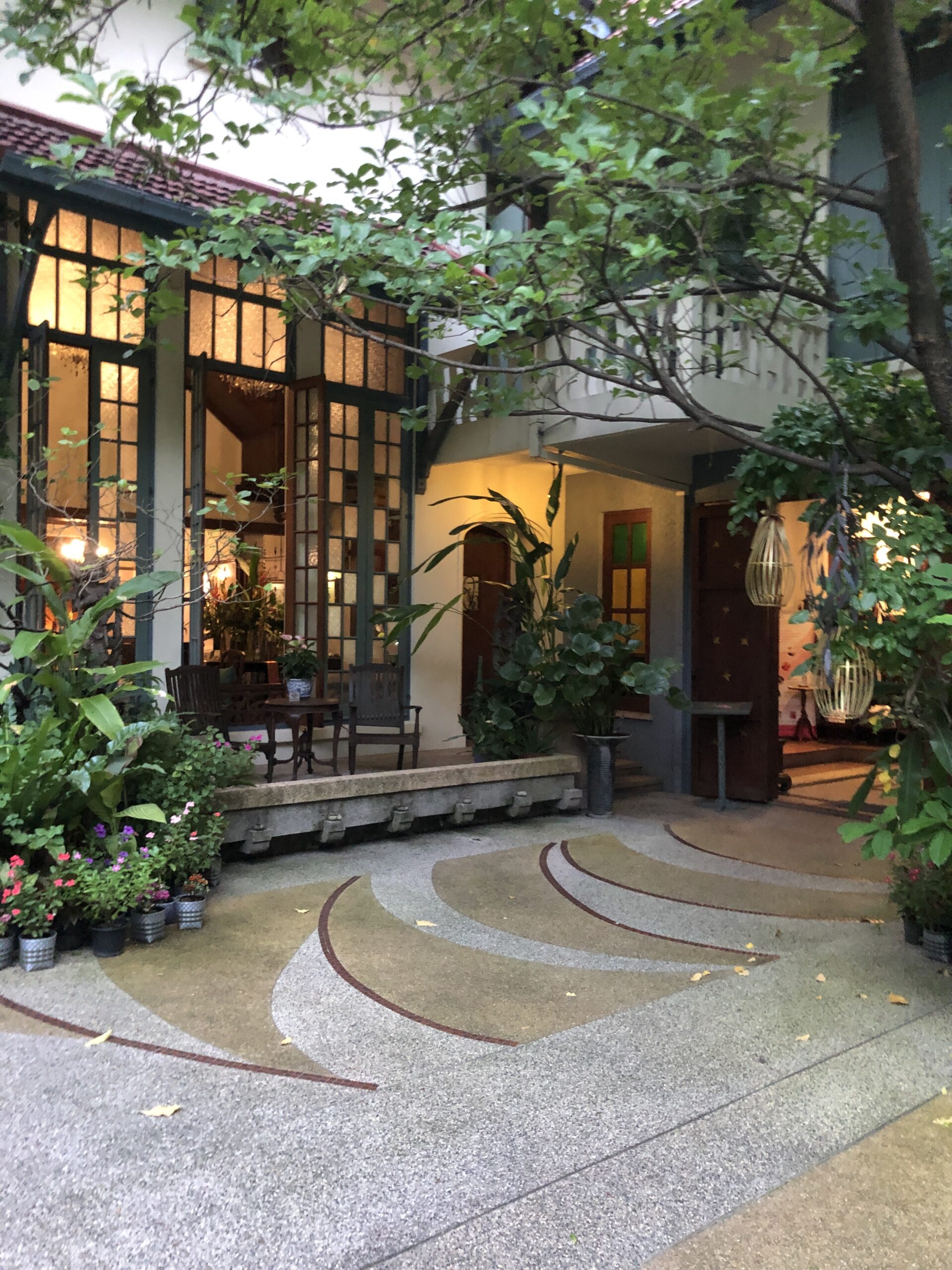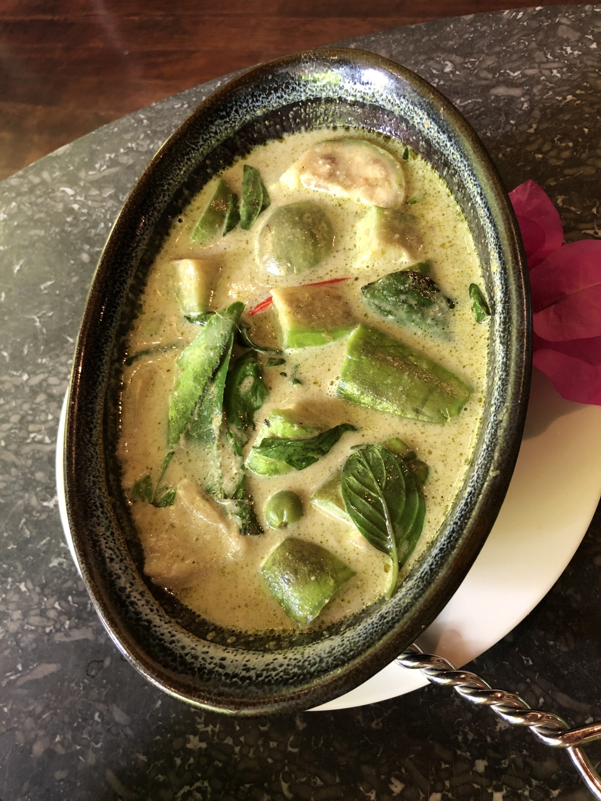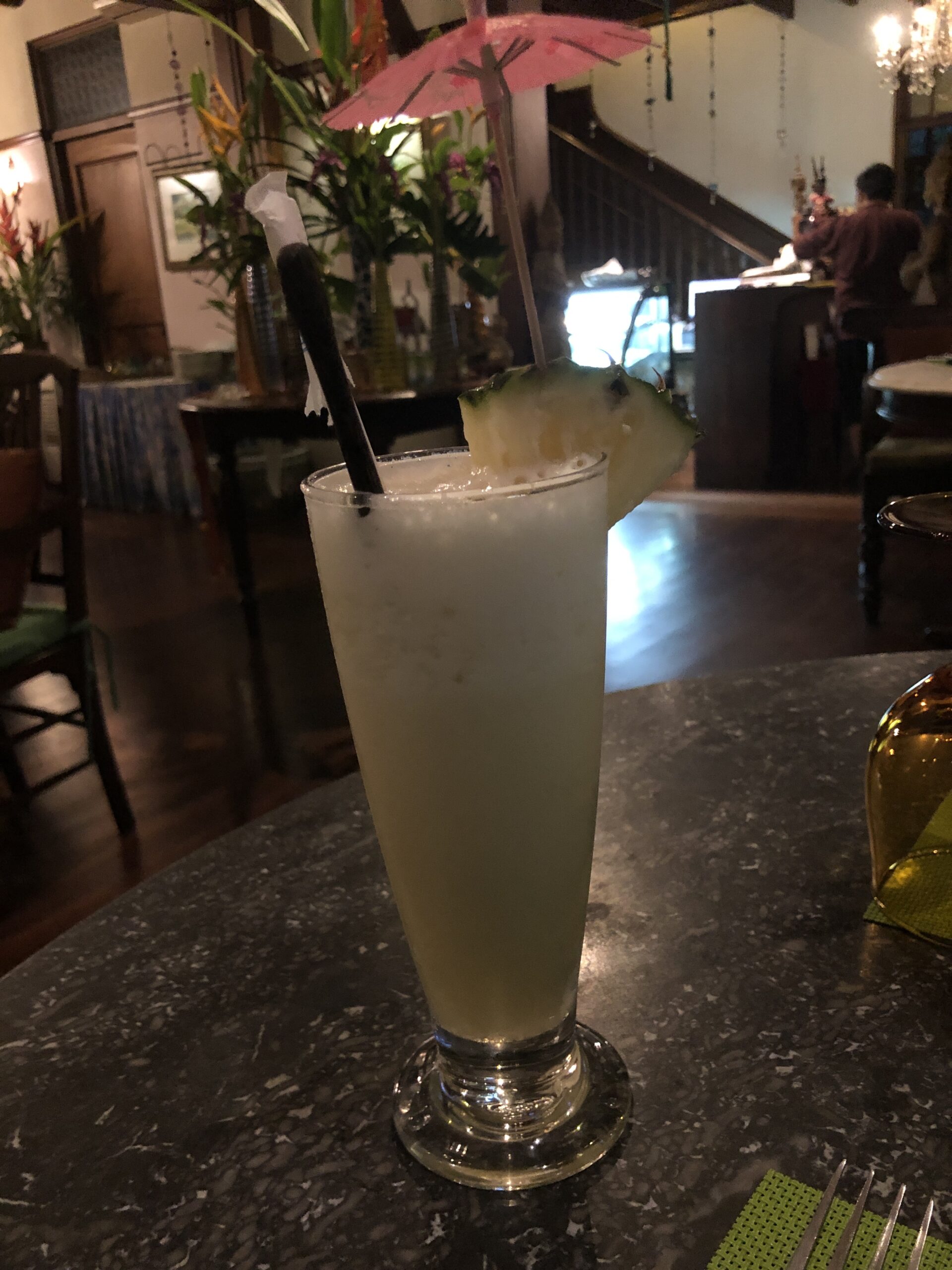 I actually wanted to go to Paste again on my last evening, but the last available slot was at 9 p.m., which was too late for me (and I’m also still battling a cold). Then I remembered Na Aroon; I’ve been here several times before, but it’s unfortunately a bit out of the way. Na Aroon is at the very end of Soi 1 and is very idyllically situated. It’s one of the few restaurants that doesn’t have air conditioning, just a couple of fans. But that evening also revealed its downside: lots of mosquitoes attacking you. Anyway, there was a delicious salad with tamarind sauce (I can’t remember what the green one was) and another Tom Yum Goong (you can never go wrong with that, except maybe in the First Class Lounge on a Thai airline 😀 ). There was also a pineapple ginger smoothie (unfortunately with a bit too little ginger this time).