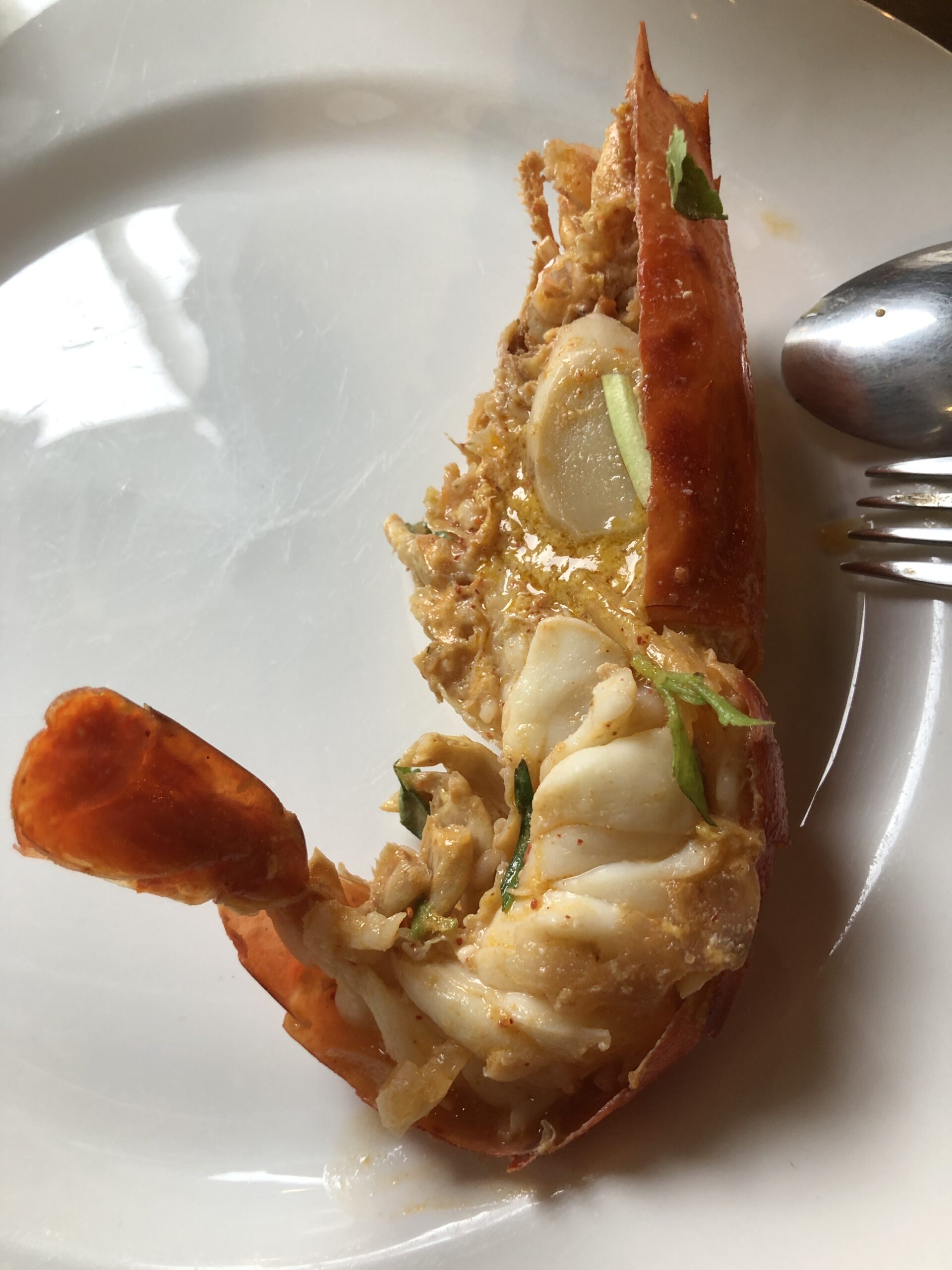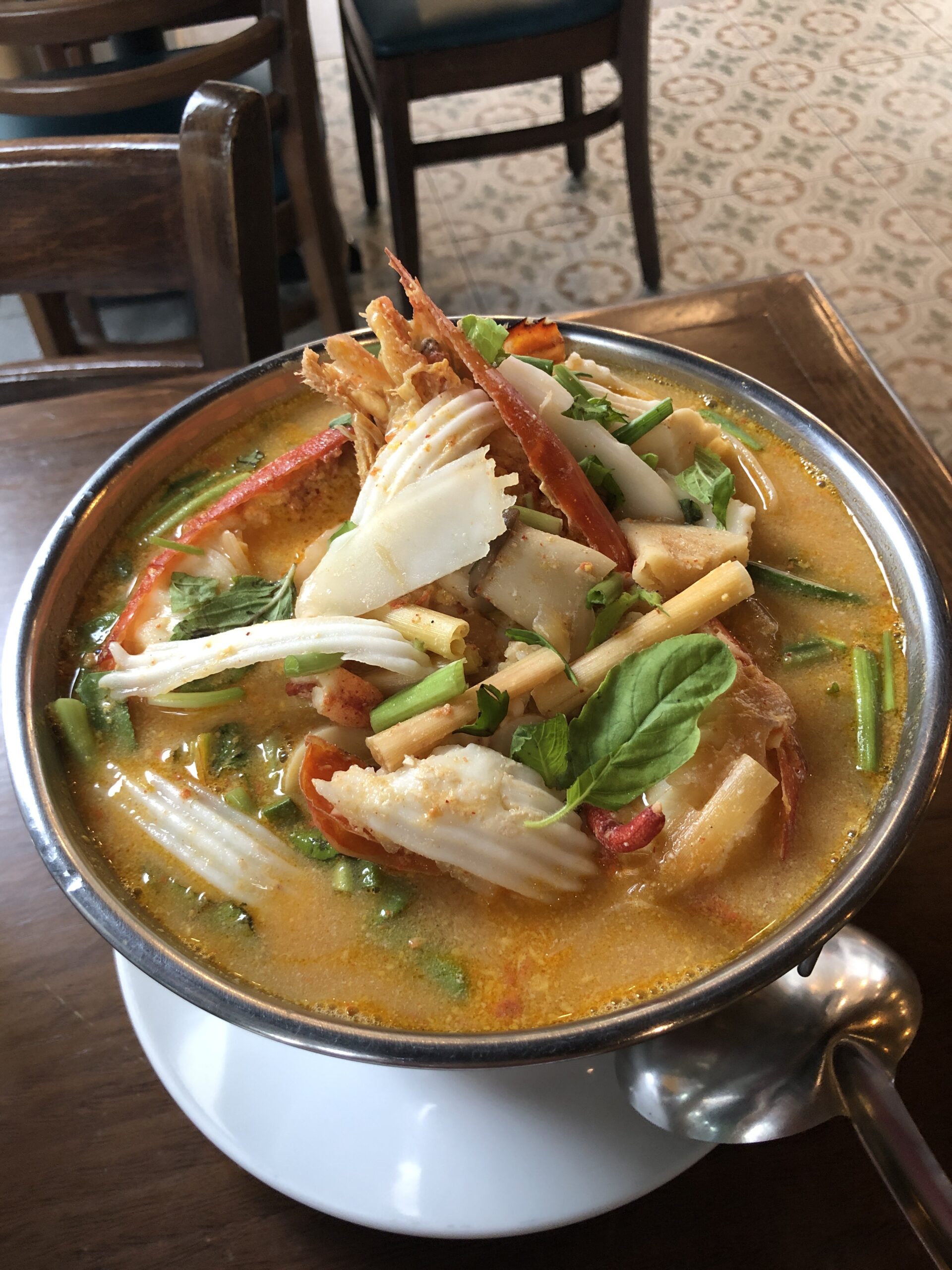 Tamnanthai is difficult to find, as it’s not visible from the street; it’s located behind a tattoo studio. But once you do, the good food makes up for the effort. The waitress (and probably the owner too) always has a few good recommendations ready, which you should follow if you don’t already have something specific in mind. This time I had the deluxe Tom Yum Goong with a large river prawn, which was absolutely delicious. Tom Yum is one of my favorite dishes, and I try it almost everywhere. Here it was with coconut as a garnish. It could have been a bit spicier, but I could have spiced it up a bit ;). The Traft beer was also very good (you can’t really go wrong with Blue Moon). For dessert, there was a small apple fritter.