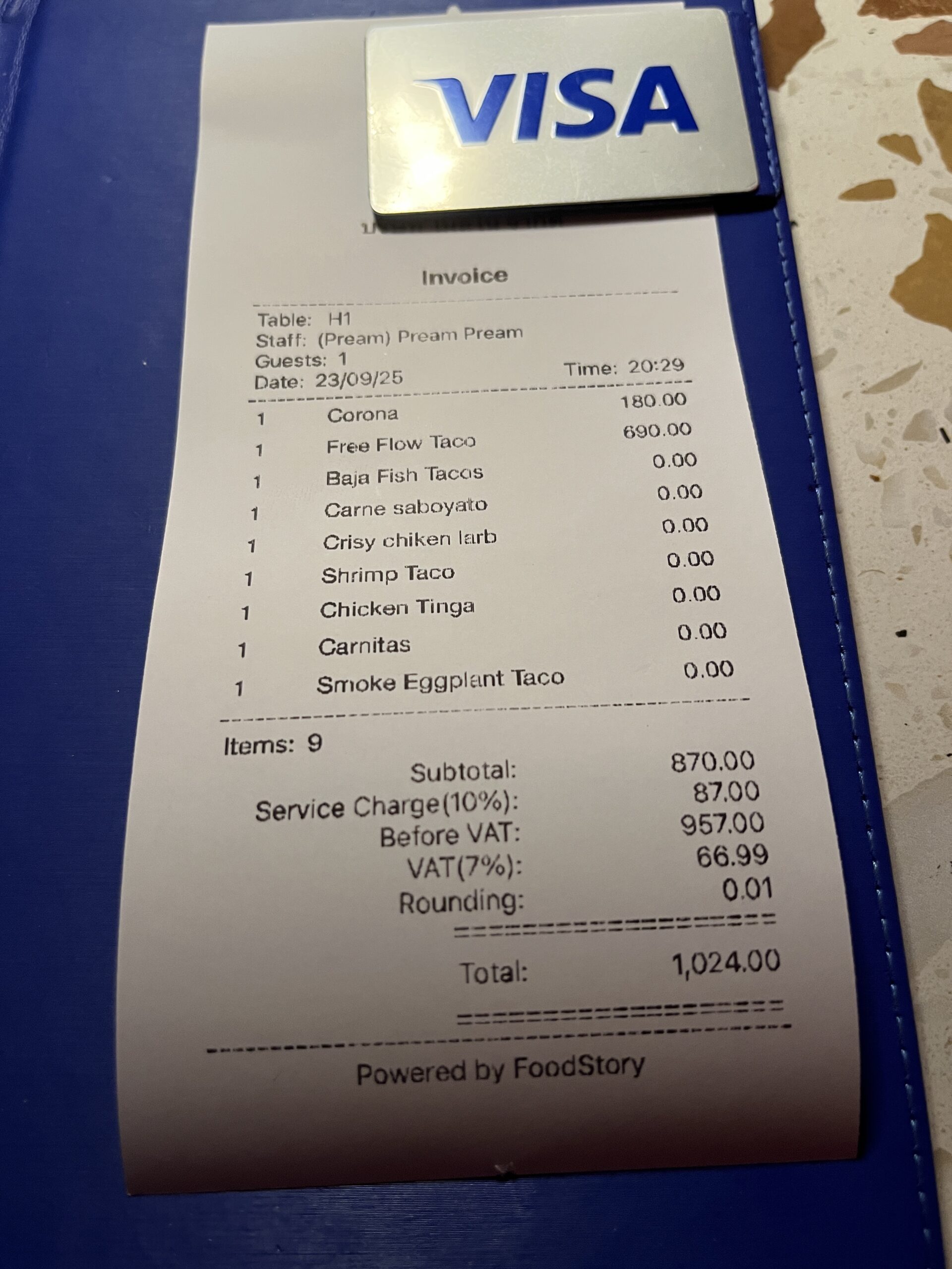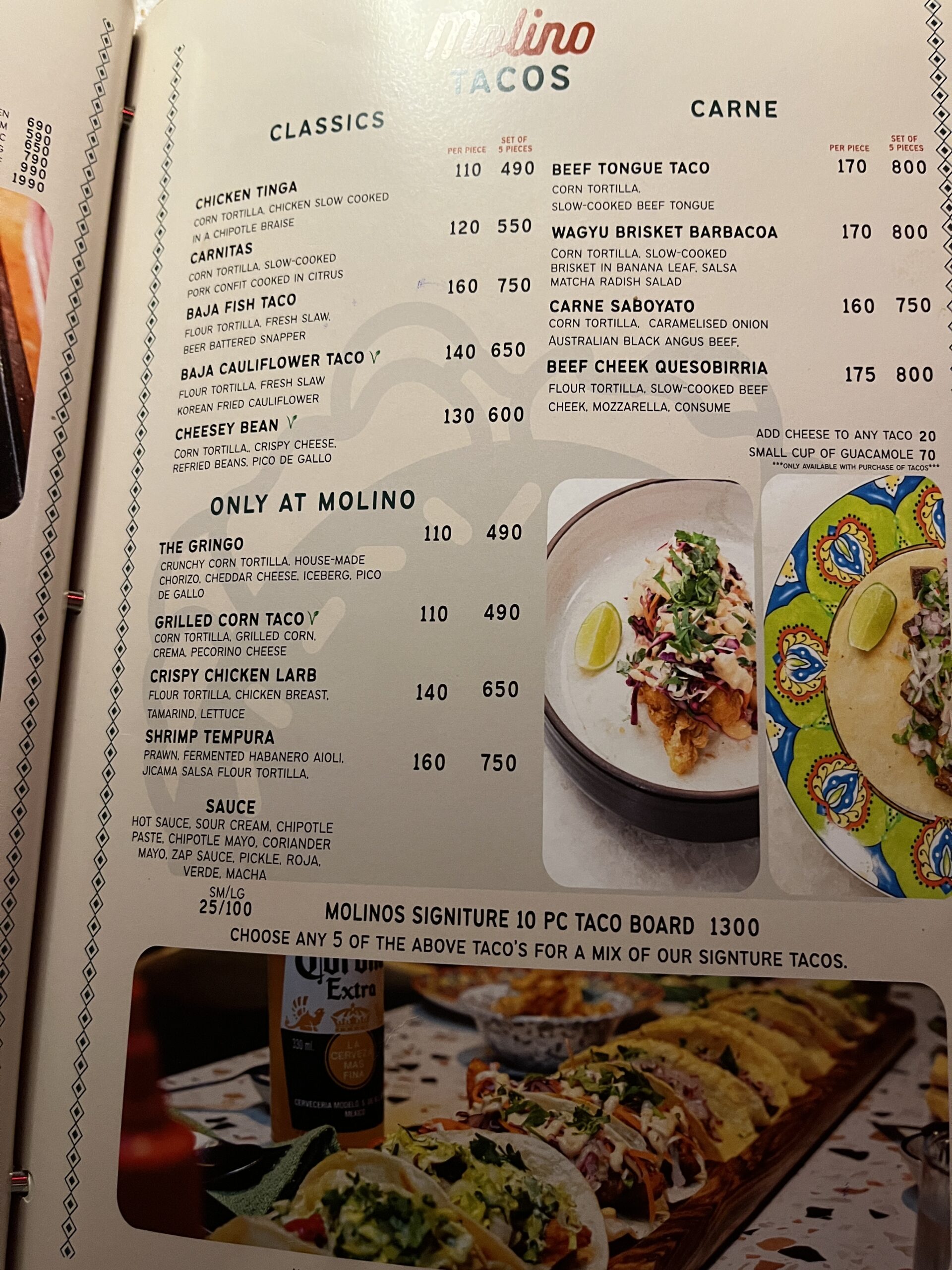 As I have to try everyday something new when I come to BKK I come to Molino (ok and I was a bit lazy). As I was unsure of all the option I took the 690 all you can eat offer. The first round with the recommendations arrived quickly. I wasn’t a big fan of the corn tortillas as they broke quickly and added a heavy stuffing to the stomache. So for the second round I choose more from the flour option (eggplant and shrimp). My personal favorite was the shrimp version. The taste of most are quite good but personally I think it was sometime to much stuffing (hard to eat with hands). Other sides would also help to improve (not so the 3 provided once). Overall no repeat.